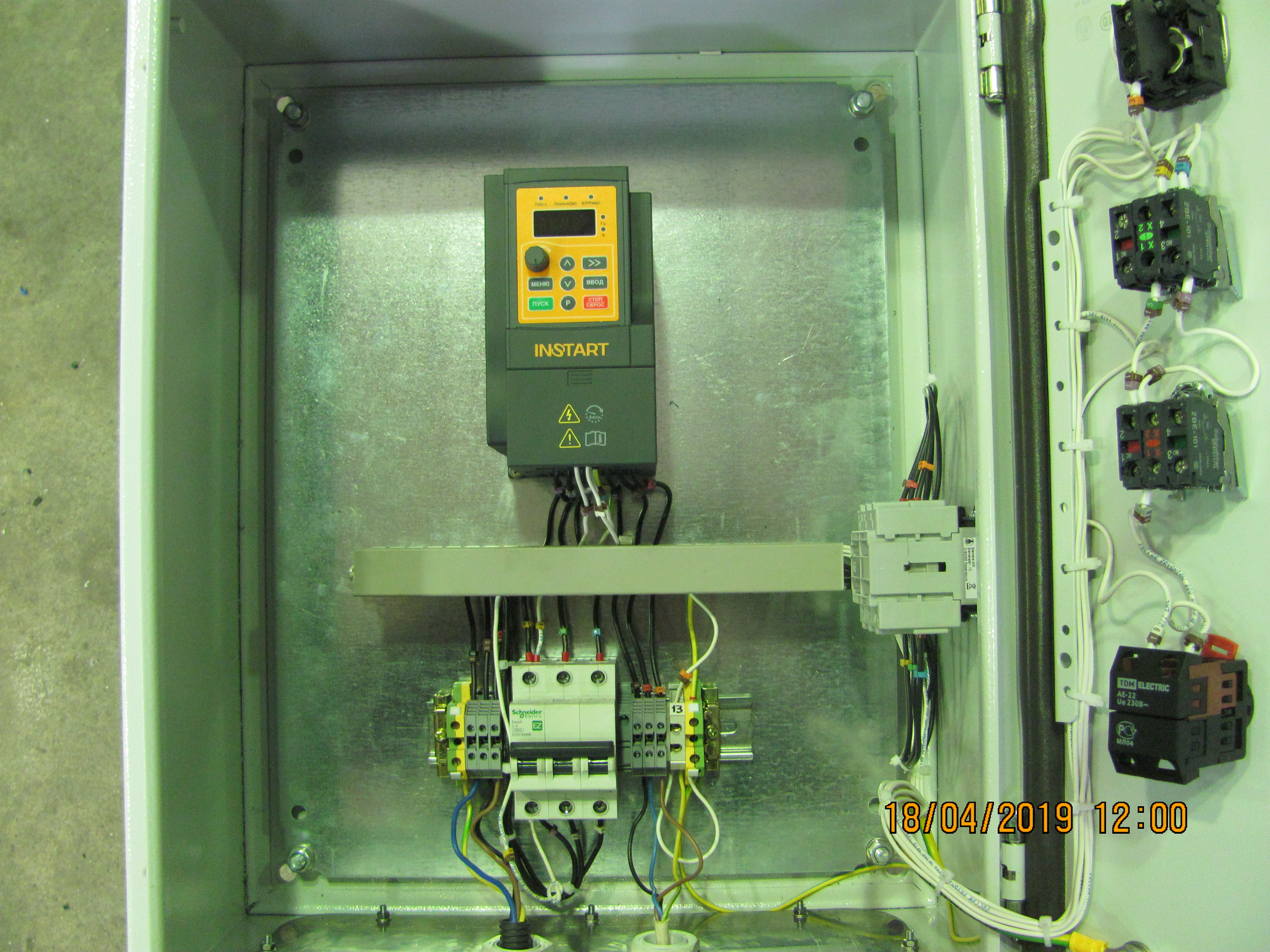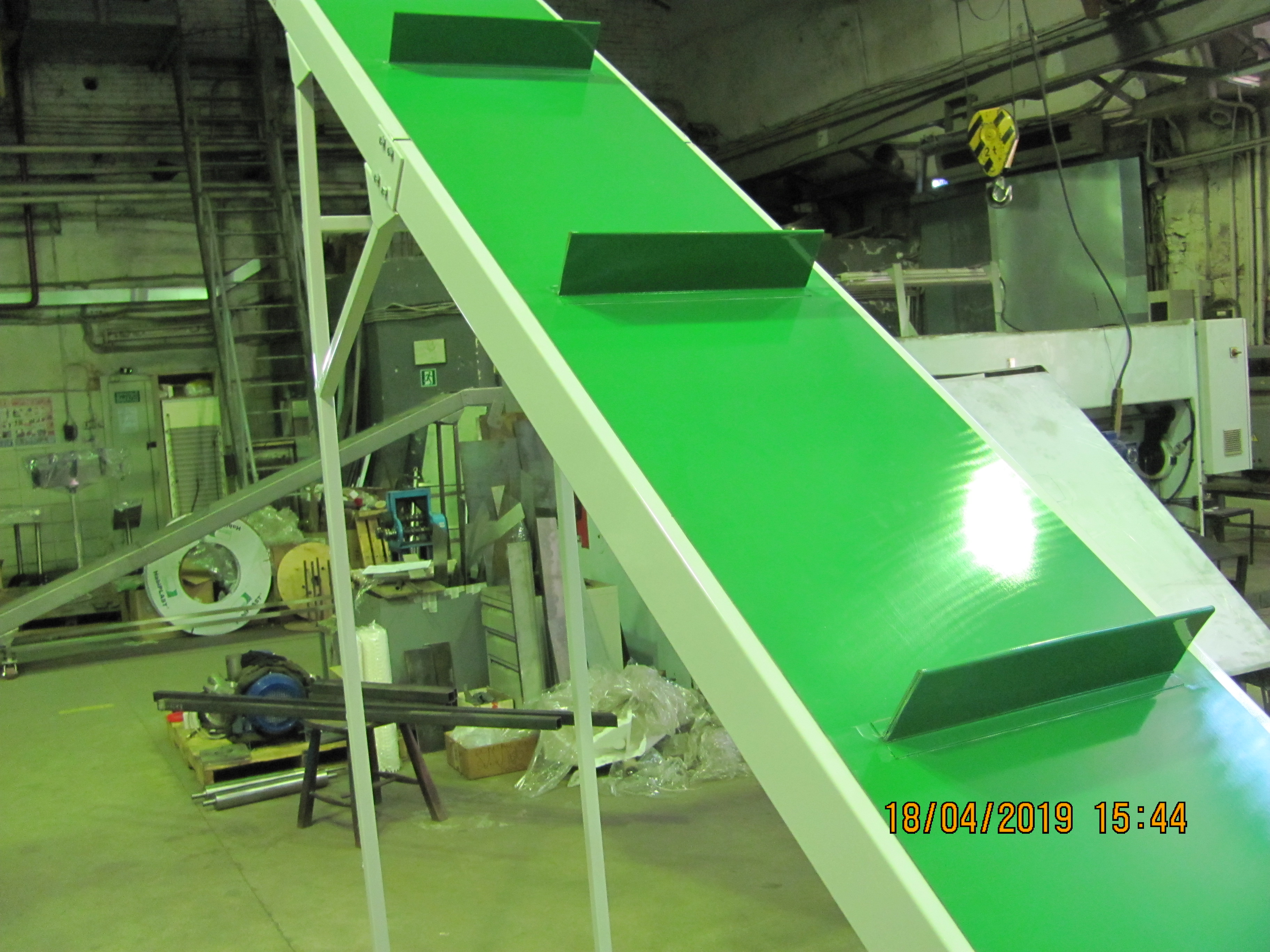 Для перемещения пустых коробок на 2-й этаж изготовлен стационарный ленточный конвейер.Угол наклона 30 градусов.Длина конвейера 4000 мм.Высота конвейера 500-2800 мм.Материал ленты ПВХ (зеленый цвет)Максимальная нагрузка на конвейер 120 кг.Скорость движения ленты 12 м/минМотор-редуктор Германия