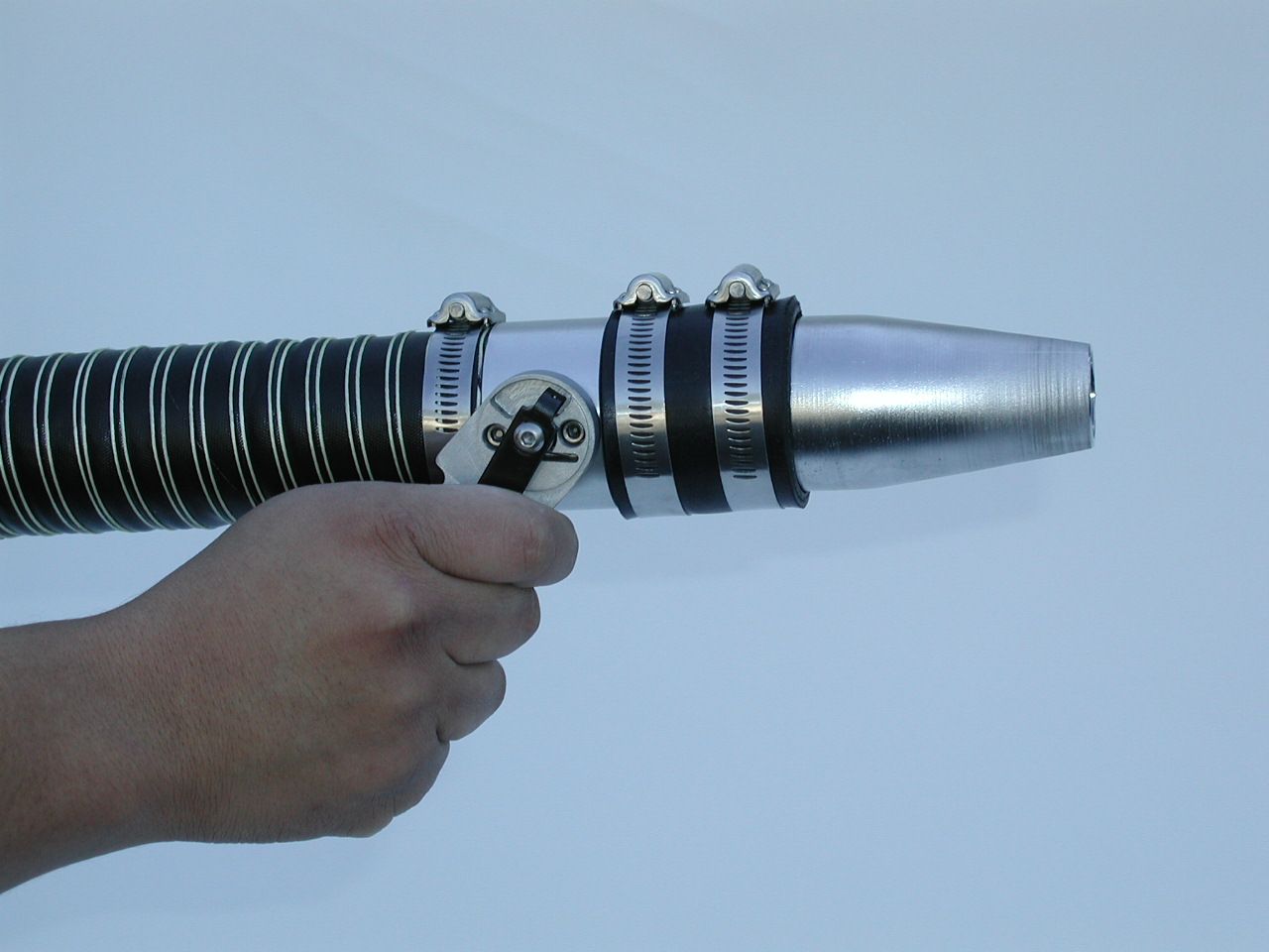 Воздушный нож Sonic Air Systems ручной состоит из конусообразной трубки с форсункой с одной стороны и устройством подачи скоростного потока воздуха с другой, а так же оснащен клапаном для включения, выключения и регулировки скорости воздушного потока.