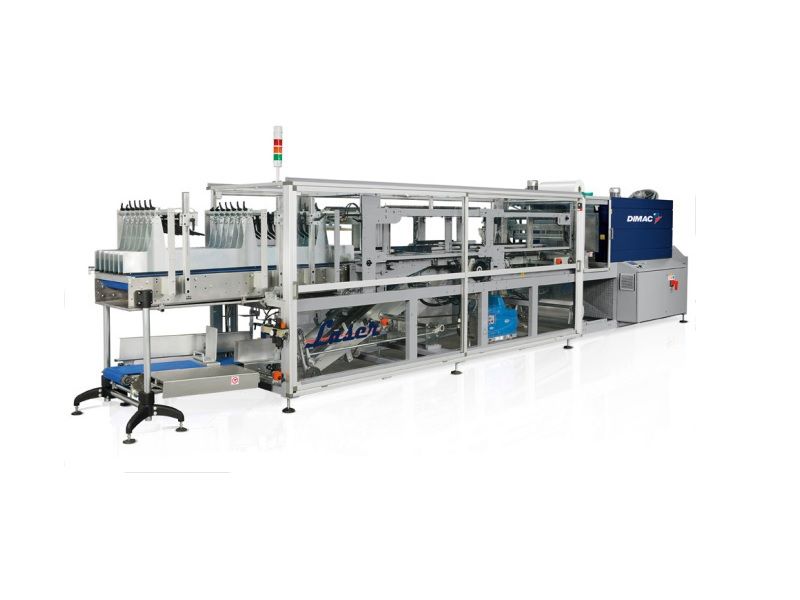 LASER F термоусадочная машина. Оснащена системой подачи стеклянной и пластиковой тары по ленточному транспортеру. Вибрационный выпрямитель улучшает распределение продукции между направляющими в два ряда и более.