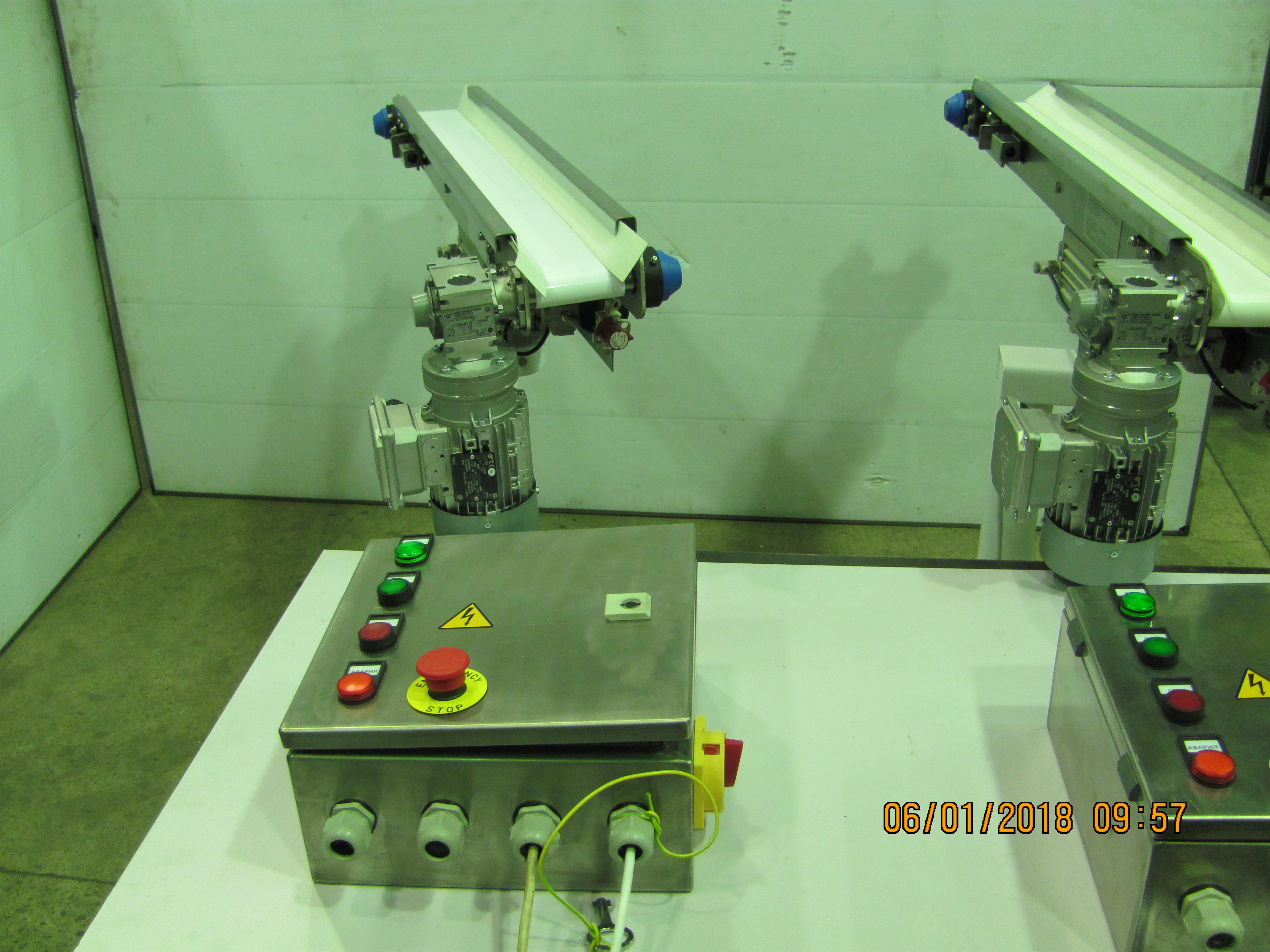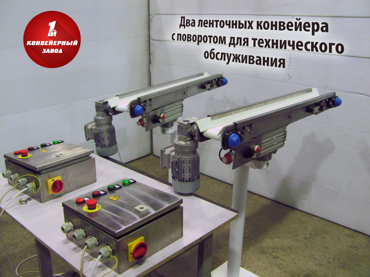 Описание проекта: Для кондитерской фабрики изготовлены 2 ленточных конвейера с поворотом на 90 градусов для технического обслуживания. Конвейер встраивается в линию, и для того чтобы пройти обслуживающему персоналу через линию, нажимается кнопка и конвейер поворачивает на 90 градусов на вертикальной оси. Длина конвейеров 1000 мм, ширина ленты 200 мм, конвейеры изготовлены из нержавеющей стали, шкаф управления с частотным преобразователем, привод (Европа)