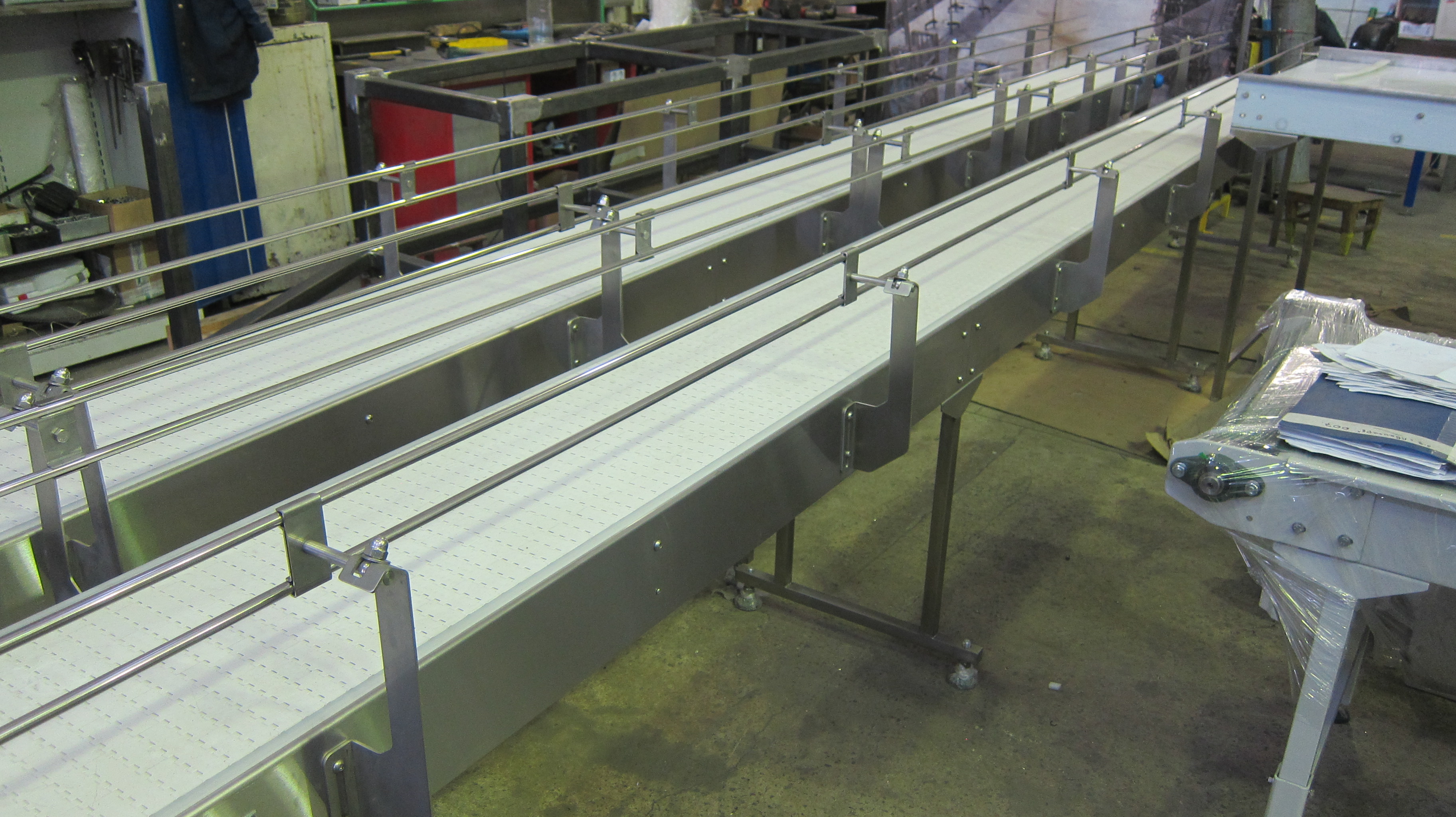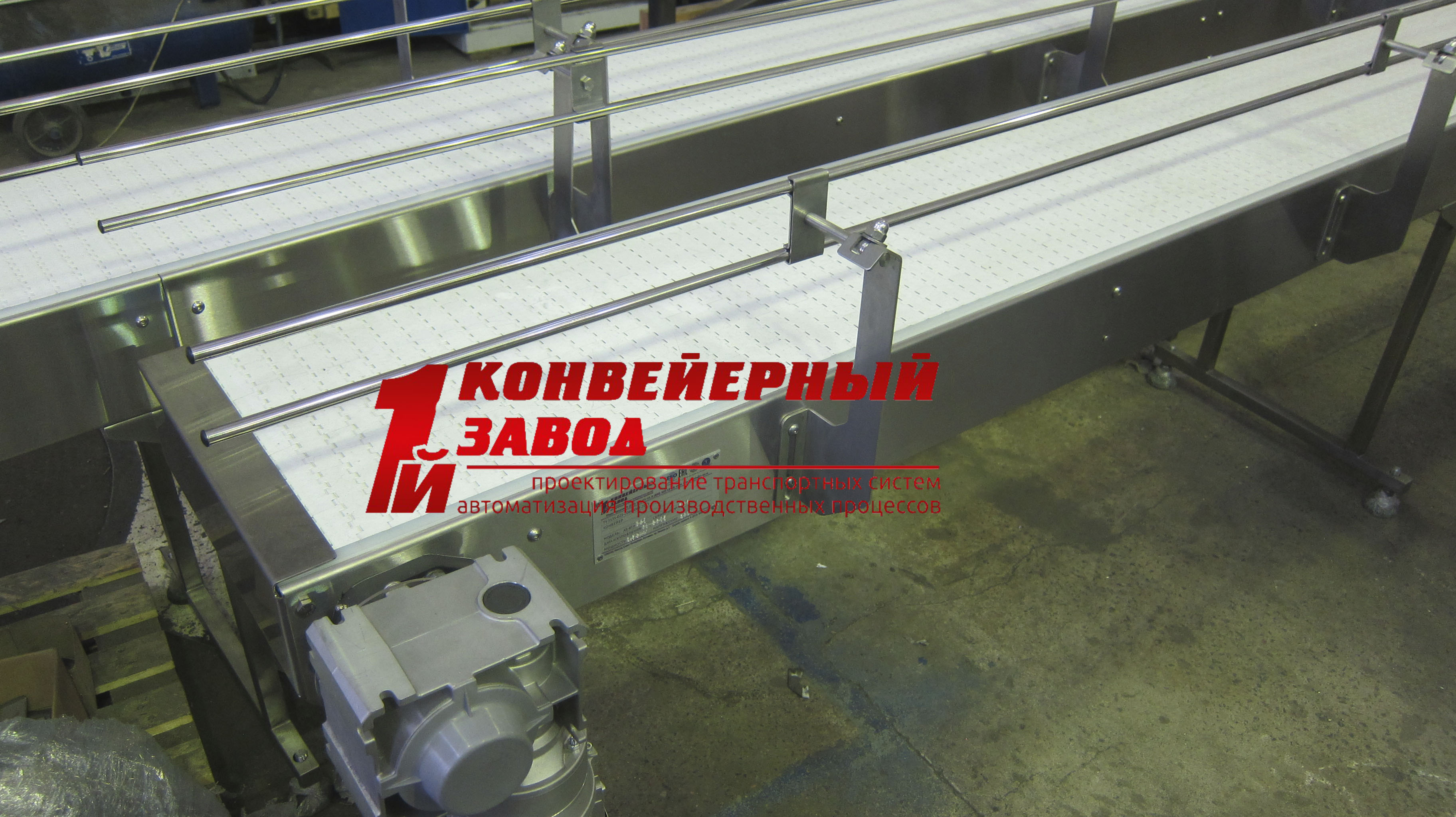 Описание проекта: Для накопления ПЭТ бутылок после линии розлива, Заказчику изготовлены 2 конвейера с модульной лентой. Длина конвейеров 6 и 8 метров, ширина ленты 350мм. Изготовлены конвейеры из нержавеющей стали, с двух сторон кронштейны ограждения высотой 200мм, приводы 0,75 кВт (Германия), скорость движения ленты 12 м/мин.