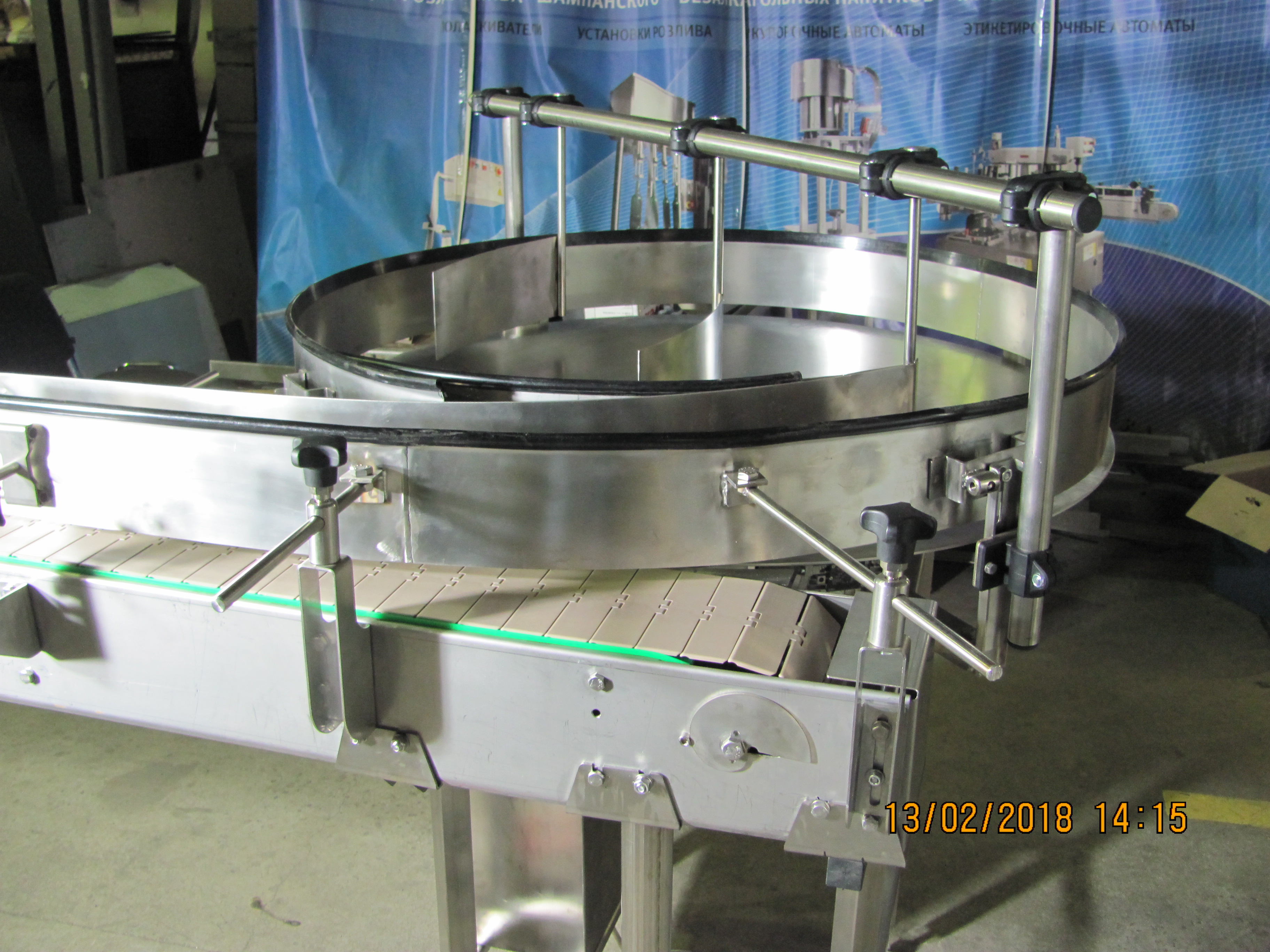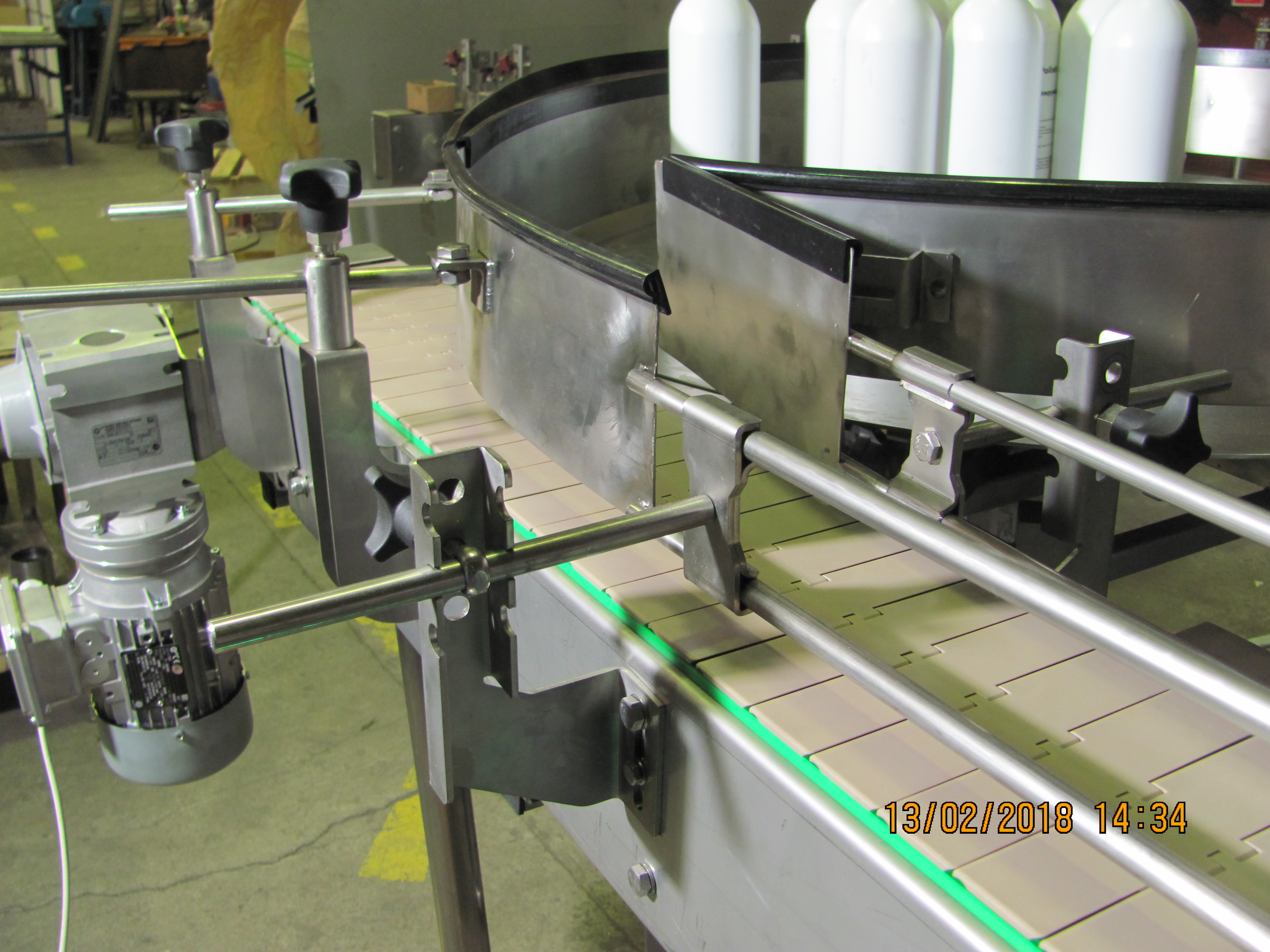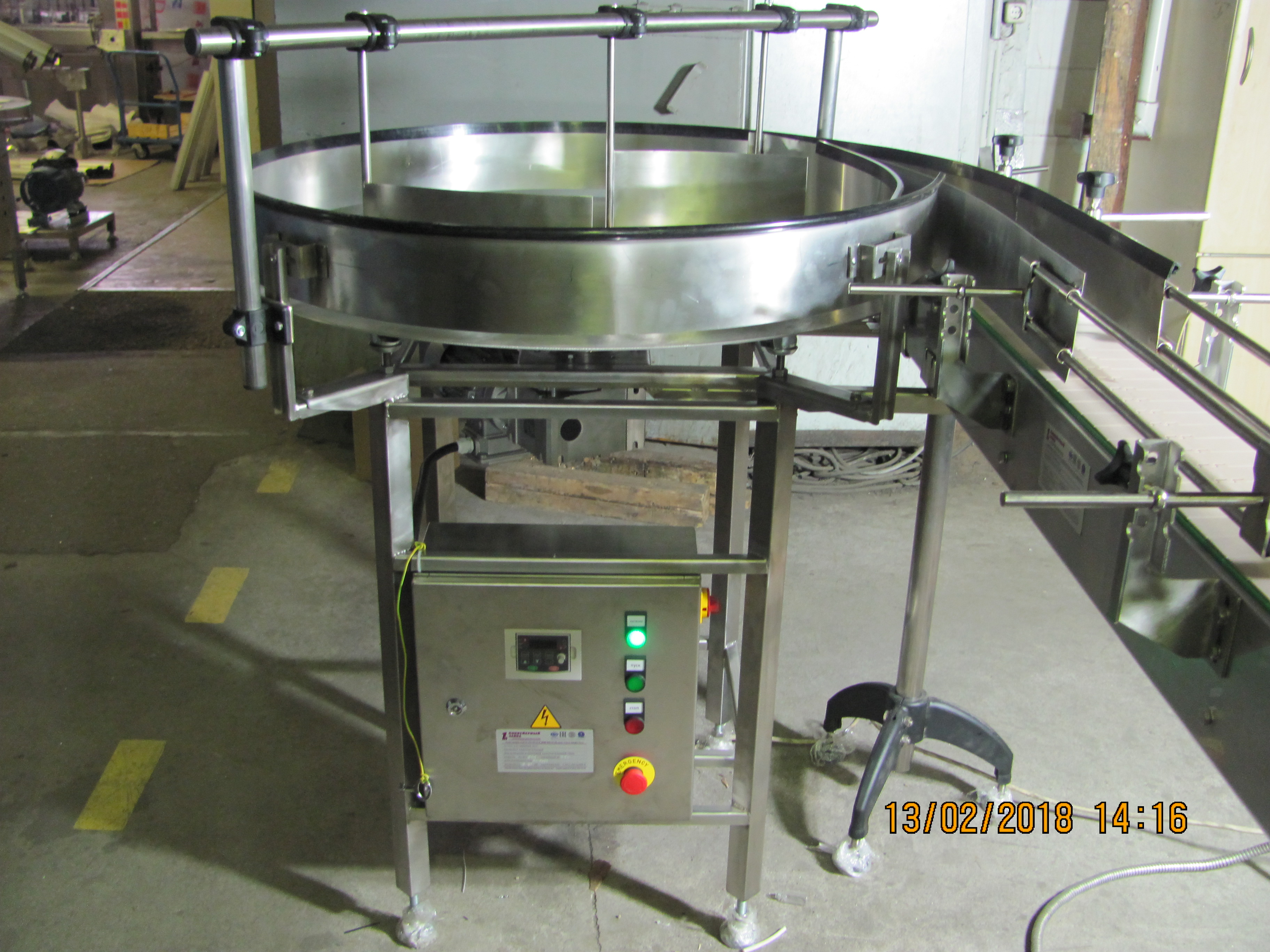 Описание проекта: Для линии розлива химической жидкости изготовлены несколько конвейеров: 2 круглых накопительных стола диаметром 1000 мм и прямой пластинчатый конвейер длиной 6 000 мм.Все конвейеры изготовлены из нержавеющей стали, ширина пластинчатой цепи - 152,4 мм (Италия), каждый конвейер оборудован шкафом управления с частотным преобразователем, приводы 0,37 кВт (Европа), скорость движения 5-15 м/мин.