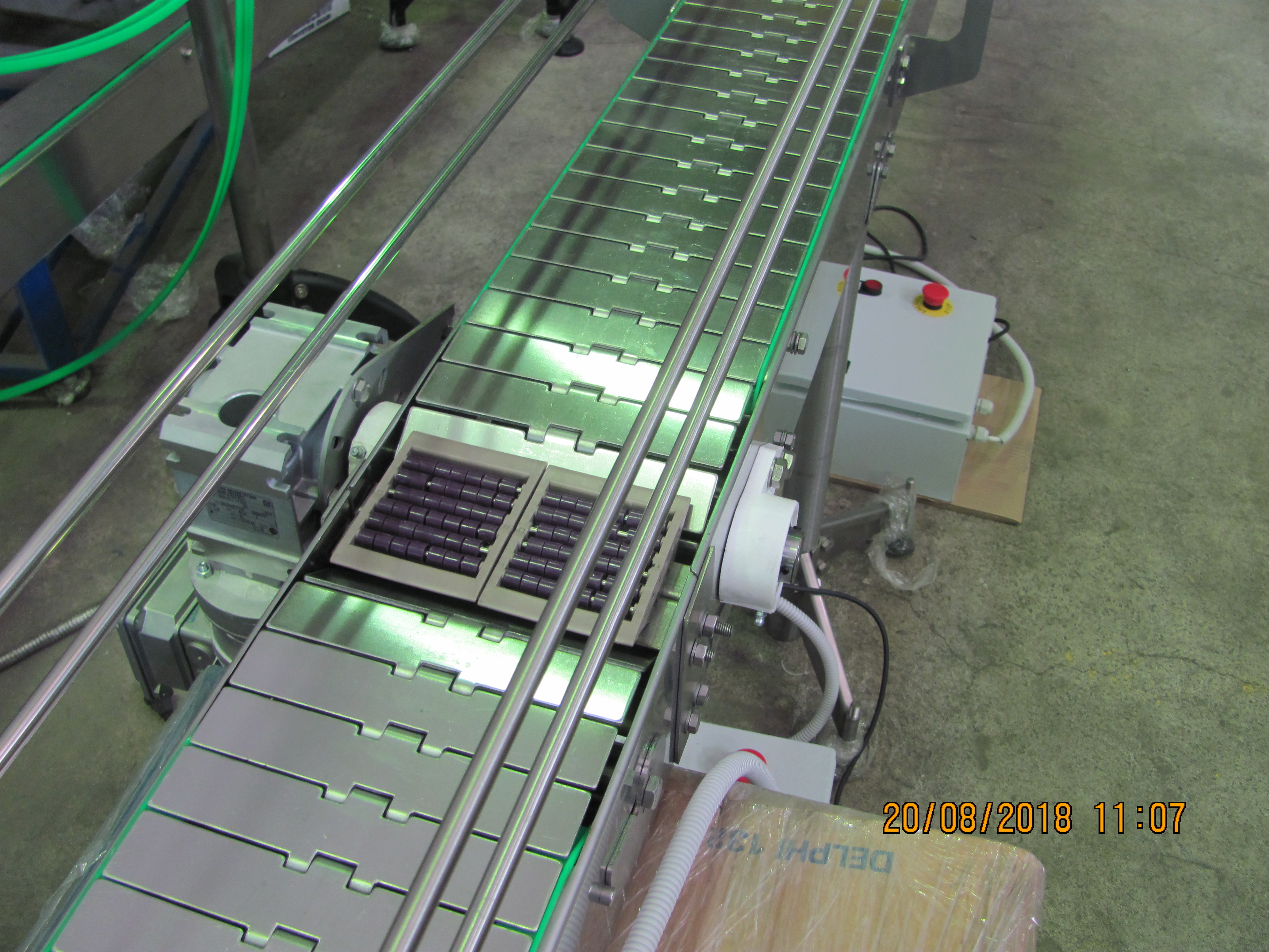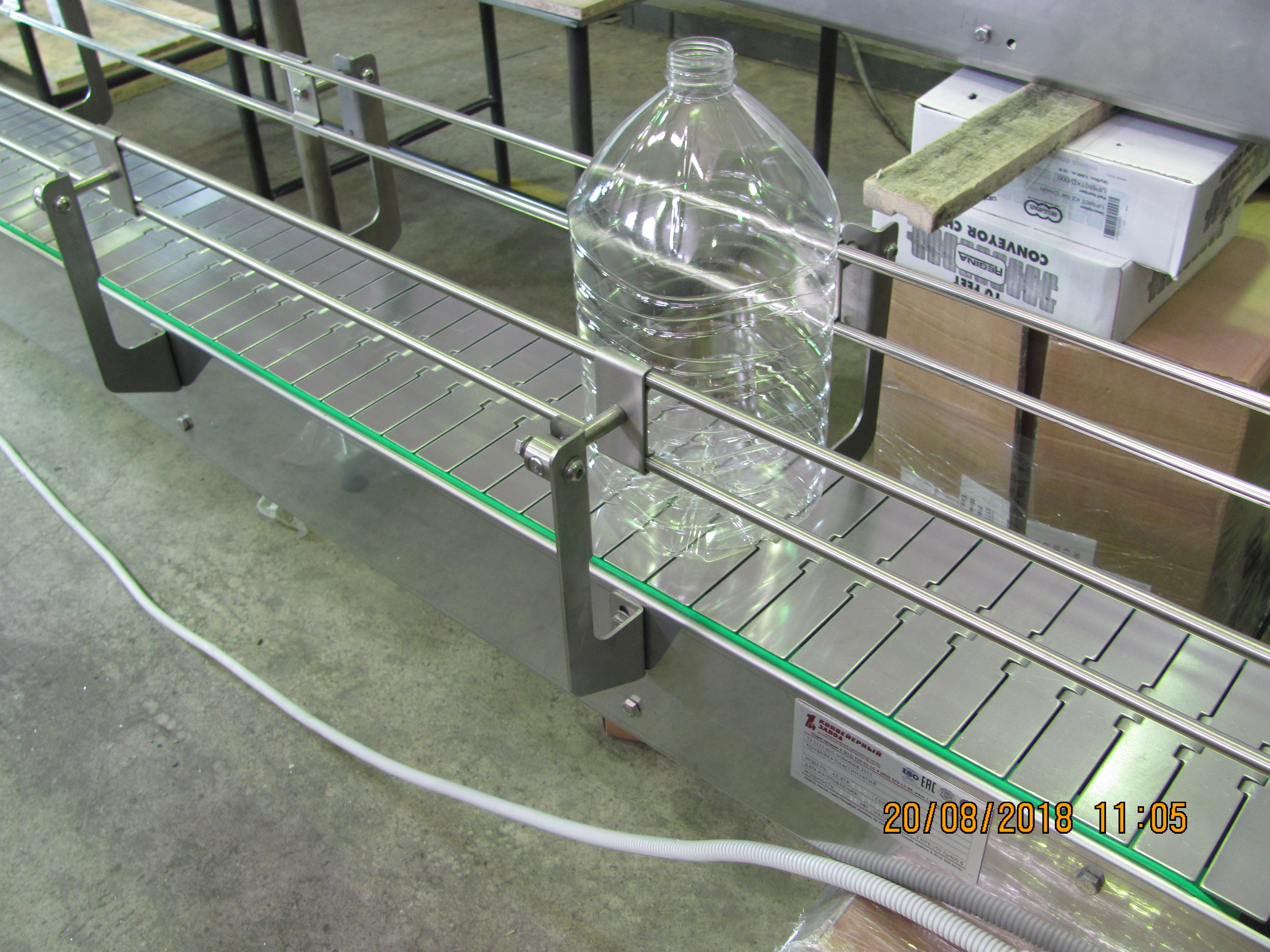 1-м конвейерным заводом изготовлены 2 пластинчатых конвейера для перемещения 19 л. ПЭТ бутылок с водой.материал конвейеров - нержавеющая сталь AISI 304Длина конвейеров 4000 и 4300 ммШирина нержавеющей цепи 190,5 ммМотор-редуктор 0,37 кВт (Германия)Шкафы управления с частотными преобразователямиРоликовые площадкиРегулируемые кронштейны ограждения