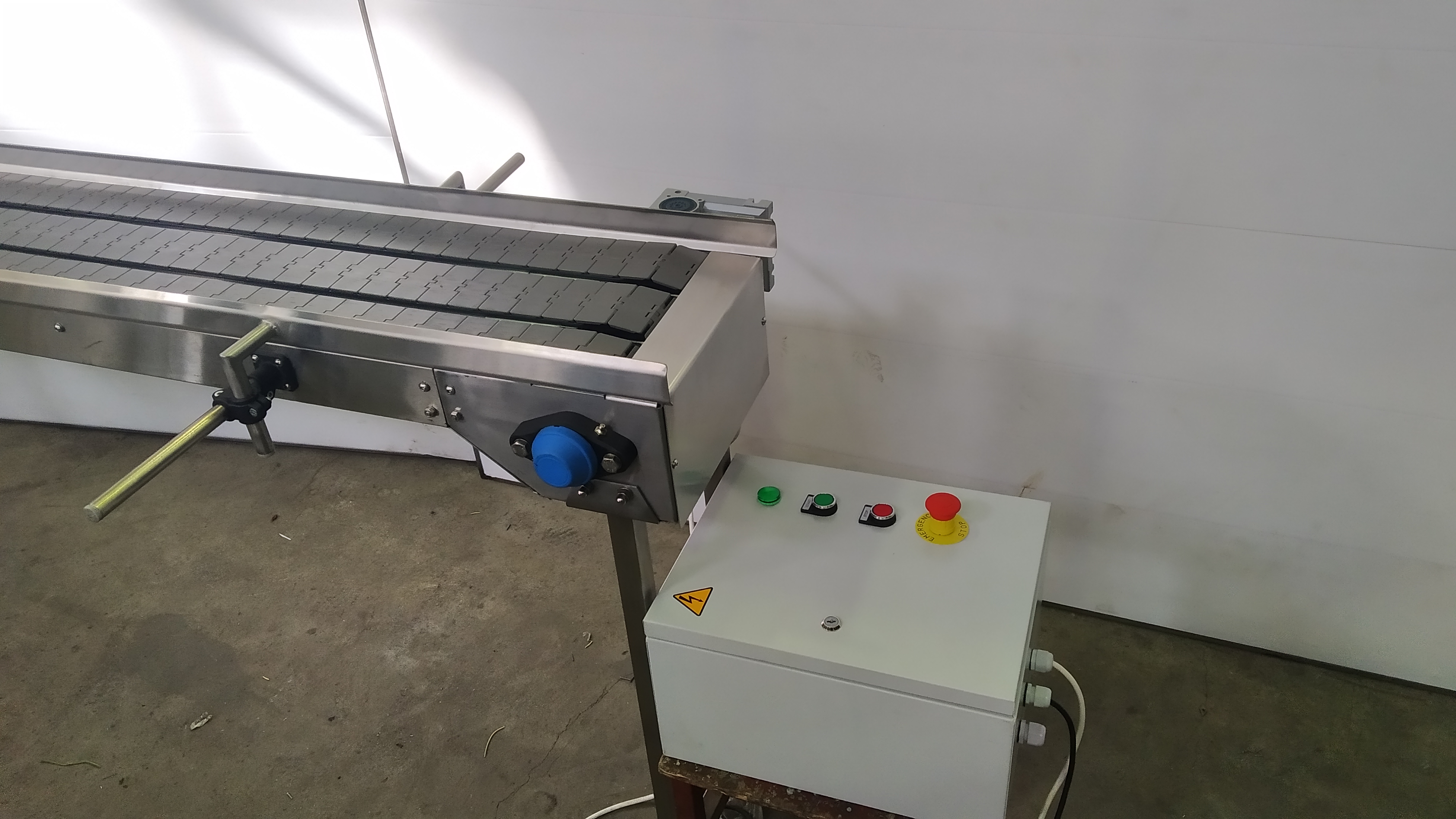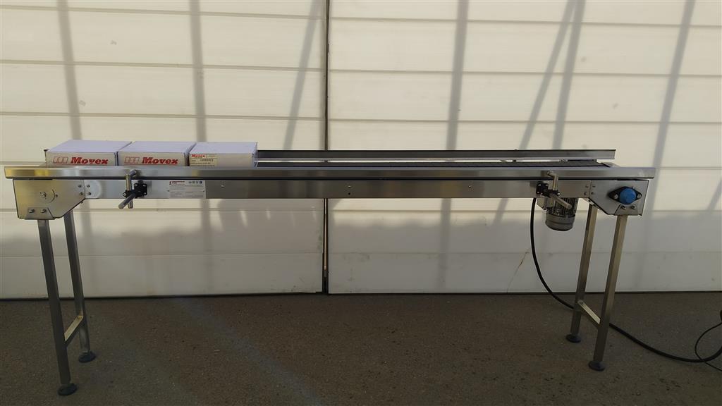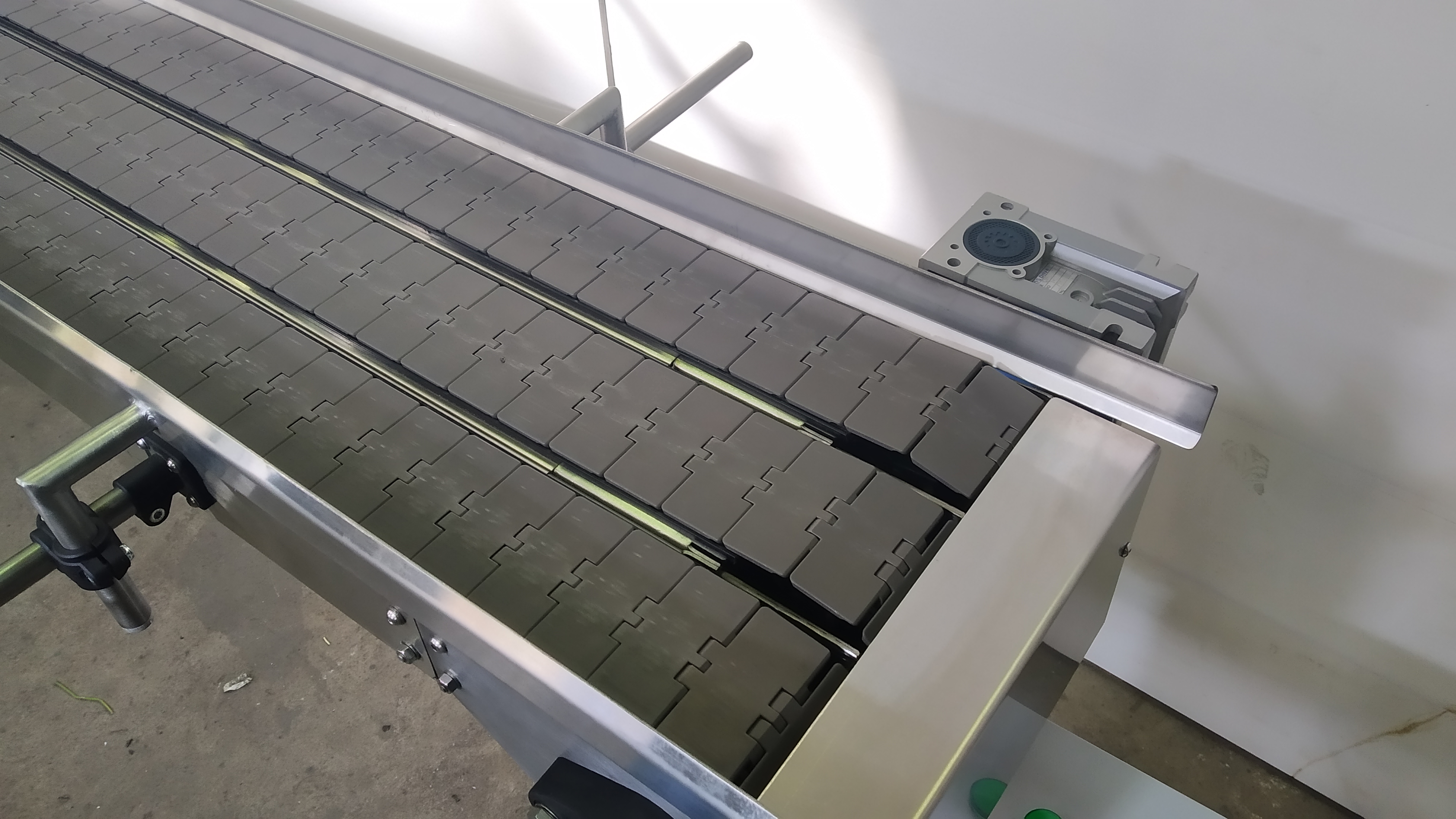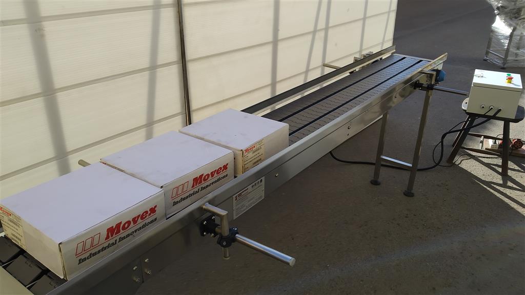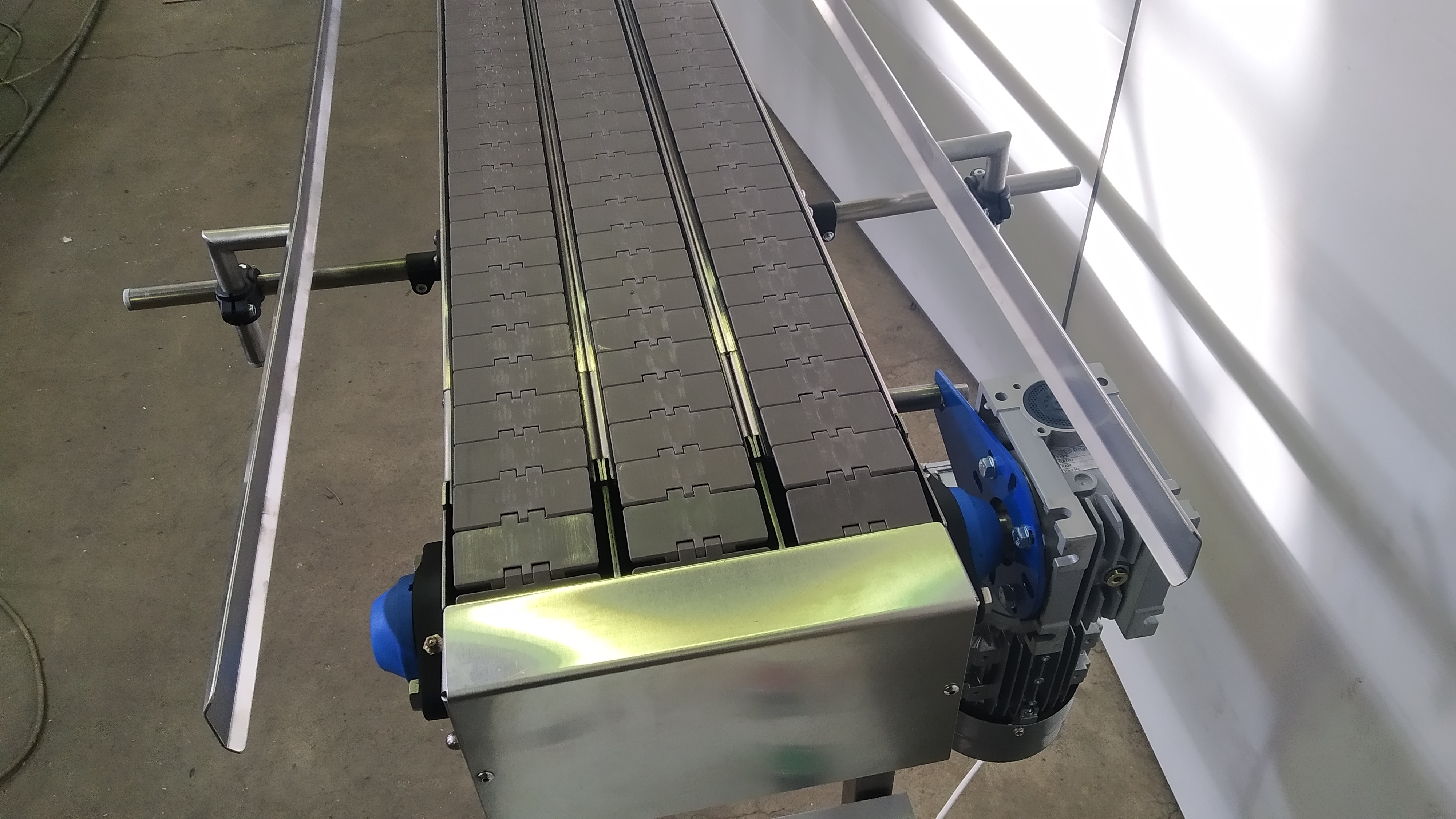 Описание проекта: Для компании, производящей пищевую продукцию быстрого приготовления, в короткий срок изготовлен 3-х рядный пластинчатый конвейер.Конвейер предназначен для нанесения этикетки на плоскую картонную упаковку.Длина конвейера 2500 мм, ширина цепи 82,5 мм, привод 0,37 кВт со шкафом управления и частотным преобразователем.Материал конвейера - нержавеющая сталь, специальные кронштейны ограждения с возможностью регулировки по высоте и ширине.