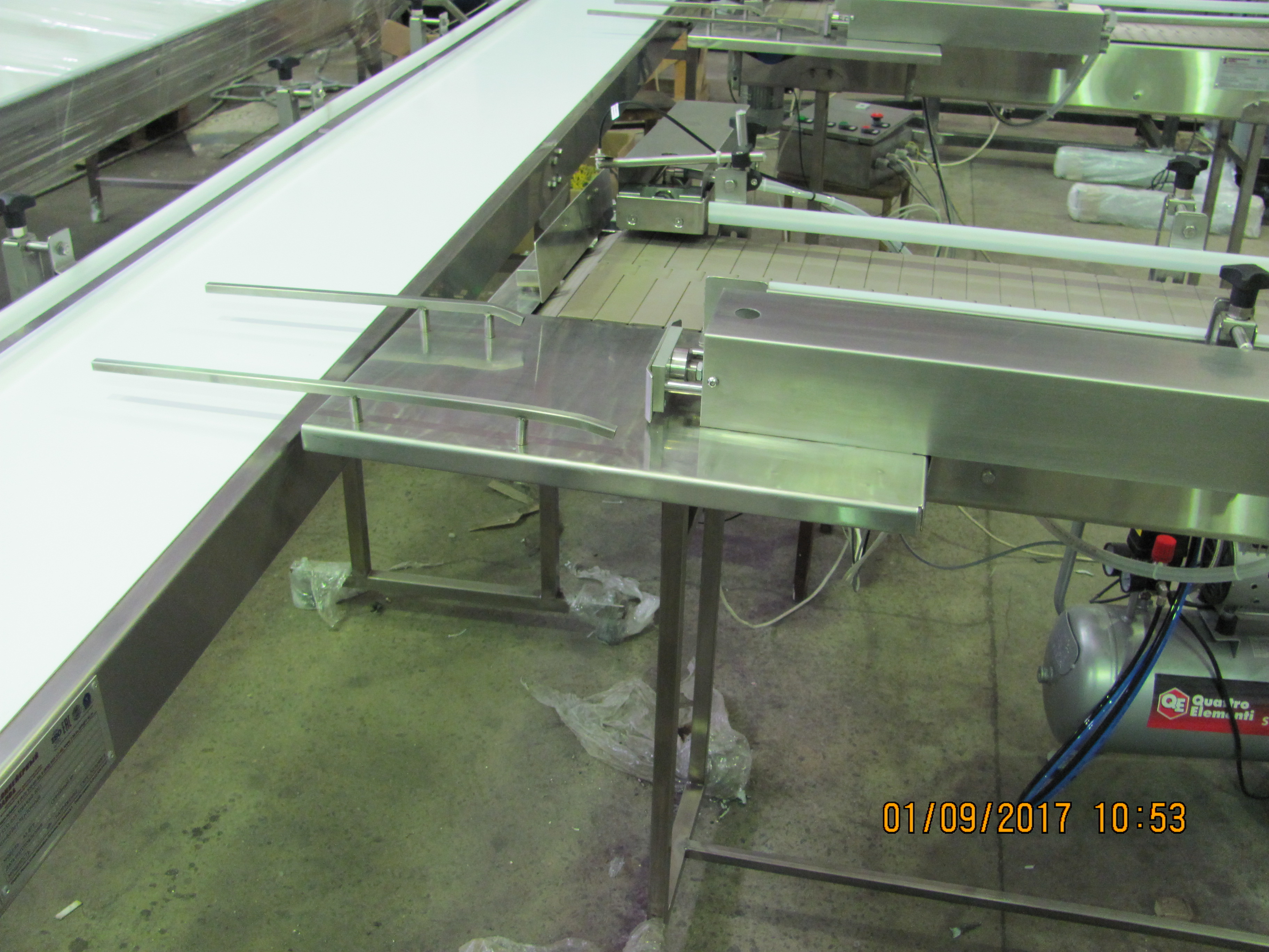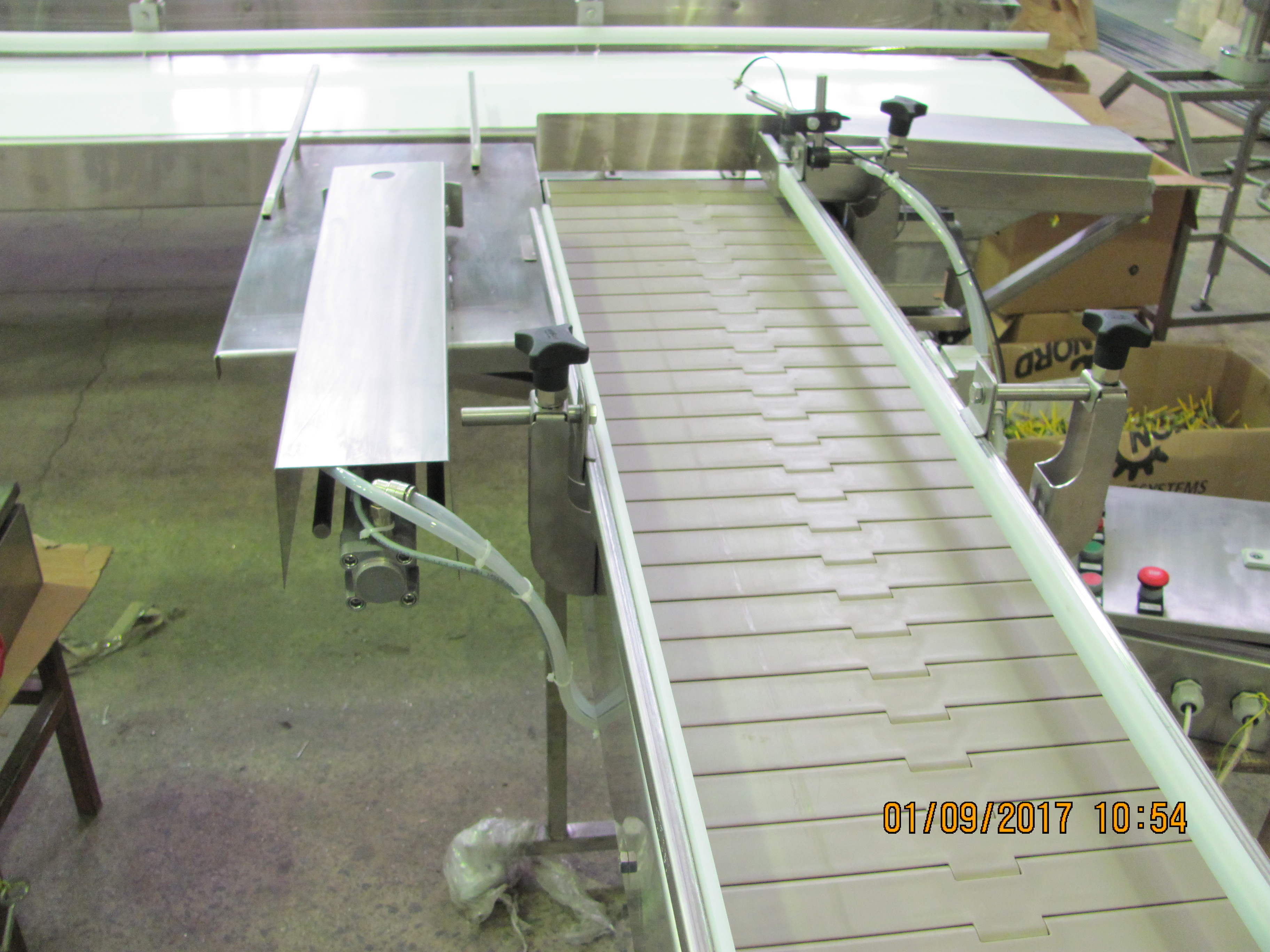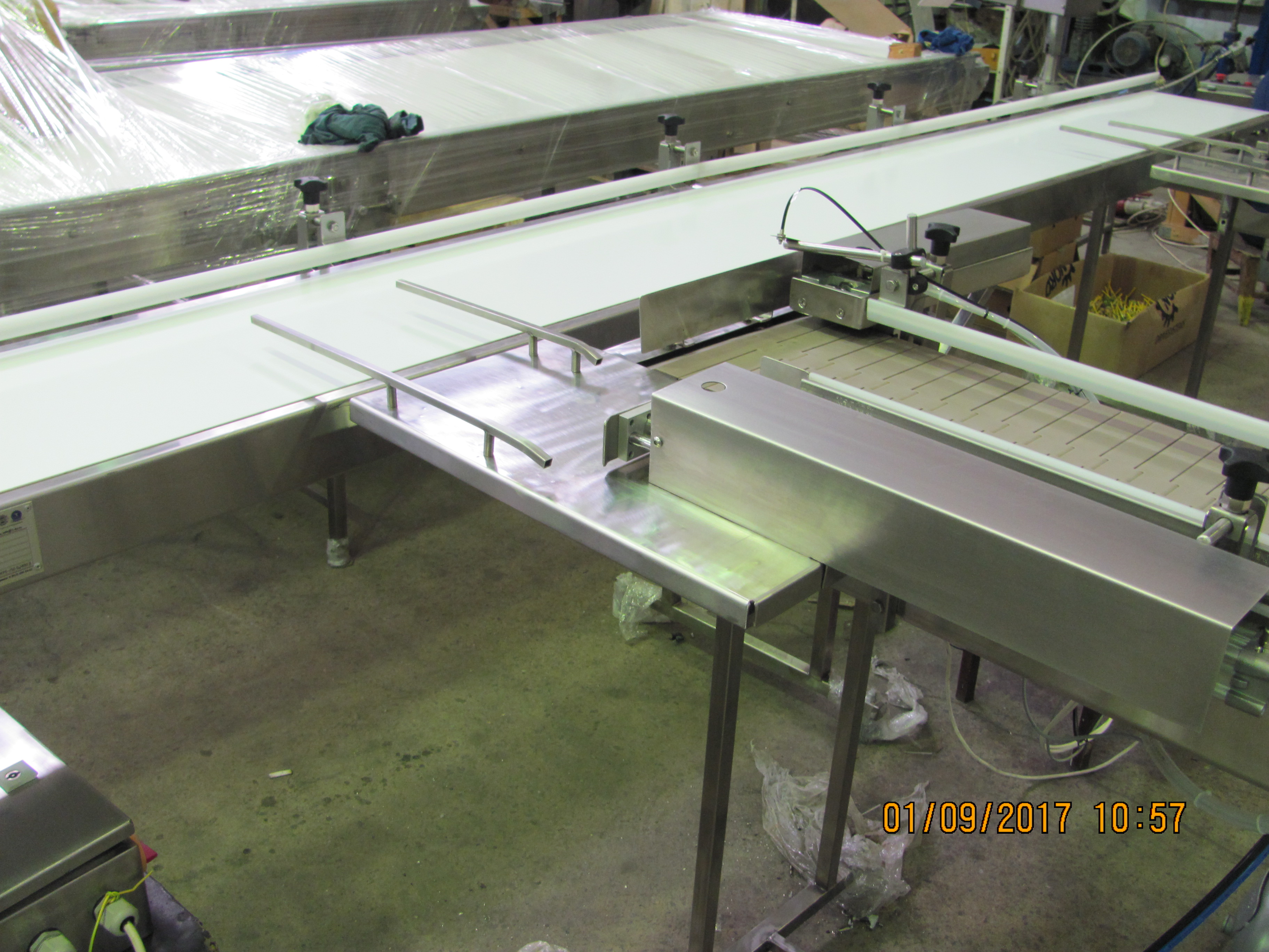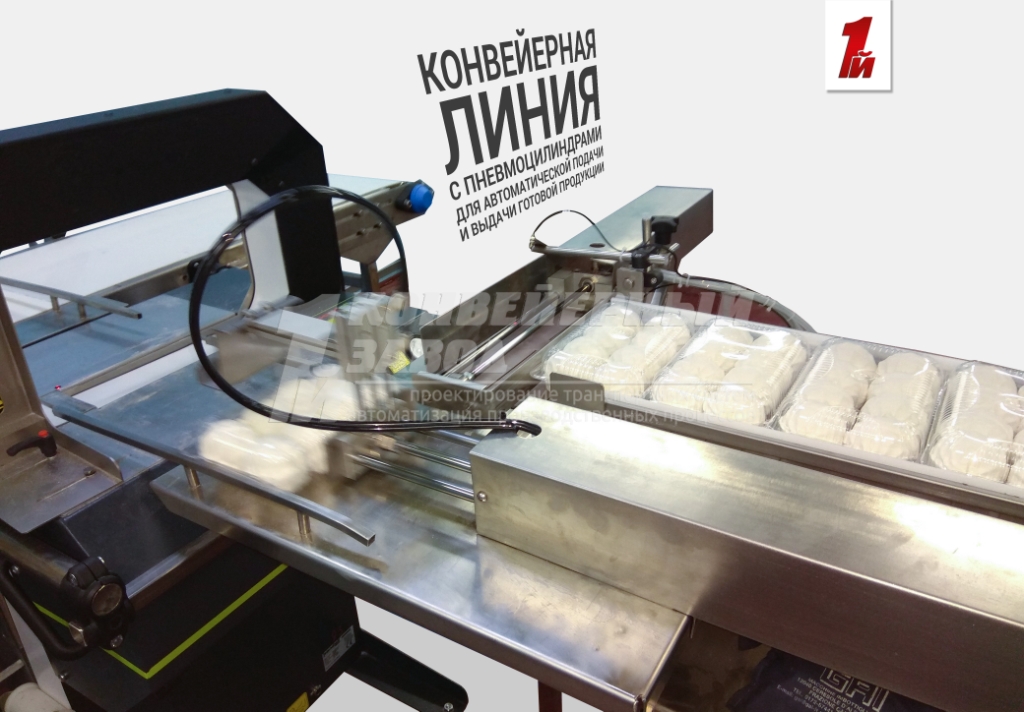 Описание проекта: Для кондитерского предприятия изготовлена и запущена в работу автоматическая конвейерная линия. Линия, предназначена для перемещения готовой продукции на обандероливание.Состав линии:2 пластинчатых конвейера длиной 1800 мм с 2-я пневмоцилиндрами и переходным столом;ленточным конвейером длиной 4000 мм;Все оборудование изготовлено из нержавеющей стали, ширина пластинчатой цепи 304,8 мм, ширина ленты ПВХ 400 мм, система датчиков и программа работы пневмоцилиндров.