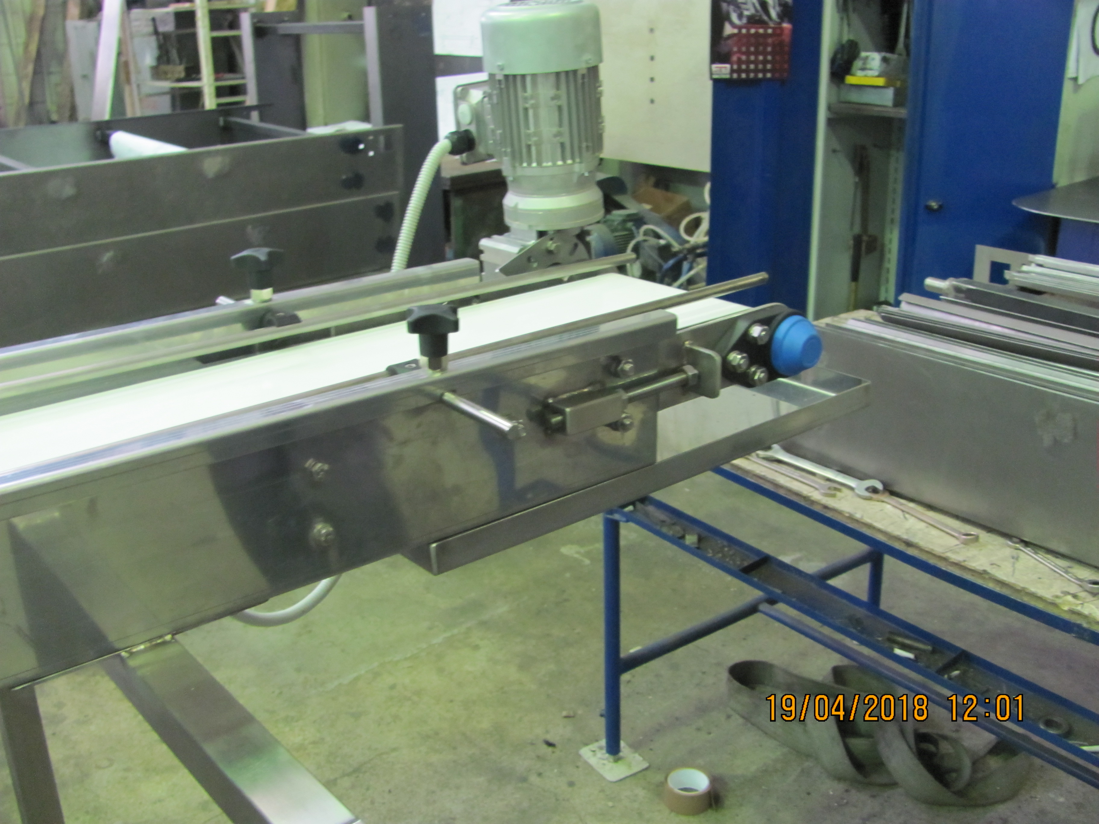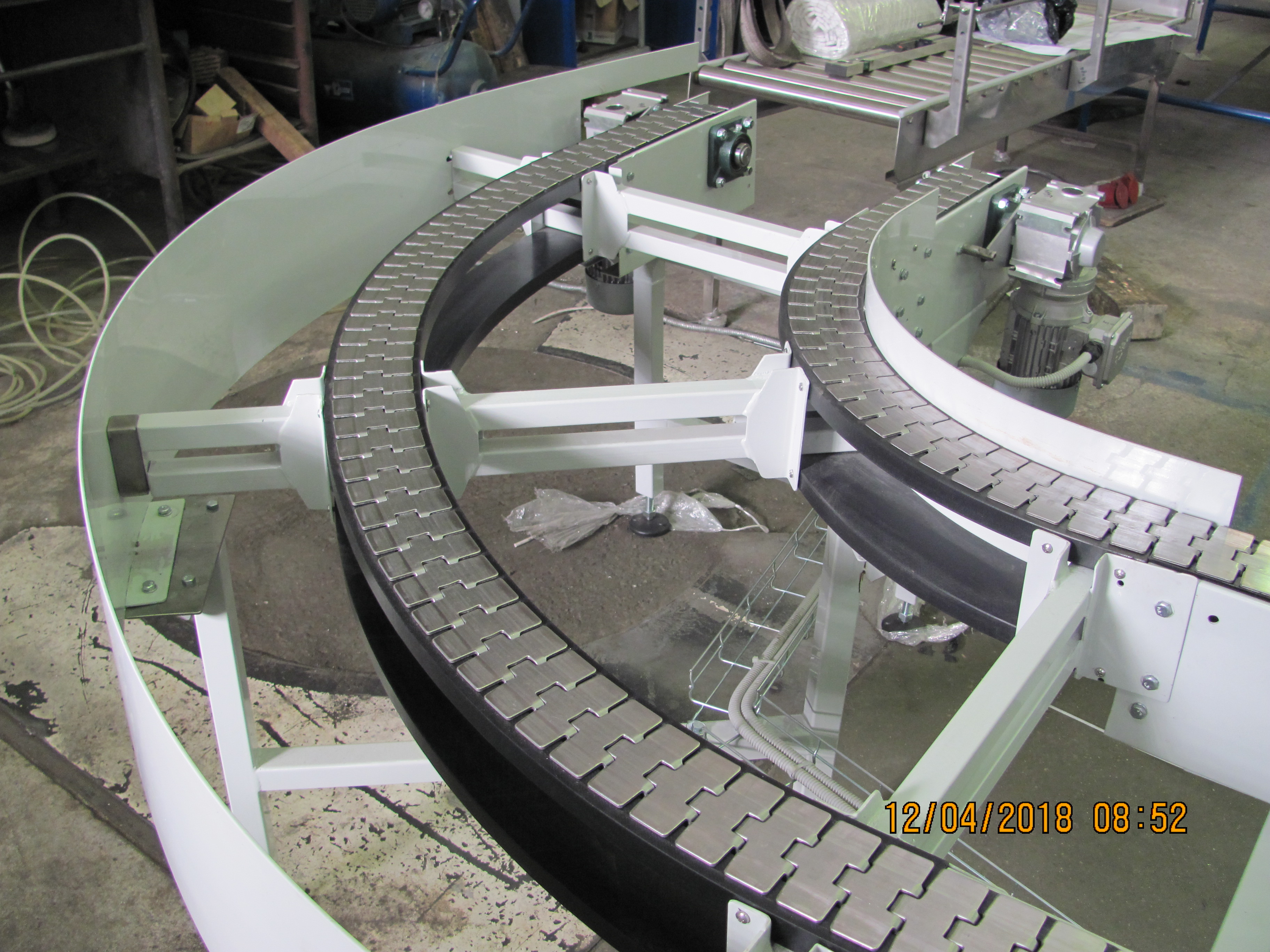 Описание проекта: Изготовлен и введен в эксплуатацию комплекс конвейеров для перемещения противиней с продукцией.Состав комплекса:1. Конвейер пластинчатый 3-х рядный, прямой, стационарный. (принимающий с конвейера печи)2. Конвейер пластинчатый 3-х рядный, прямой, стационарный (промежуточный разгонный)3. Пластинчатый 2-х рядный конвейер с подъемным модулем смены направления движения на 90° (в виде блока с приводными роликами)4. Рольганг приводной поворотный на 90°, стационарный5. Единый шкаф управления из окрашенной углеродистой стали с инвертерами для плавной регулировки скорости.6. Система автоматики для обеспечения синхронизации работы конвейеров и защиты оборудования.