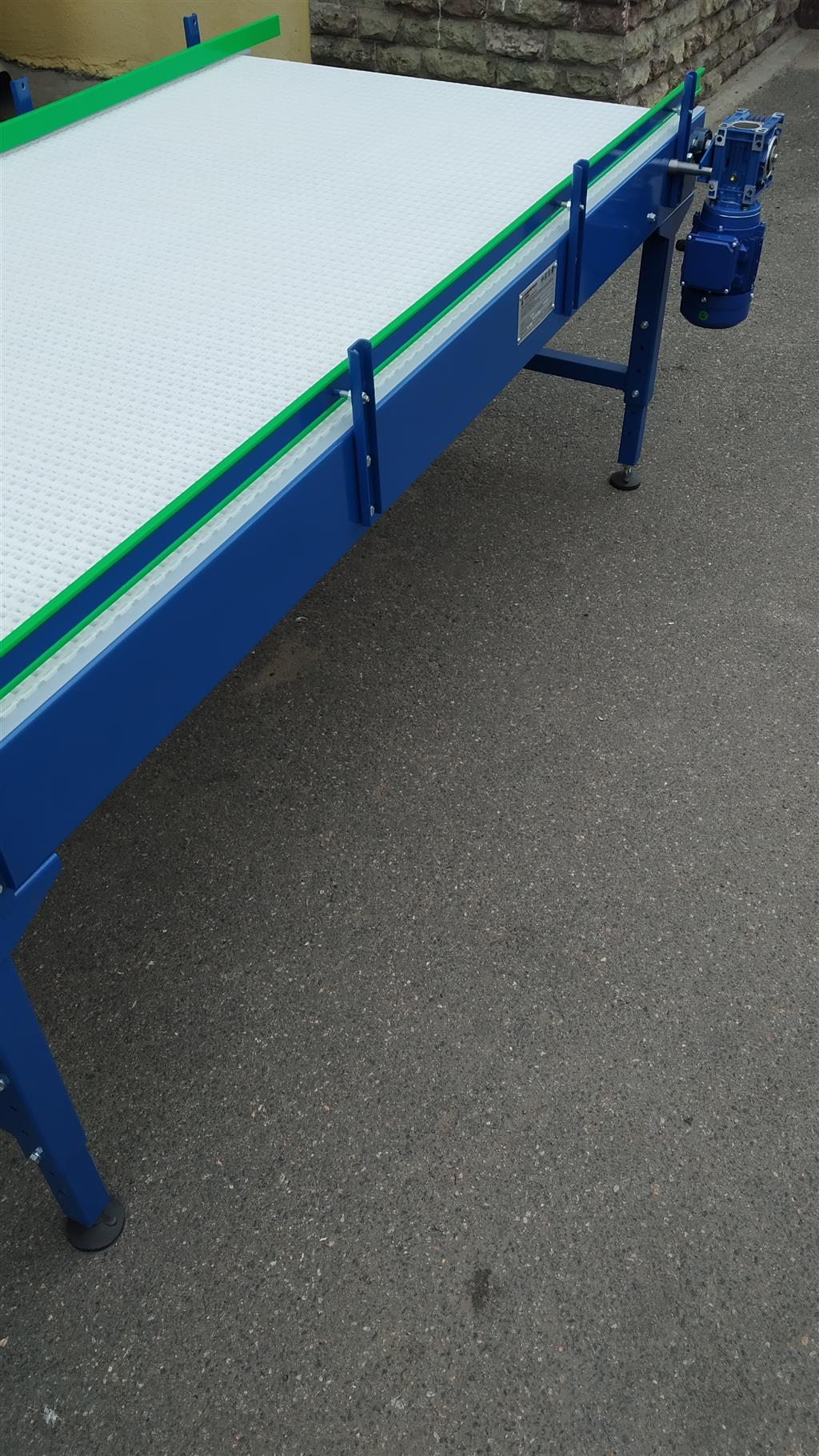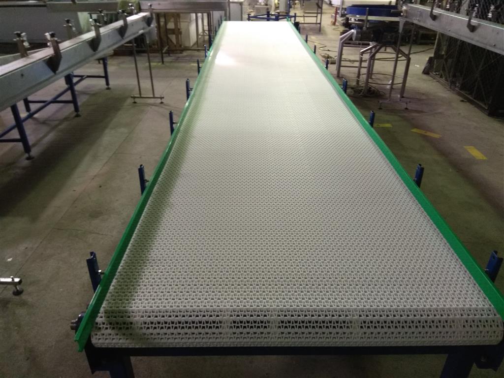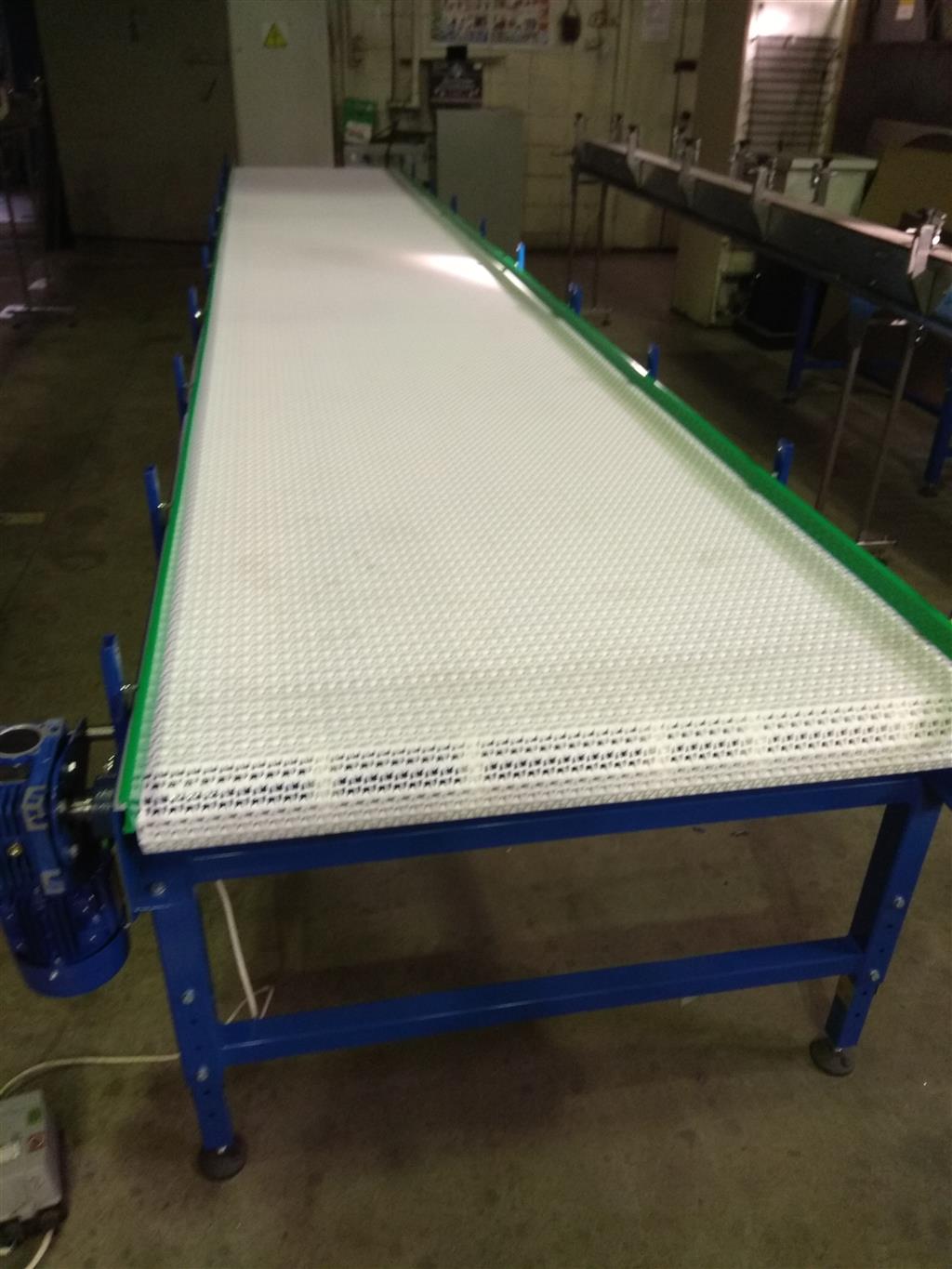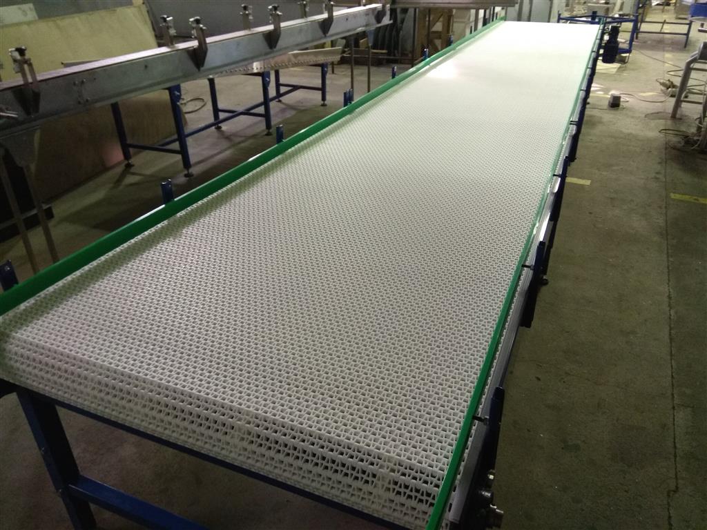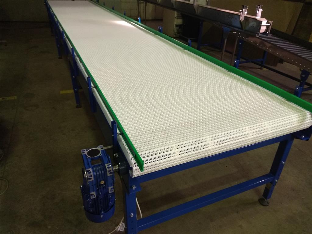 Изготовлен конвейер с модульной лентой, служащий для накопления консервных банок перед оборудованием.Технические параметры:длина конвейера 6000 мм;высота конвейера 600-850 мм;ширина модульной ленты (полипропилен) 1000 мм;высота пластикового ограждения 50-100 мм;материал конвейера углеродистая сталь с порошковой окраской;тип привода мотор-редуктор;