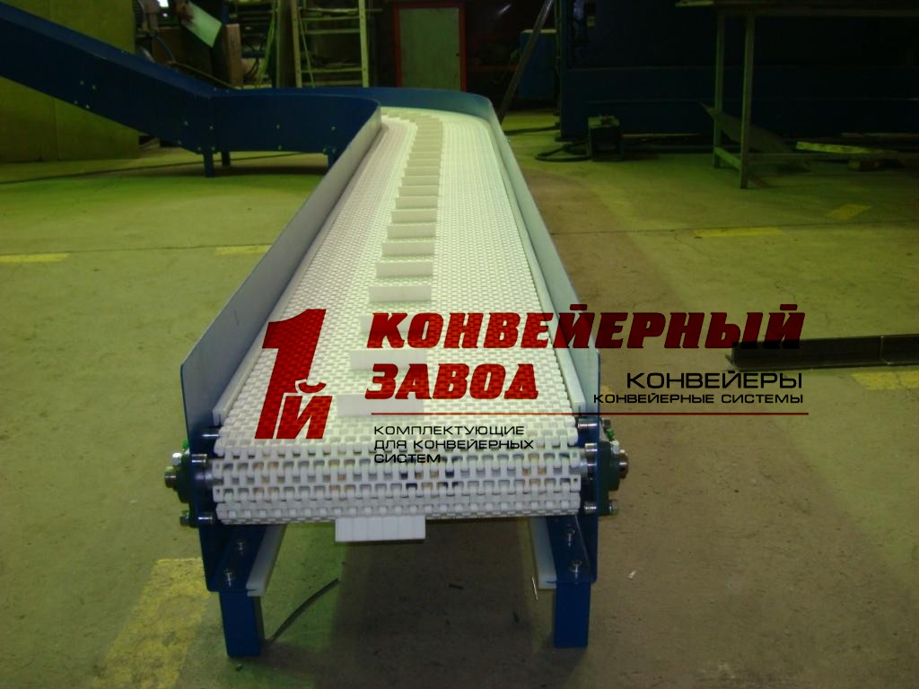 Описание проекта: Для нашего постоянного покупателя изготовлен уже 3-й конвейер. Конвейер предназначен для перемещения картонной упаковки для яиц по сложной траектории: горизонтальный участок, наклонный участок и подъемный участок на одном приводе. Использована модульная лента шириной 400мм с перегородками высотой 25мм. Материал конвейера - углеродистая сталь с порошковой окраской (синий цвет), скорость движения ленты регулируется с помощъю частотного преобразователя.