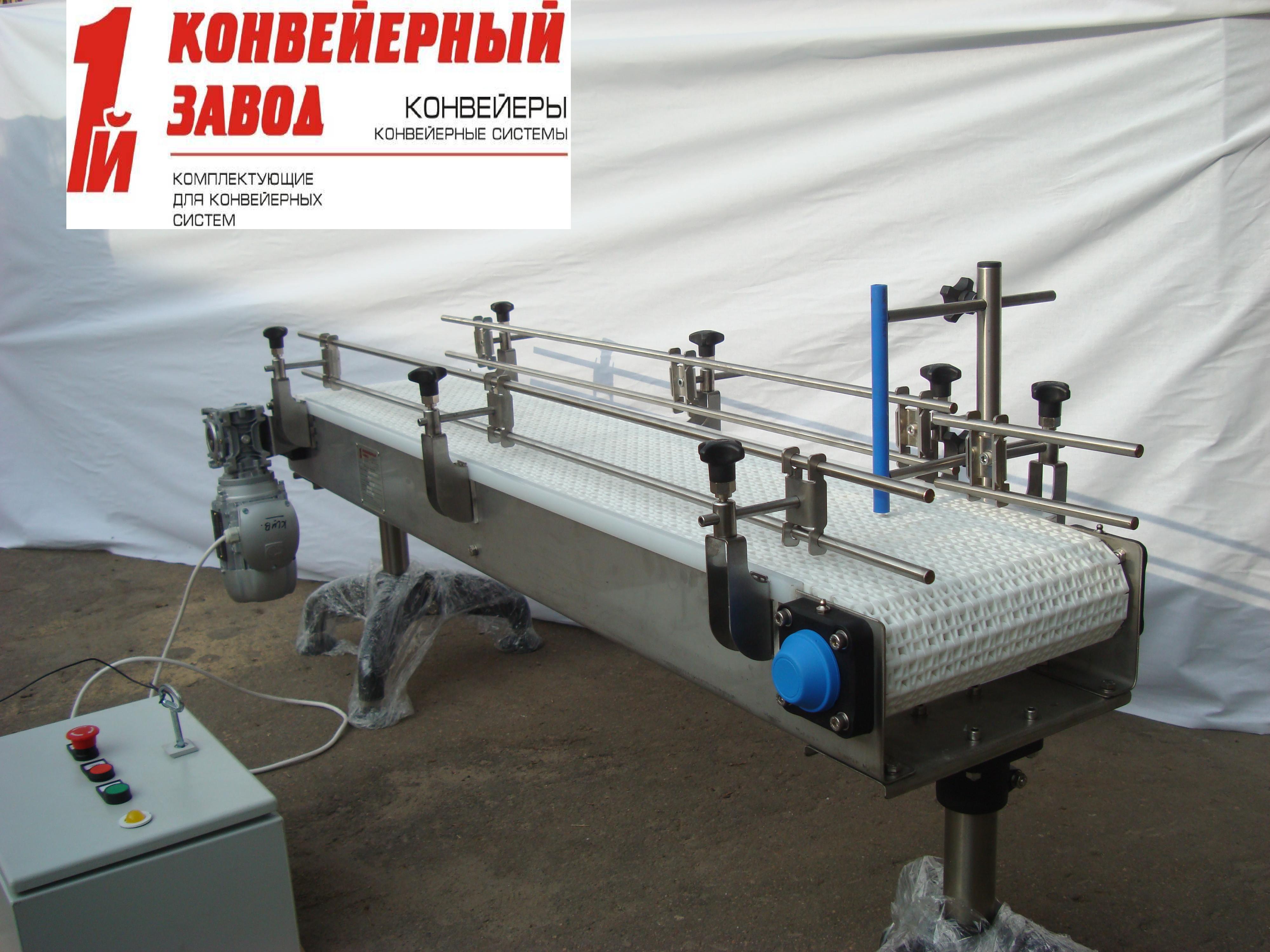 Описание проекта: Для нашего постоянного заказчика изготовлен 1,5 метровый конвейер из нержавеющей стали для разворота коробки с продуктом на 90?. Конвейер имеет регулируемую направляющую под разные размеры коробок и ограждение из нержавеющей стали. Ширина модульной ленты - 300 мм, высота конвейера - 500 мм, мотор-редуктор 0,18 кВт (Италия), регулировка скорости - частотный преобразователь в шкафу управления.