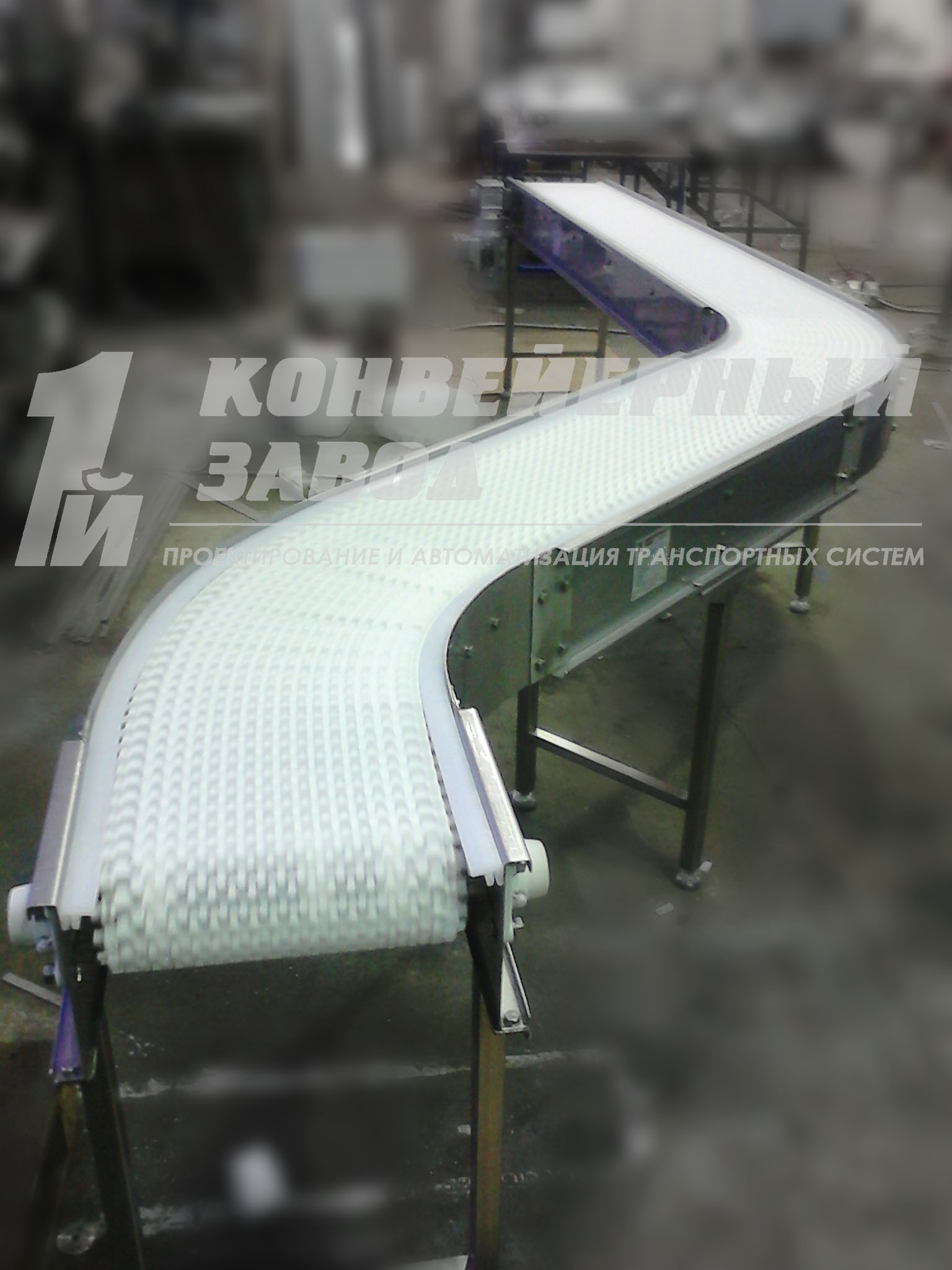 Описание проекта: Отгружен конвейер для перемещения упаковки по сложной траектории, с двумя поворотами. Для этого применена пластиковая модульная лента из полипропилена с малым радиусом поворота. Длина конвейера 4500мм, ширина ленты 300мм, привод 0,55 кВт (Германия), шкаф управления с частотным преобразователем. Материал конвейера - нержавеющая сталь AISI 304