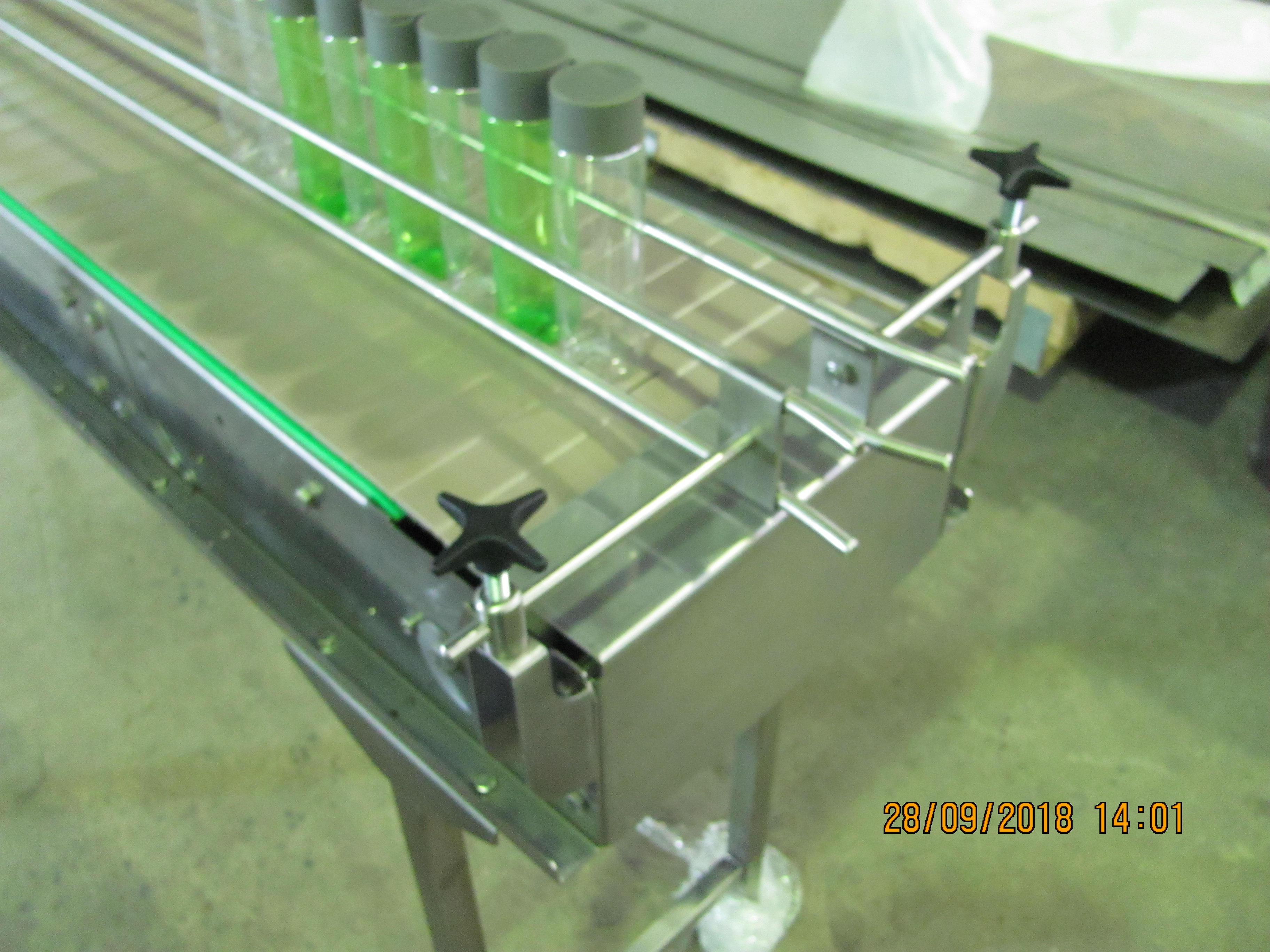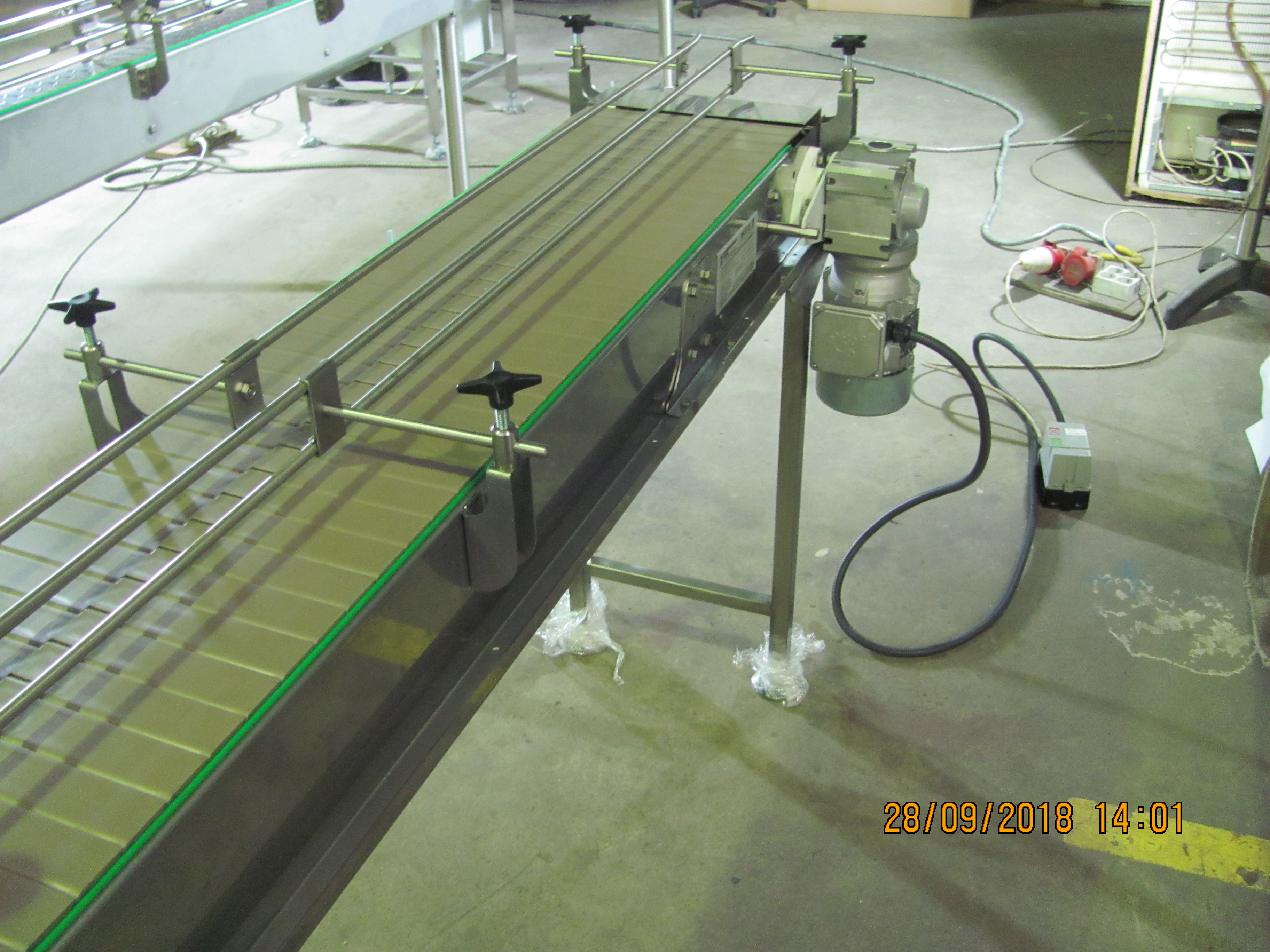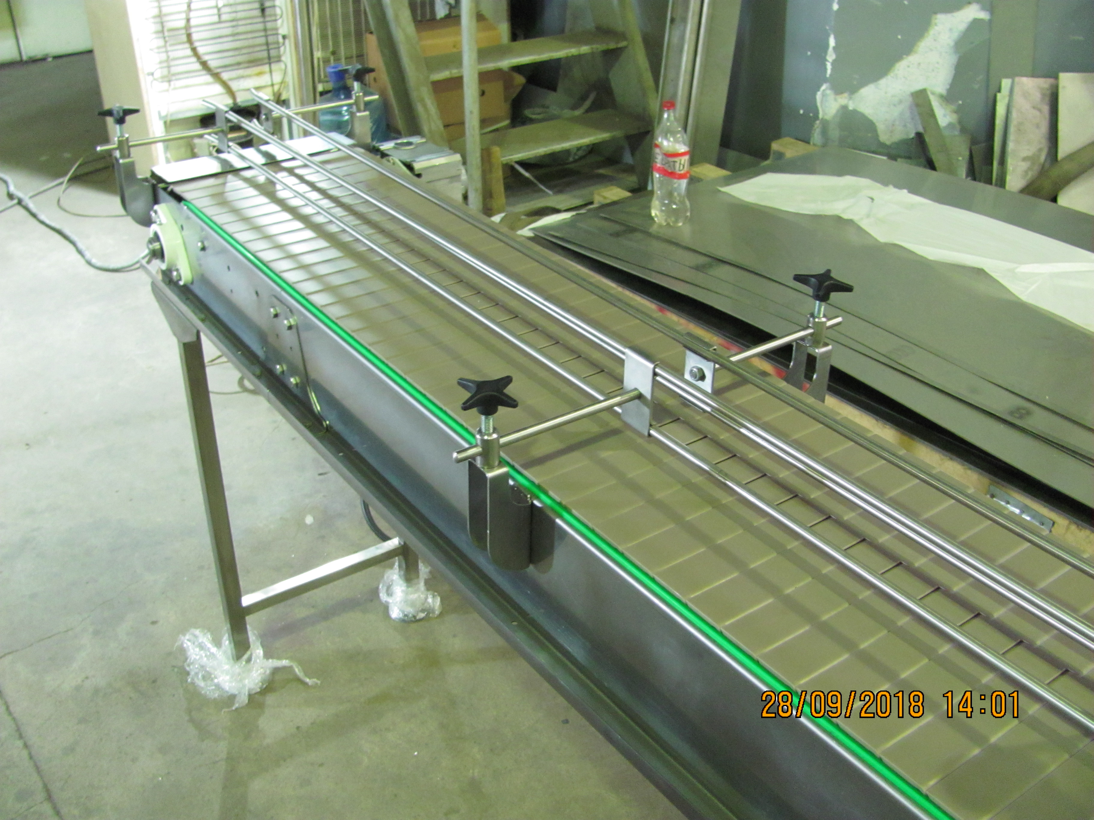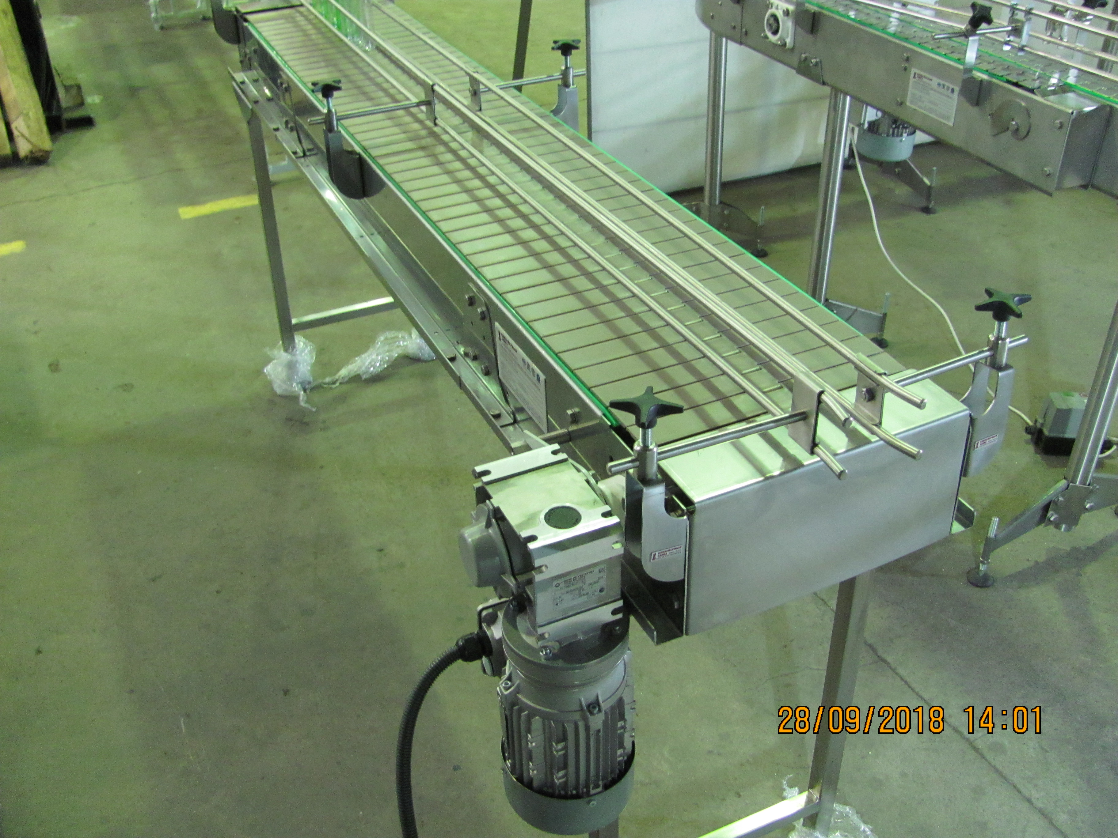 Описание проекта: Для нанесения этикеток на коробки и упаковки, изготовлен пластинчатый конвейер длиной 2000 мм.Для регулировки ширины, использованы кронштейны ограждения из нержавеющей стали с 2-м пластиковым профилем.Ширина пластинчатой цепи из ацетала - 304,8 мм (Италия)Конвейер изготовлен из нержавеющей стали.Скорость движения цепи - 12 м/минПривод 0,25 кВт (Германия)Конвейер изготовлен по специальному заказу за 5 дней.