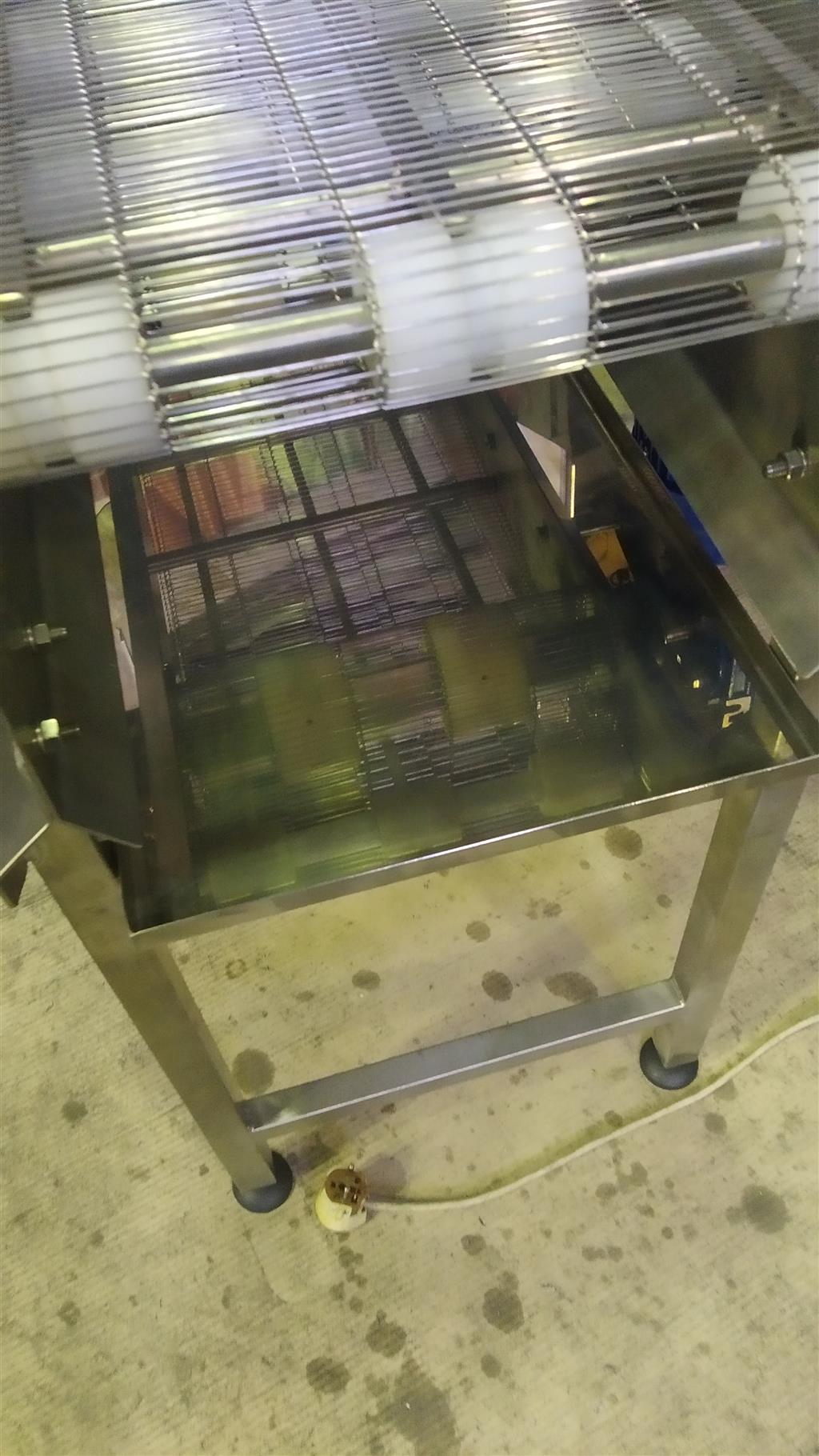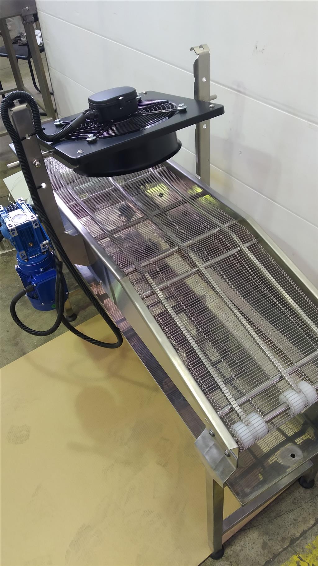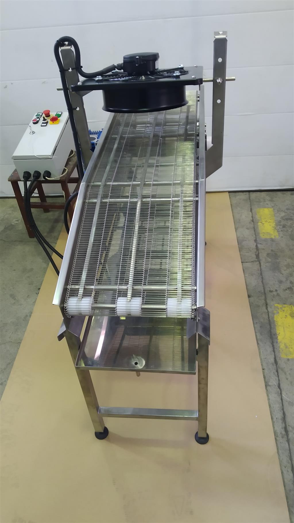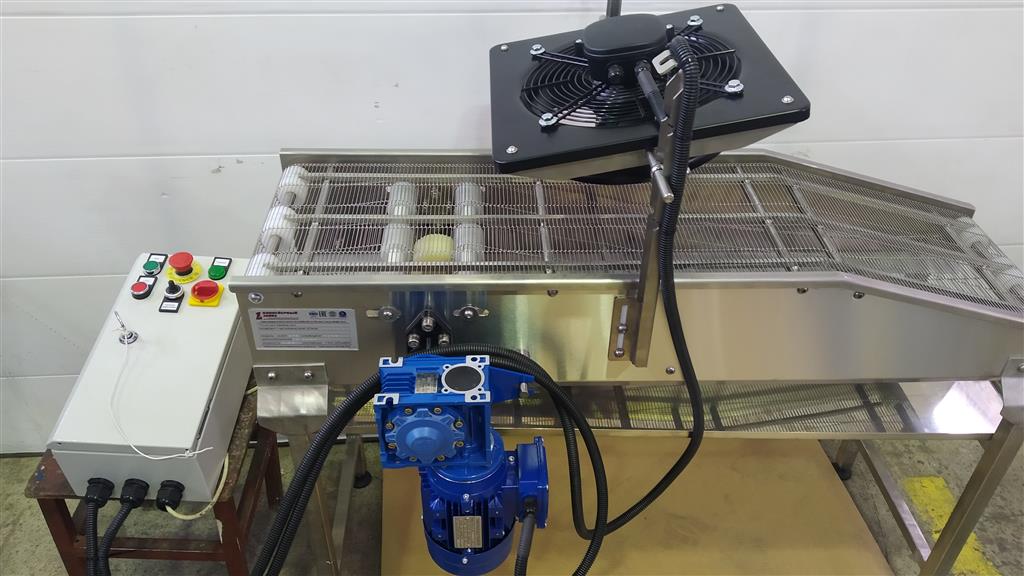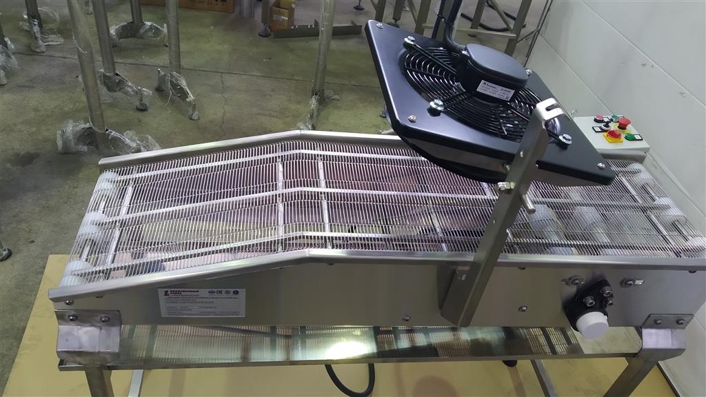 Описание проекта: Для пищевого комбината спроектирован и изготовлен конвейер с глазировочной сеткой, который служит для перемещения фрикаделек. На конвейере установлен вентилятор для обдува продукта. Конвейер состоит из прямого и наклонного участка. Конвейер и глазировочная сетка изготовлены из нержавеющей стали, поддон под конвейером для сбора влаги, ширина сетки 320 мм, длина конвейера 1200 мм, скорость движения сетки 20 м/мин, регулировка скорости частотный преобразователь в шкафу управления.