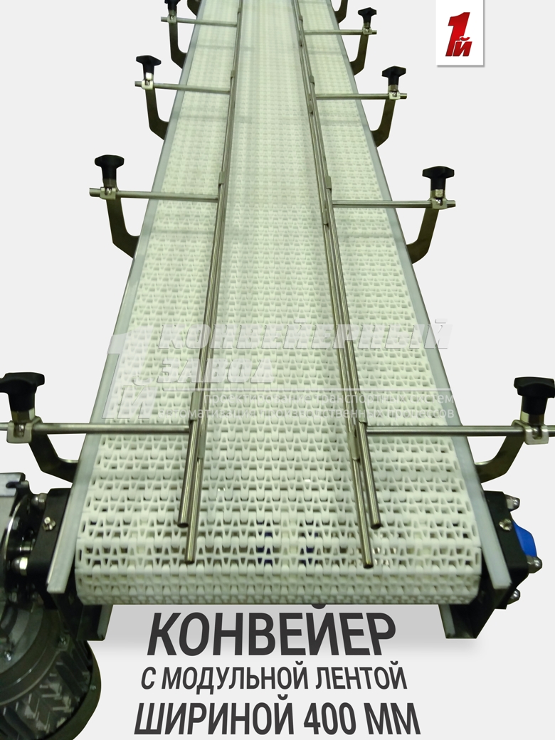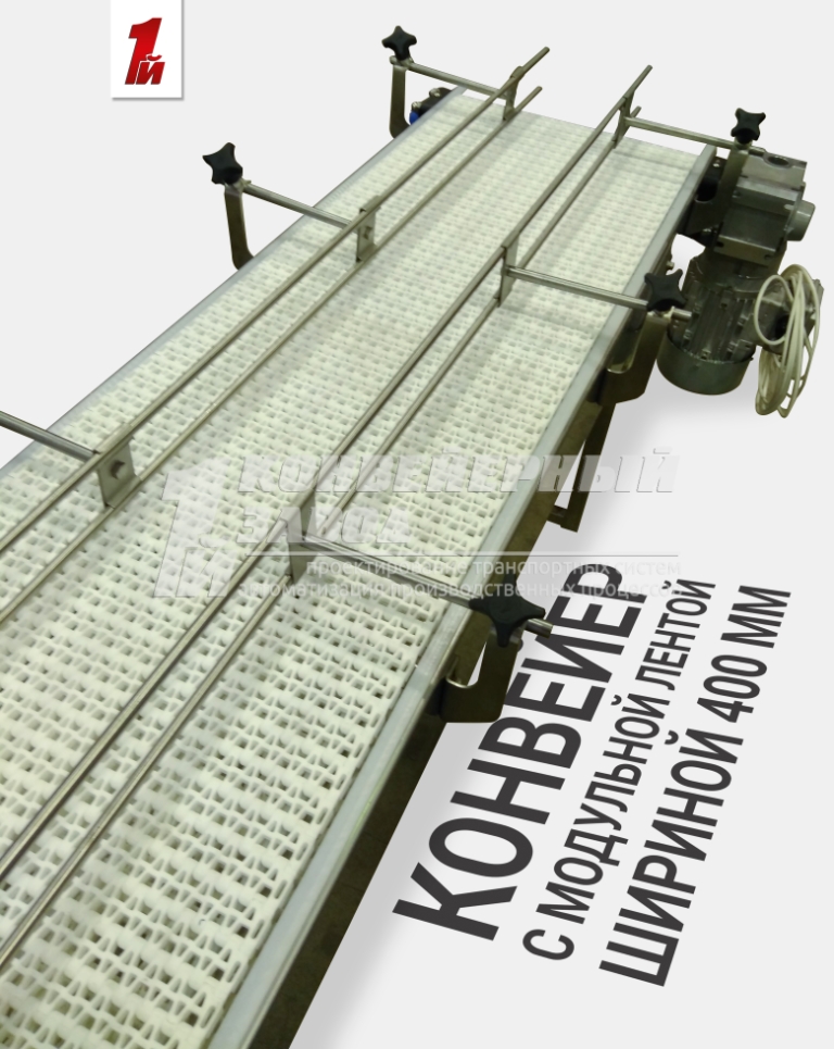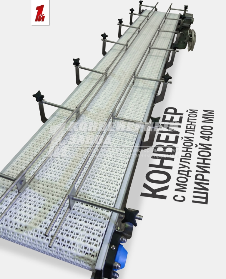 Описание проекта: Изготовлен конвейер с модульной лентой для перемещения канистр 10,20,30,50 литров. Длина конвейера 3000 мм, ширина модульной ленты 400 мм, двойные кронштейны ограждения регулируются по ширине от 190 до 355 мм, материал конвейера - нержавеющая сталь. Привод 0,55 кВт (Европа), скорость 10 м/мин.