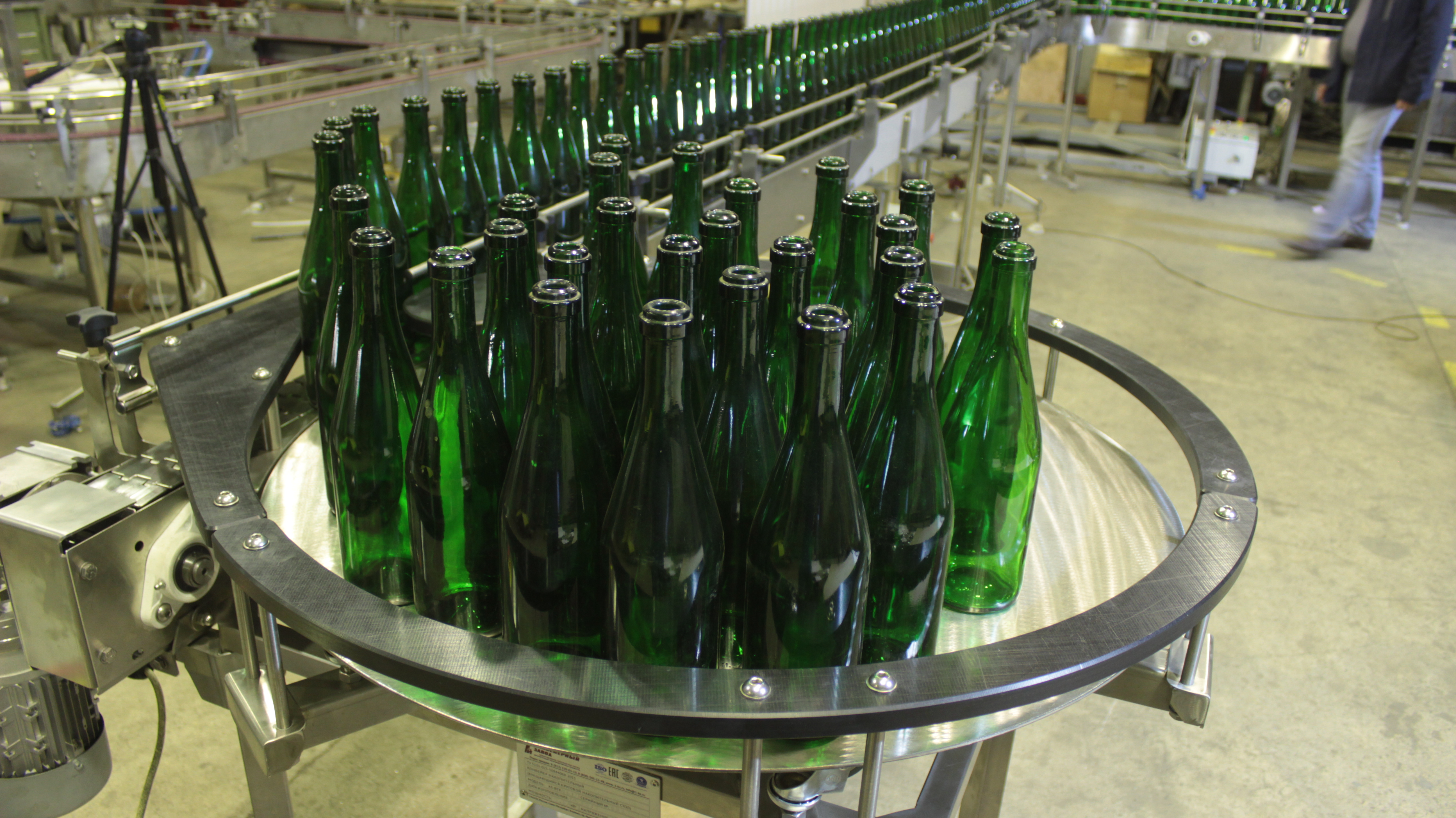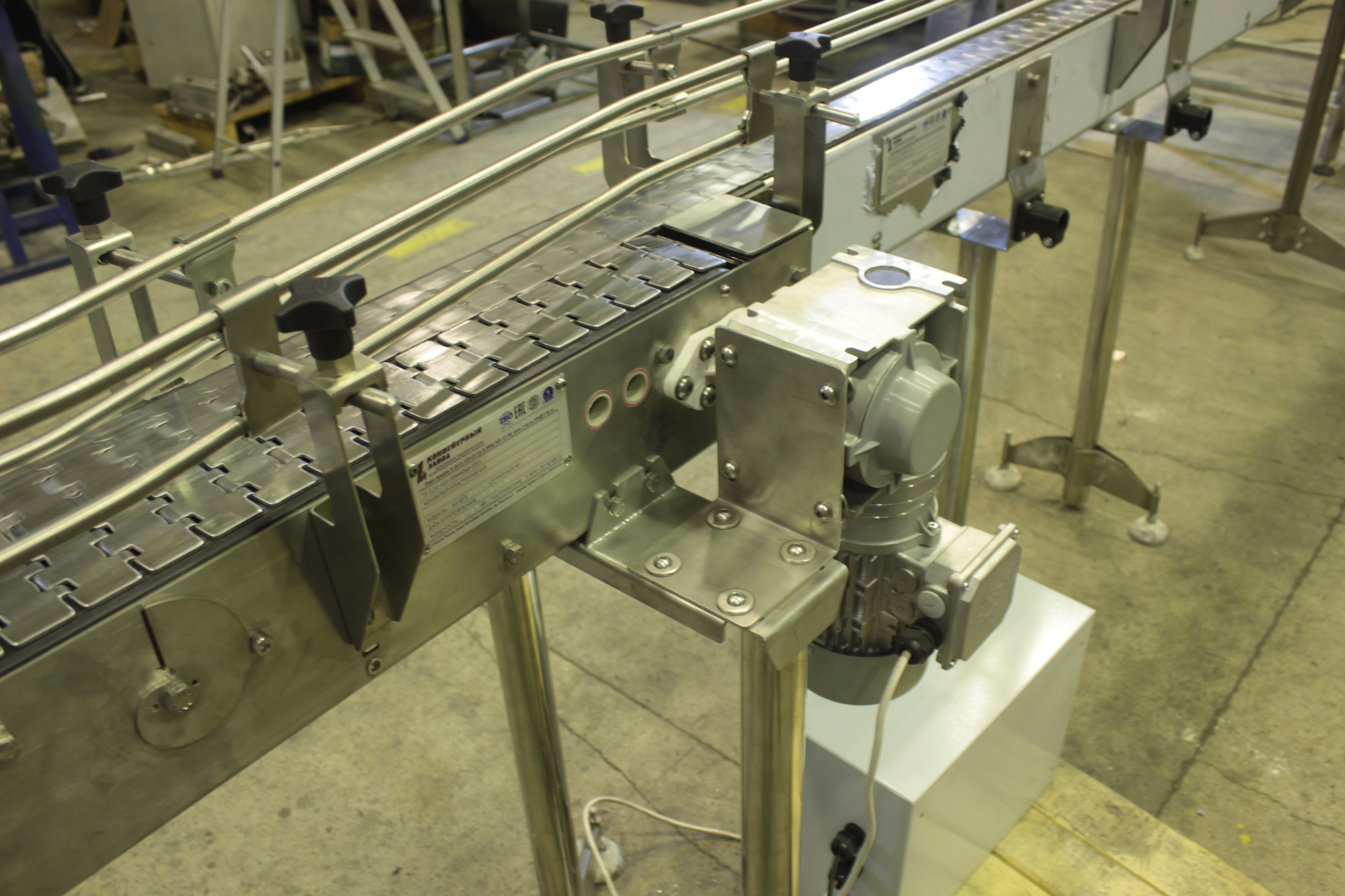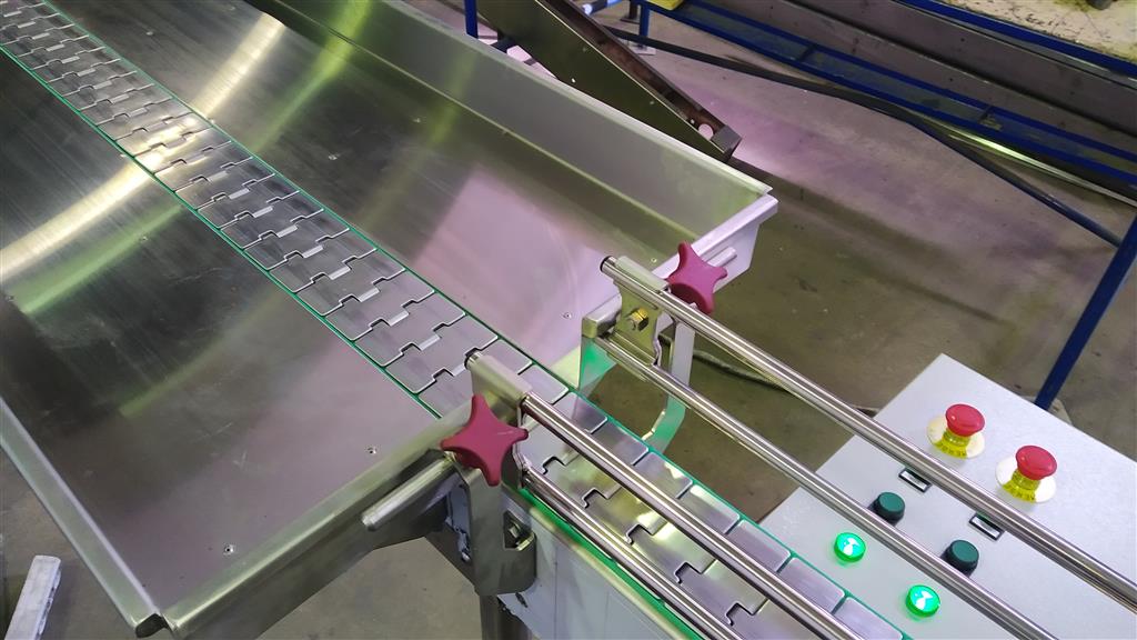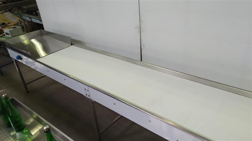 Описание проекта: Для линии розлива пива изготовлена конвейерная система.В состав конвейерной системы входит:1. Депаллетайзер полуавтоматический.2. Стол прямоугольный разгрузочный с модульной лентой и разгонным 2-х рядным пластинчатым конвейером.3. Стол круглый, накопительный, вращающийся.4. 2 пластинчатых конвейера с переходной секцией.5. Система осушения Sonic Air Systems.6. Рольганг не приводной.Все конвейеры изготовлены из нержавеющей стали.Мотор-редукторы (Nord, Германия)Модульная лента (Habasit, Швейцария)