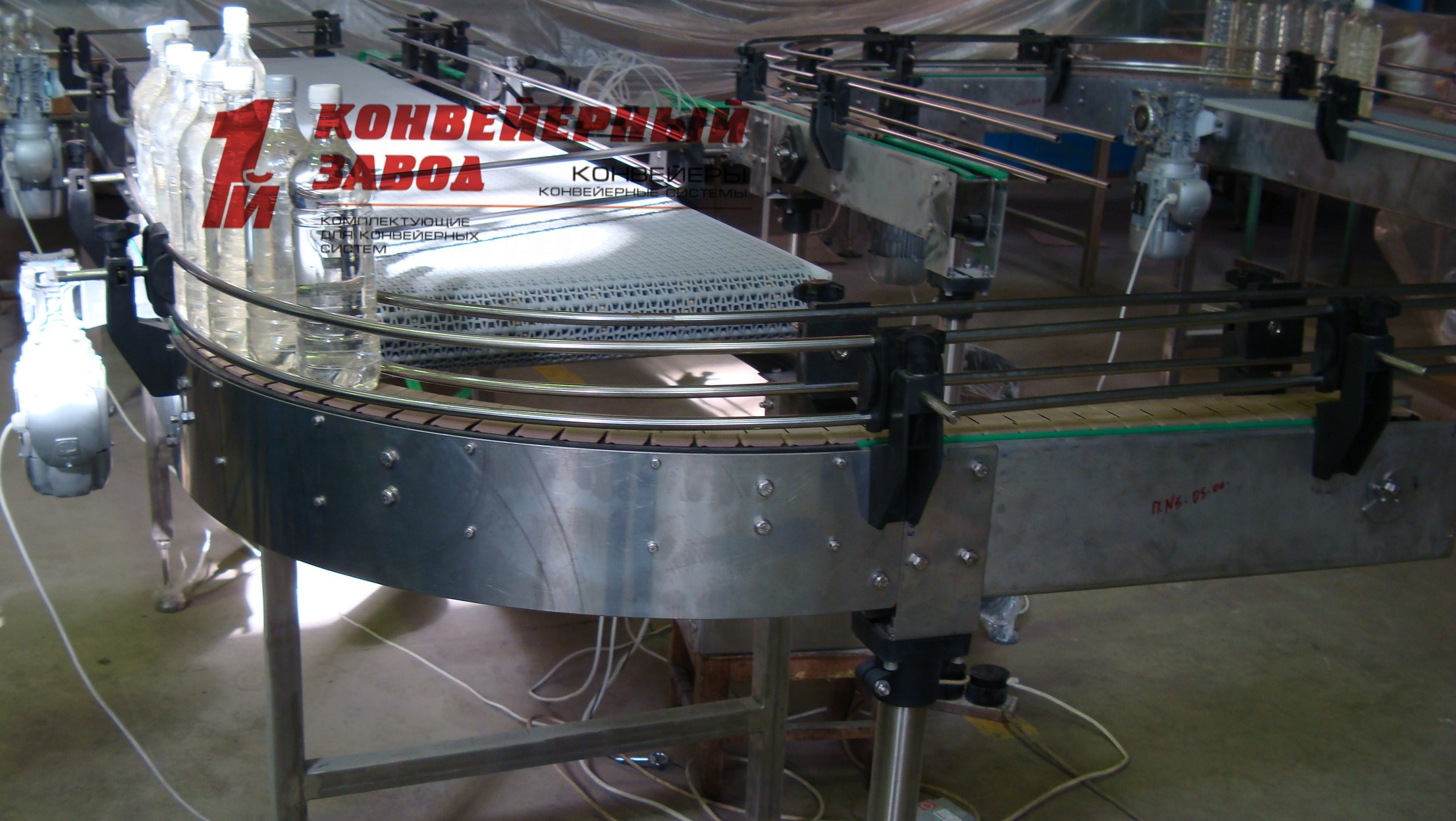 Описание проекта: Для одного из наших партнеров в Республики Казахстан была спроектирована и изготовлена конвейерная система, которая включает в себя: буферные накопительные столы с модульной лентой и поворотные пластинчатые конвейера с цепью из пластика для перемещения и накопления ПЭТ бутылок с пивом. Все конвейера изготовлены из нержавеющей стали, с частотными преобразователями, привода (Италия). Общая длина конвейеров более 20 метров.