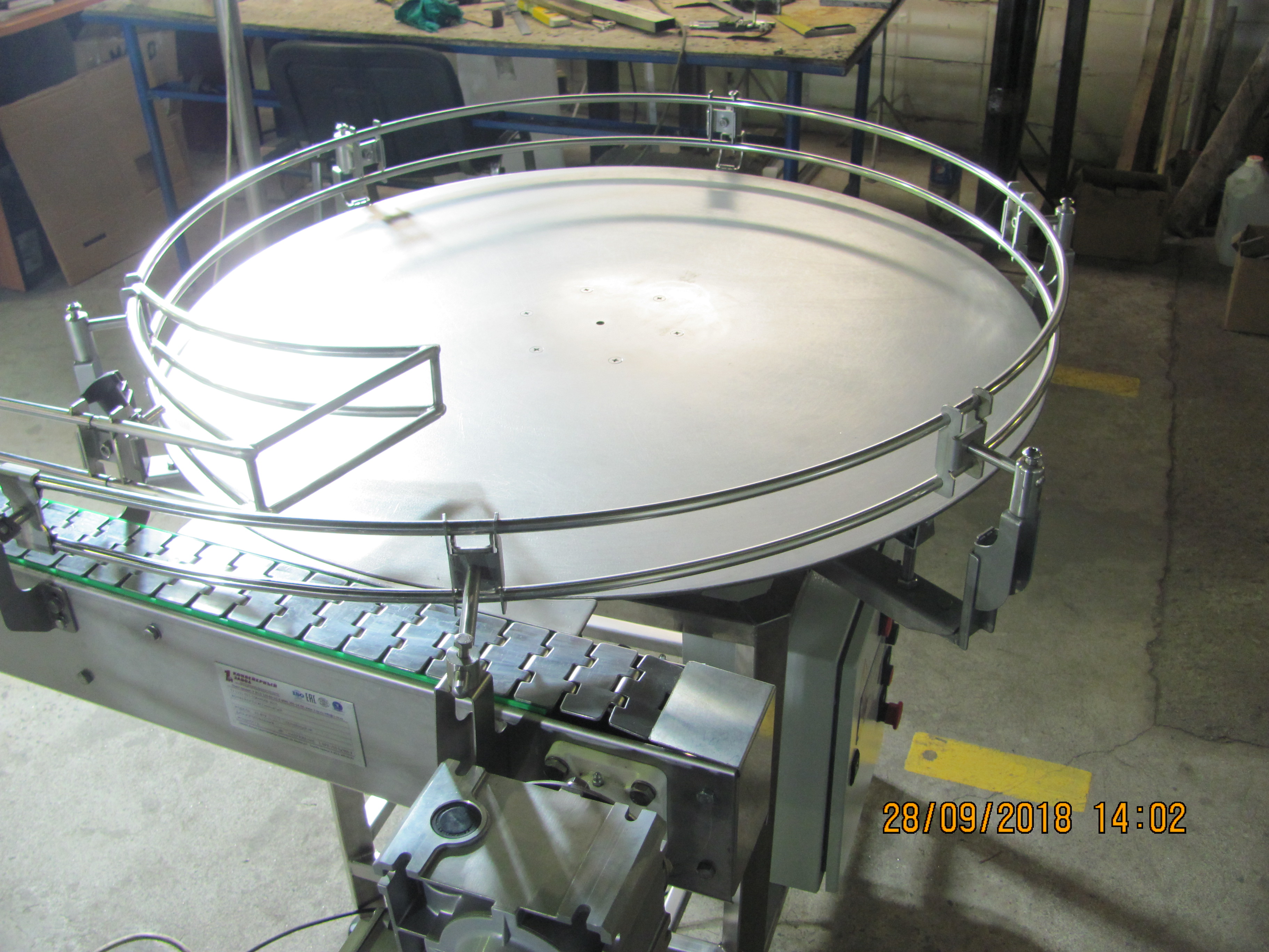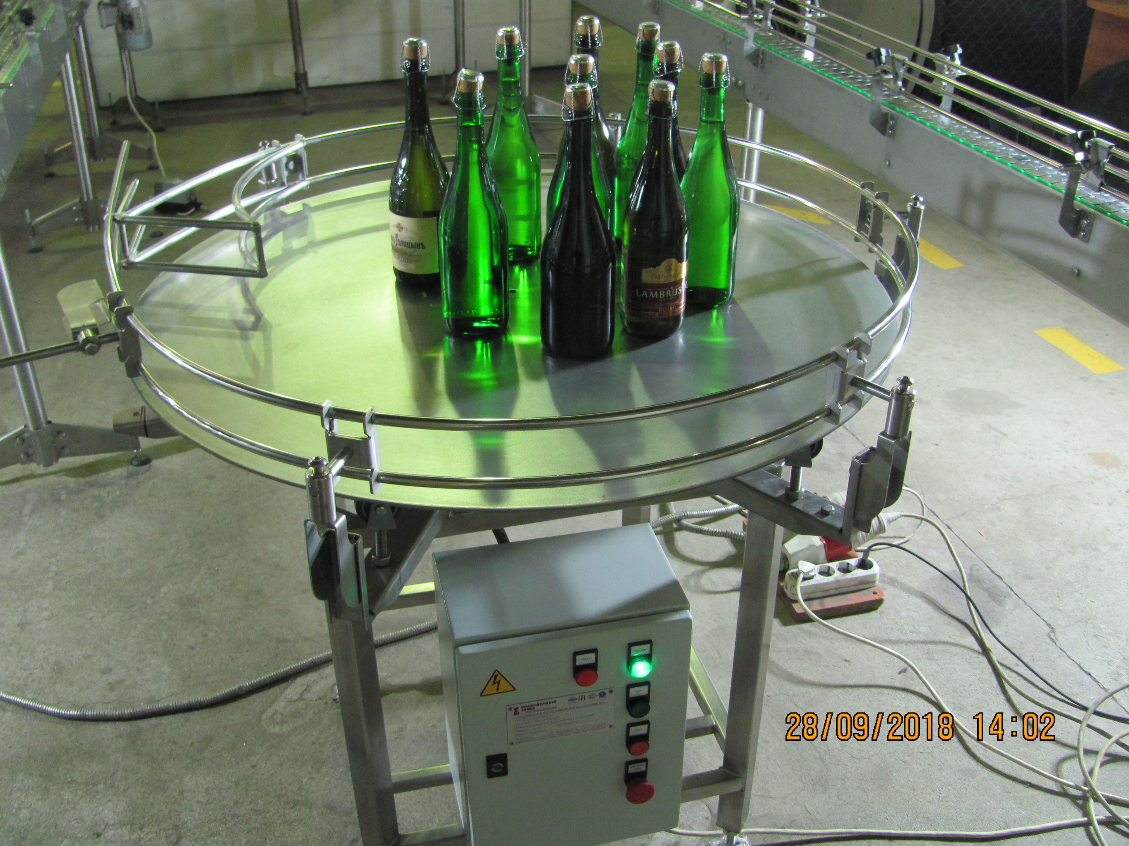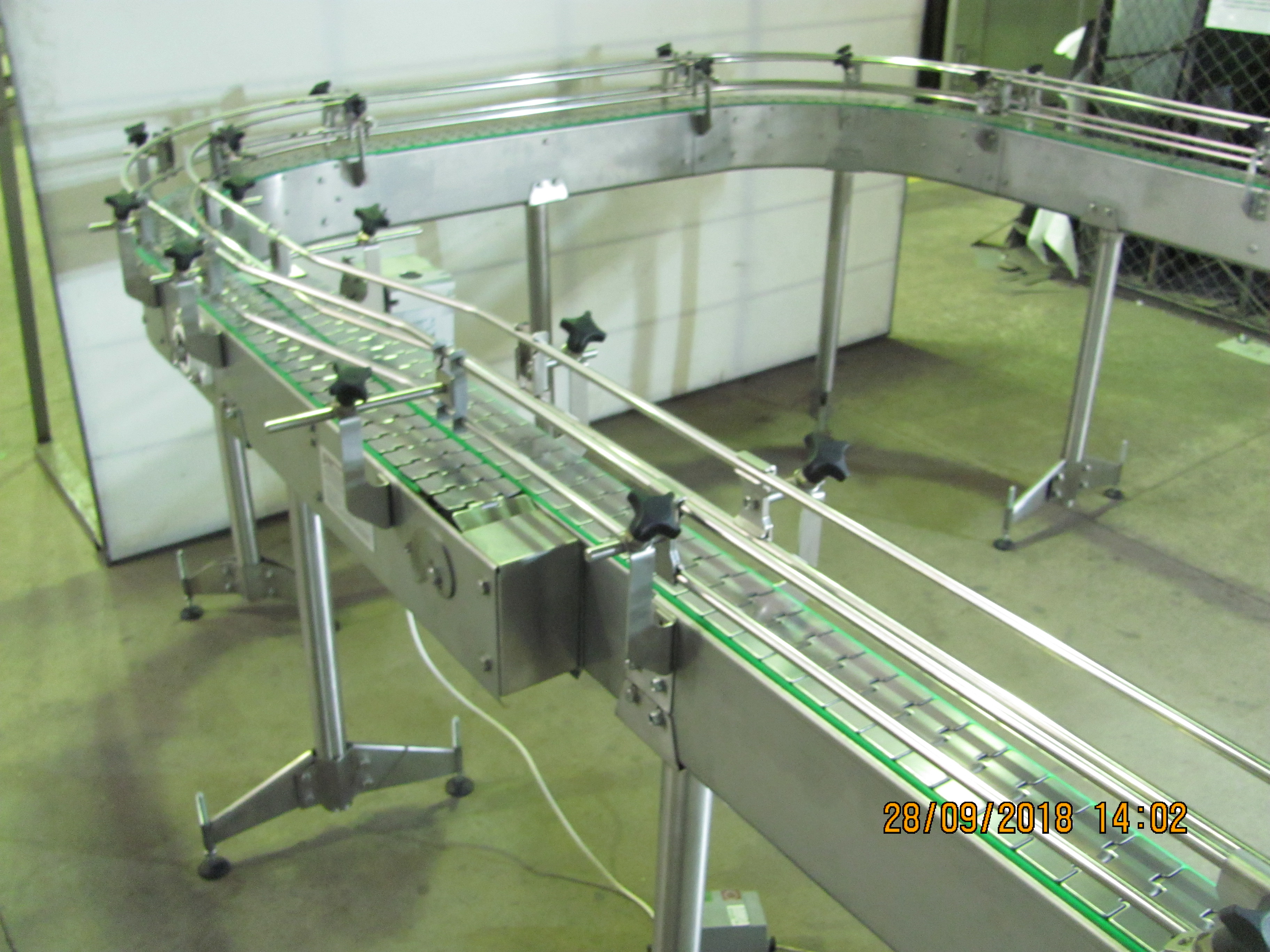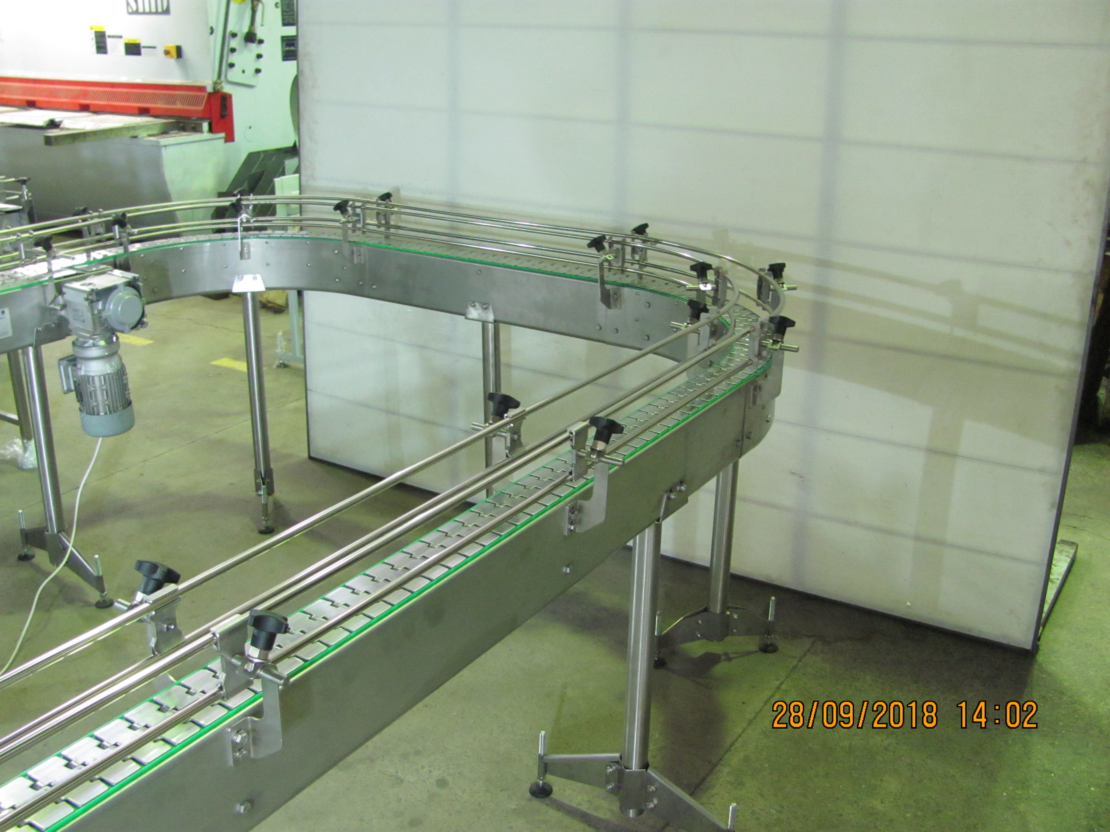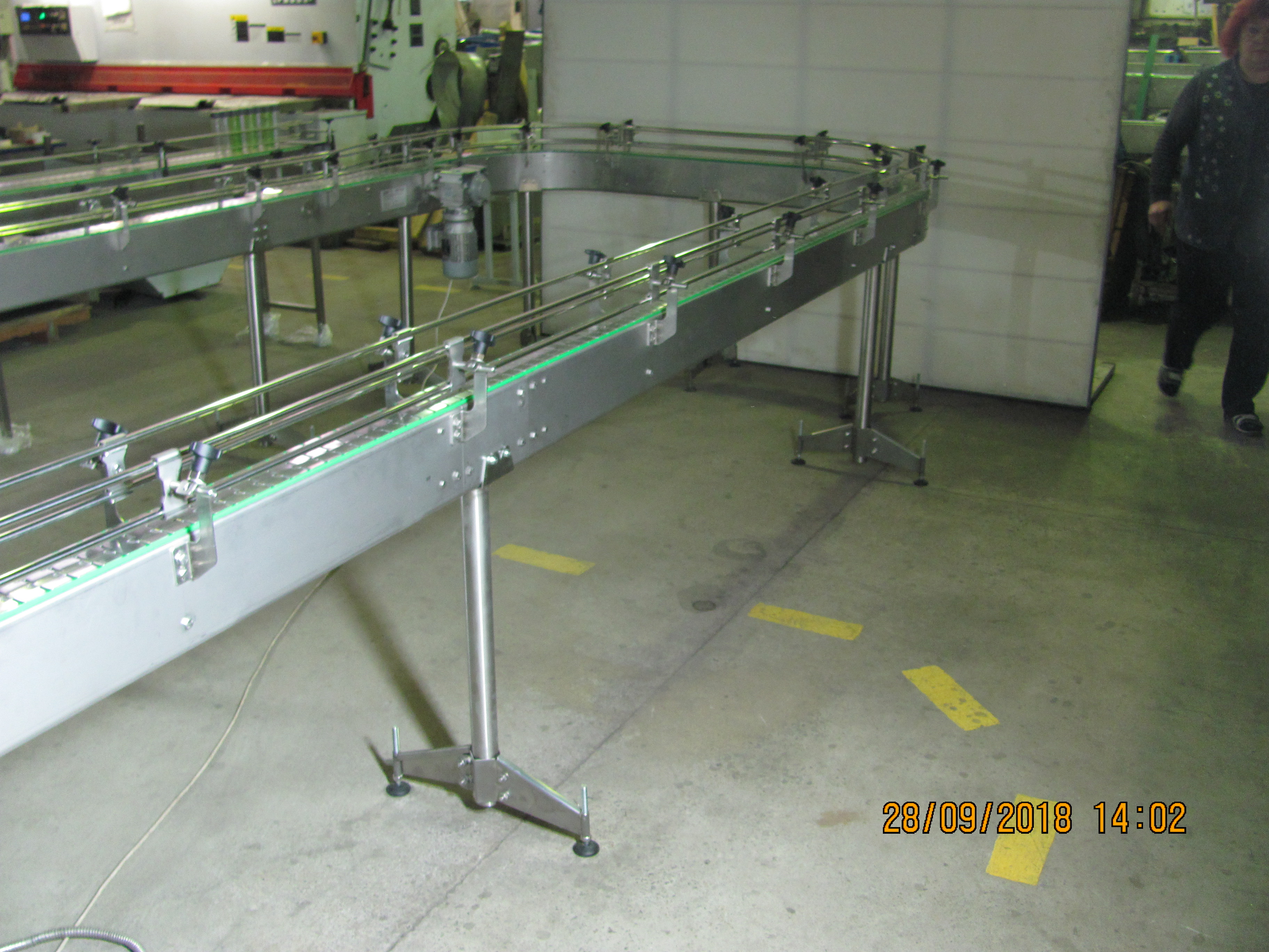 Описание проекта: Изготовлена конвейерная система для перемещения бутылок с ЛВИ разного диаметра.В состав конвейеров входят: 2 поворотных пластинчатых конвейера с нержавеющей цепью шириной 82,5 мм и 2 накопительных стола O 1000 ммМатериал изготовления конвейеров, опор и кронштейнов ограждения - нержавеющая сталь.Скорость движения цепи - 8 м/мин;Приводы 0,37 и 0,75 кВт (Германия);Регулировка скорости - инвертер в шкафу управления;Производительность линии - 3000 б/ч;