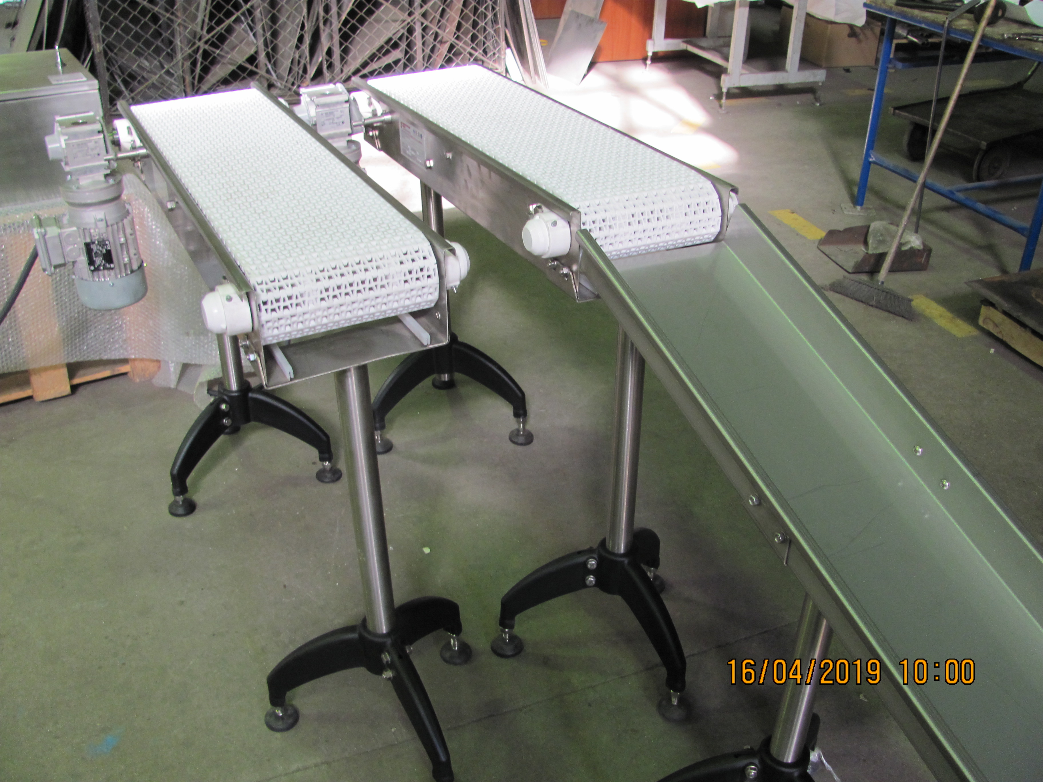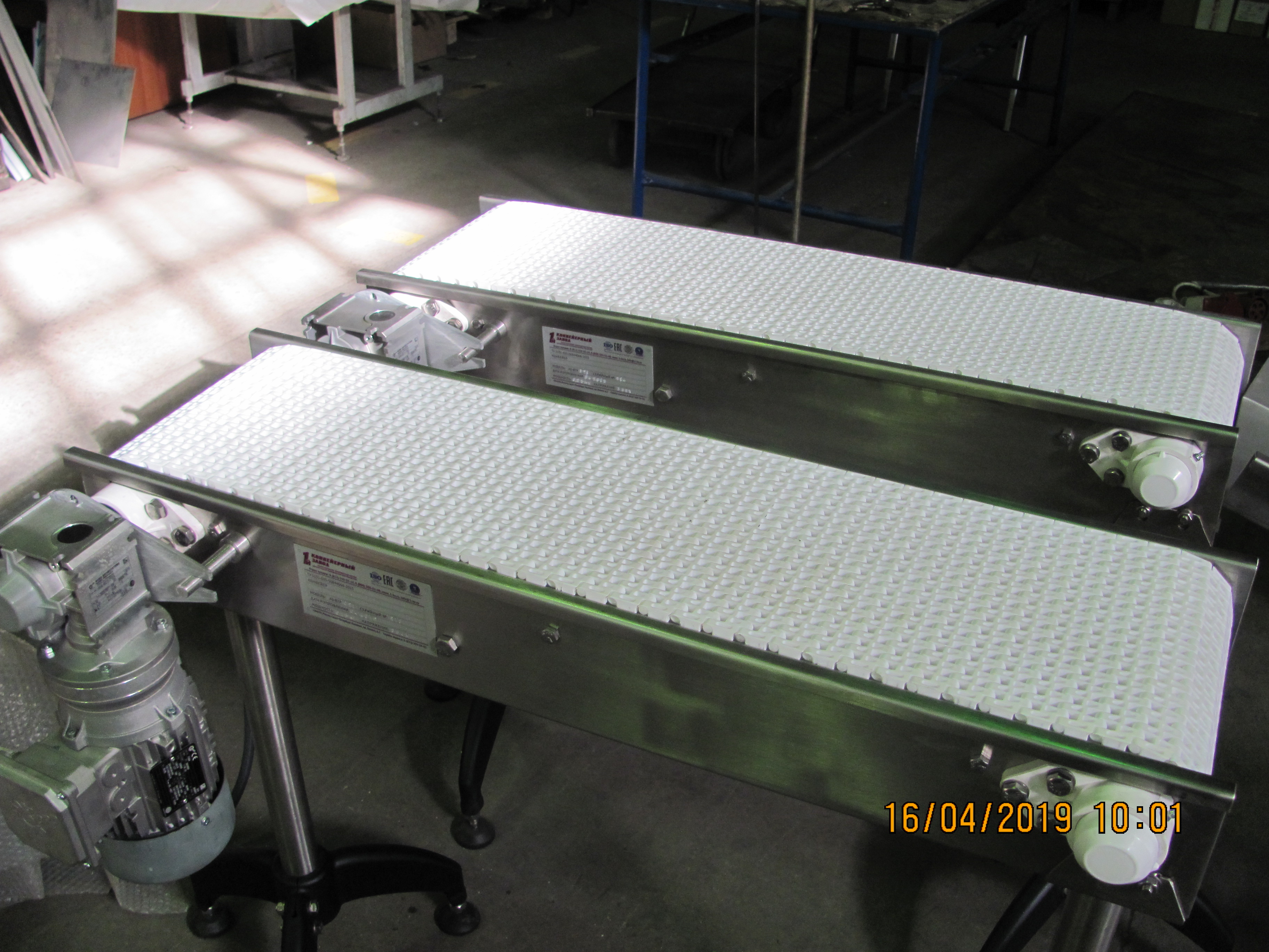 Описание проекта: Изготовлены 2 конвейера с модульной лентой, которые предназначены для перемещения пачек с маслом и нанесения на них этикеткии даты.длина конвейеров 1000 мм;ширина модульной ленты 250 мм;высота конвейеров 750-1050 мм;наклонный склиз длиной 1000 мм;шкаф управления с частотными преобразователями;привод (Германия);материал конвейеров, склиза и шкафа - нержавеющая сталь;