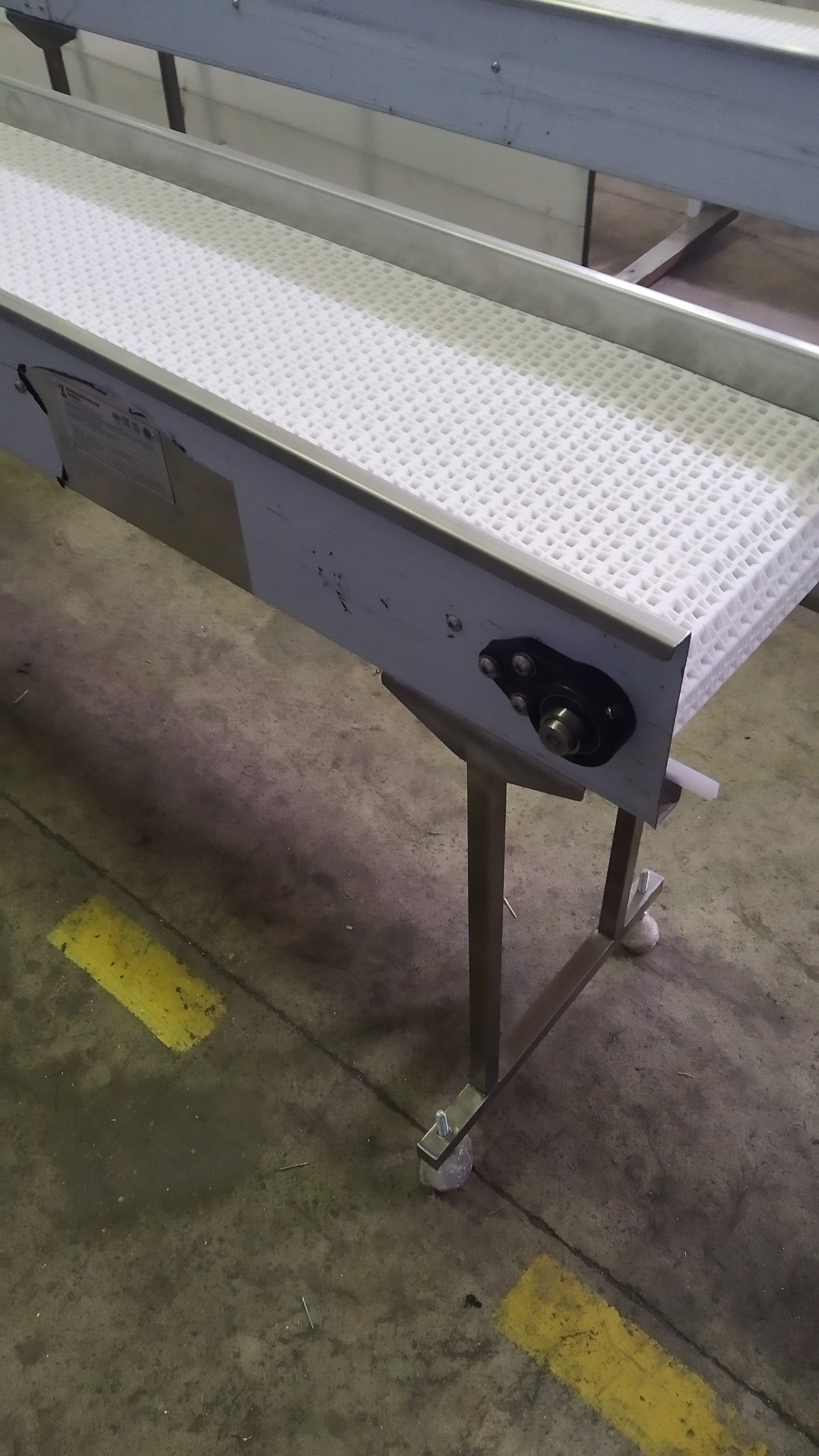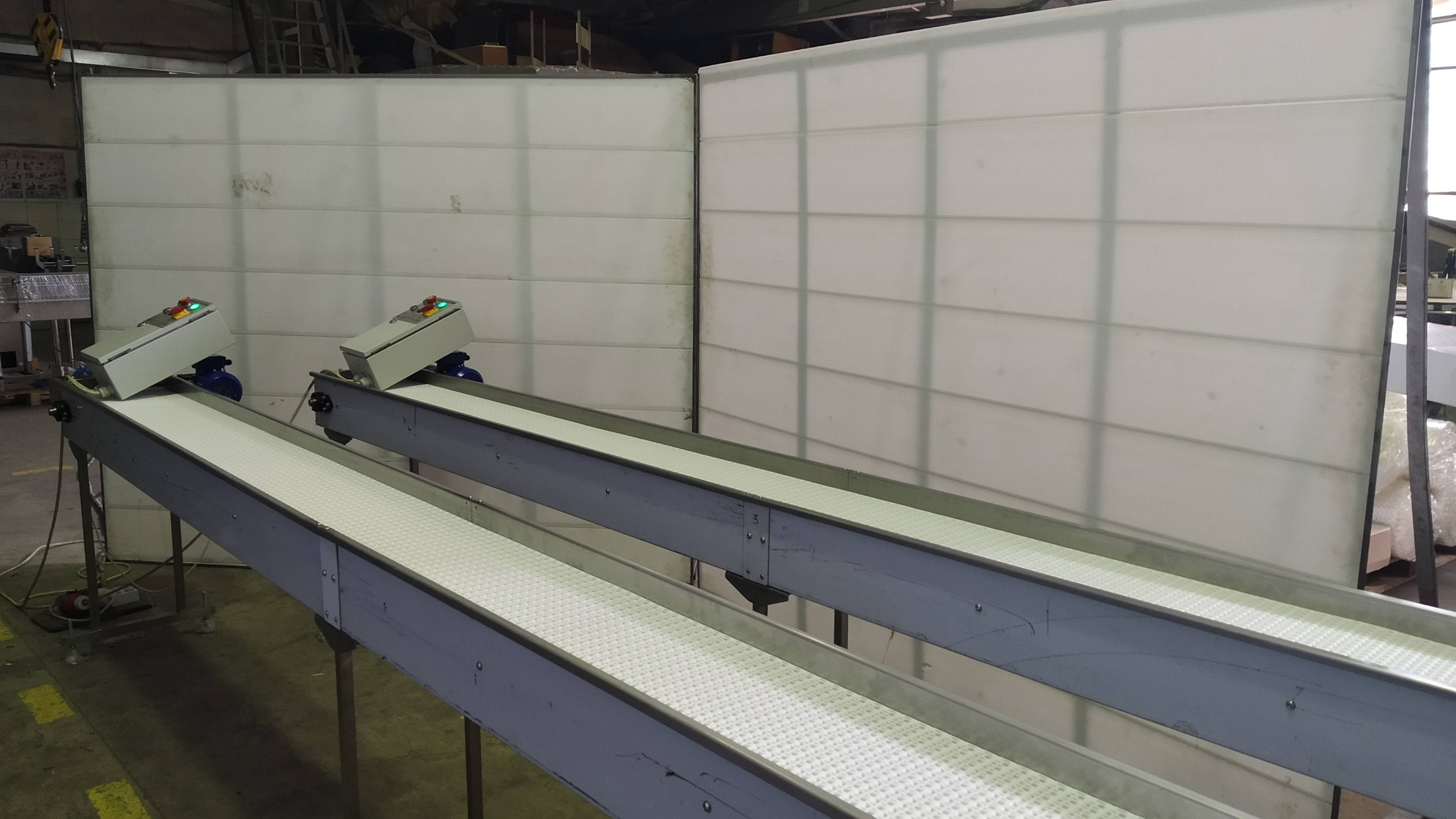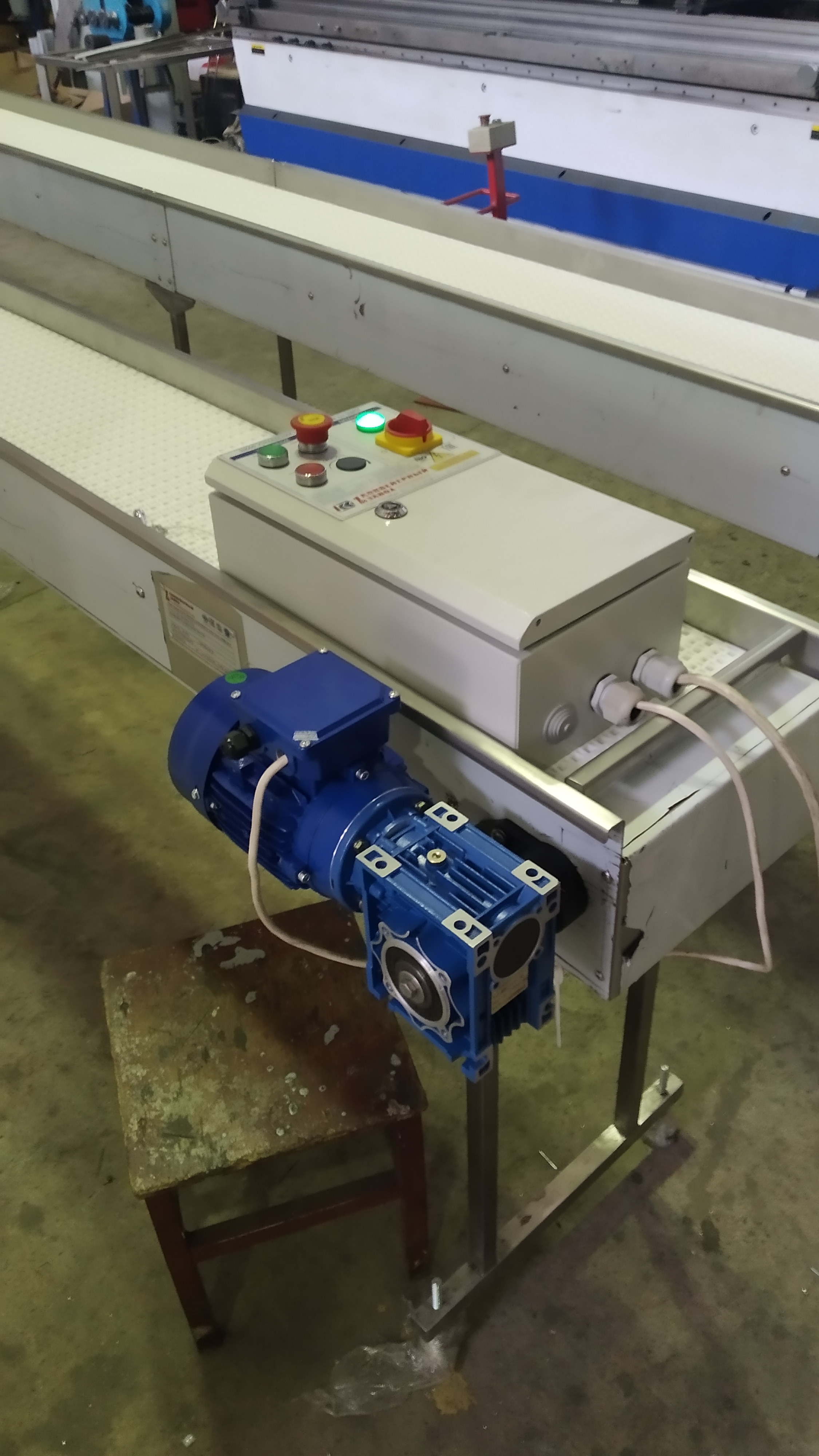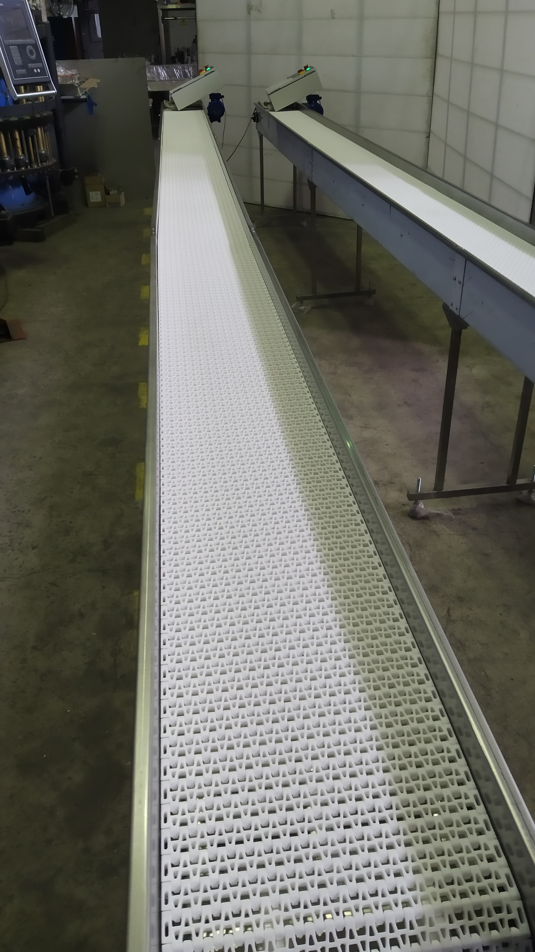 Описание проекта: Для крупного пищевого комбината в Республике Казахстан, изготовлены 2 конвейера с модульной лентой для перемещения пакетов с майонезом.Технические характеристики конвейеров:длина конвейеров - 6700 мм;ширина модульной ленты - 300 мм;материал конвейеров - нержавеющая сталь;привод: мотор-редуктор NMRW;шкаф управления с частотным преобразователем;