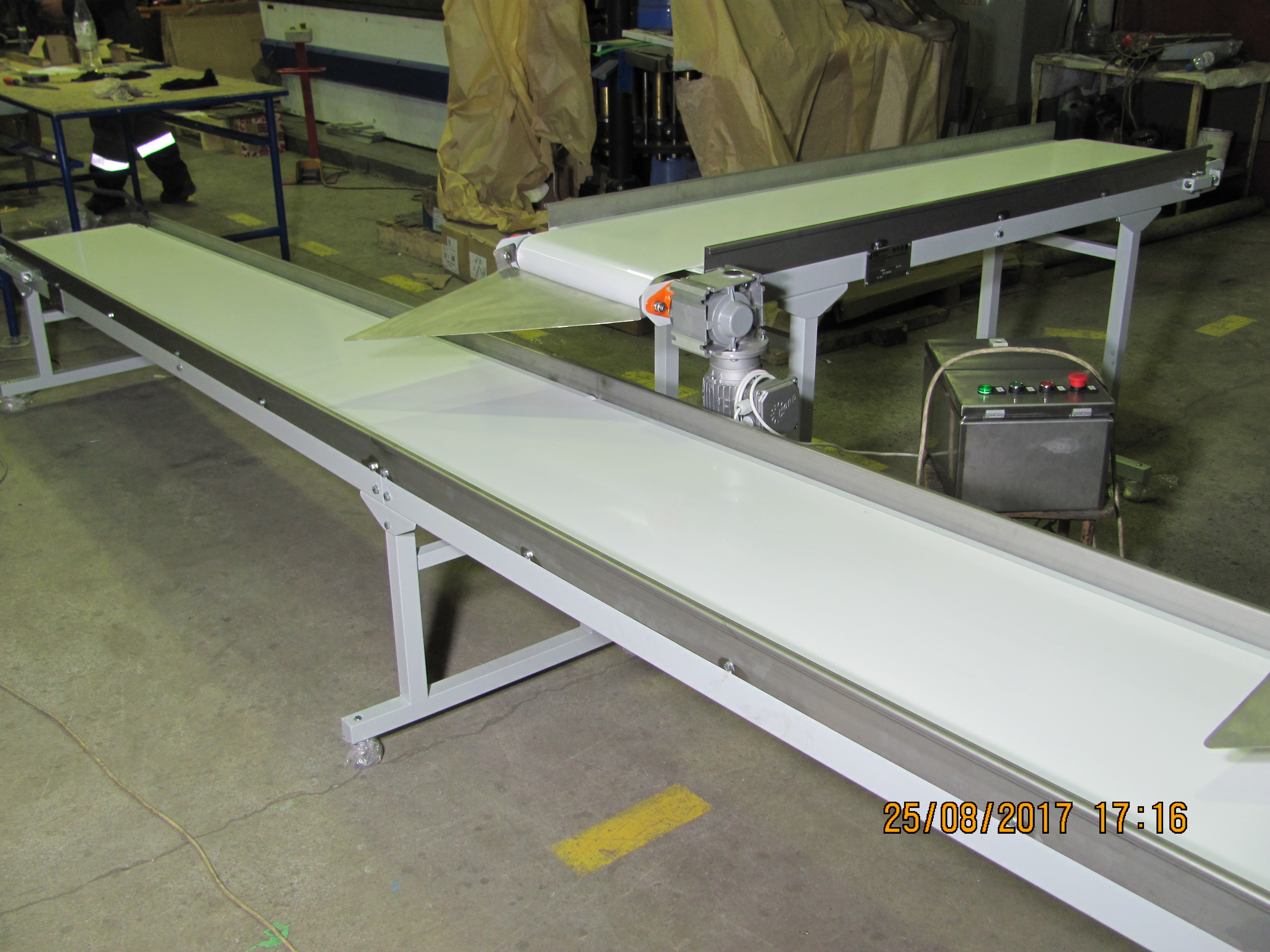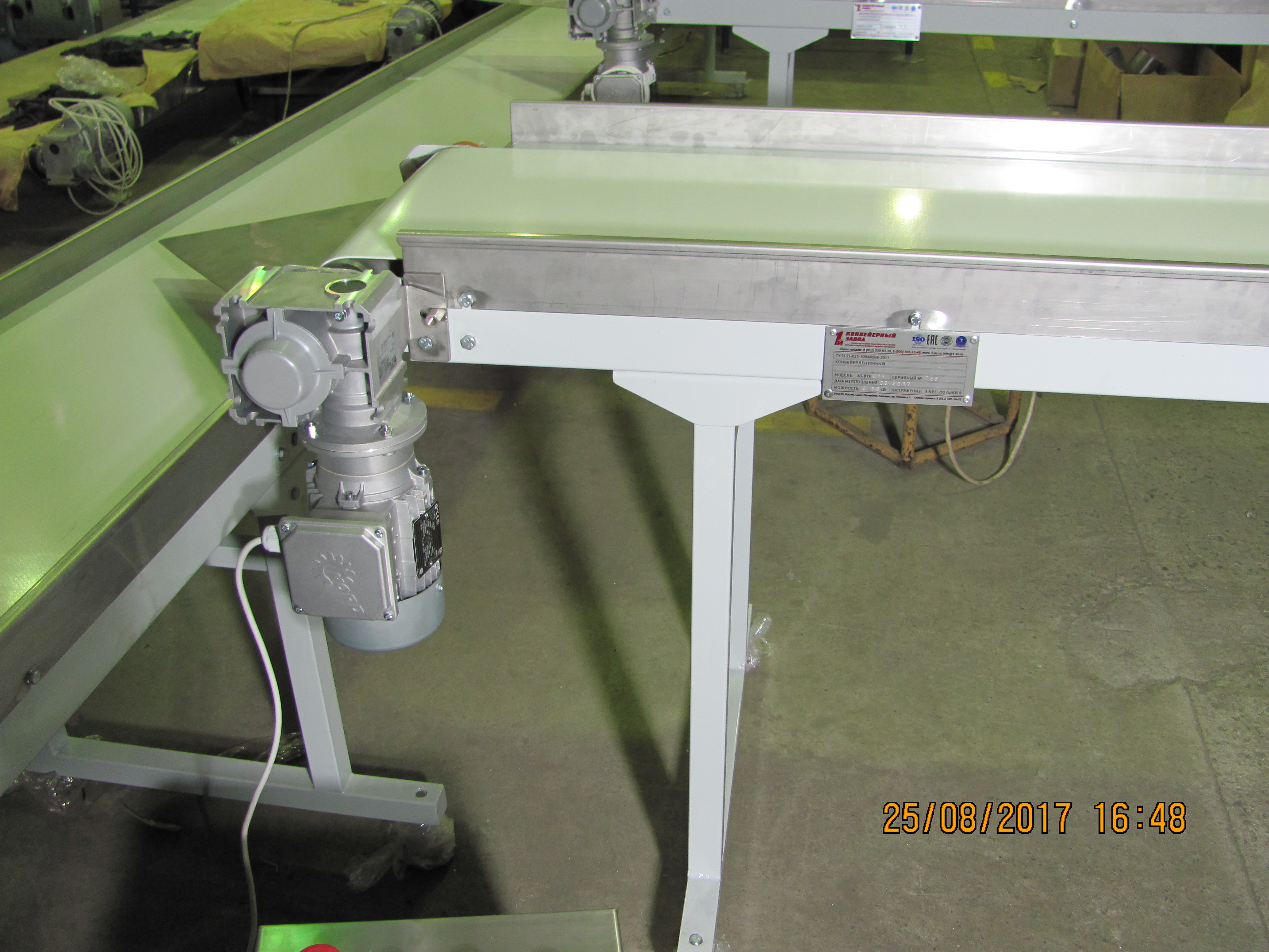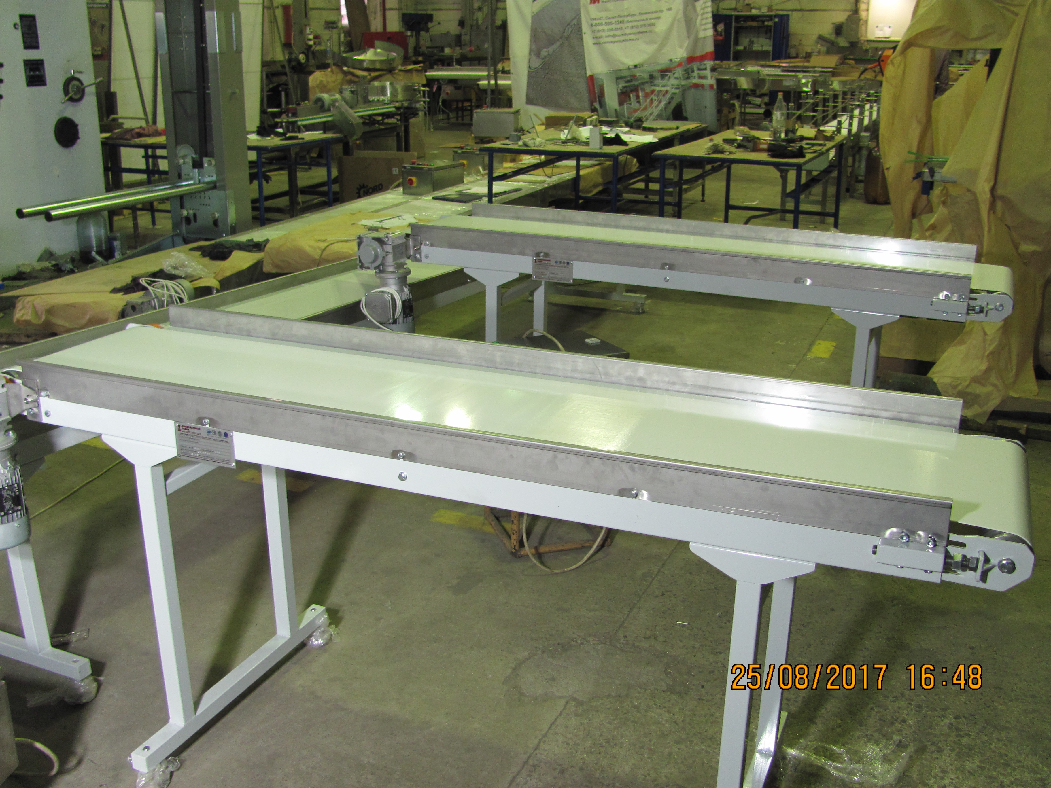 Описание проекта: Изготовлены и отгружены 3 ленточных конвейера для перемещения пельменей. 2 ленточных конвейера стоят после машин изготовления пельменей и перемещают их на общий конвейер, который перемещает пельмени на спиральный морозильный конвейер.Длина конвейеров 2 и 7 метров, ширина ленты ПВХ 400мм, скорость движения ленты 5 м/мин, с регулировкой скорости (инвертер), материал конвейеров - углеродистая сталь с порошковой окраской RAL 7035, привод 0,37 и 0,75 кВт (Германия)