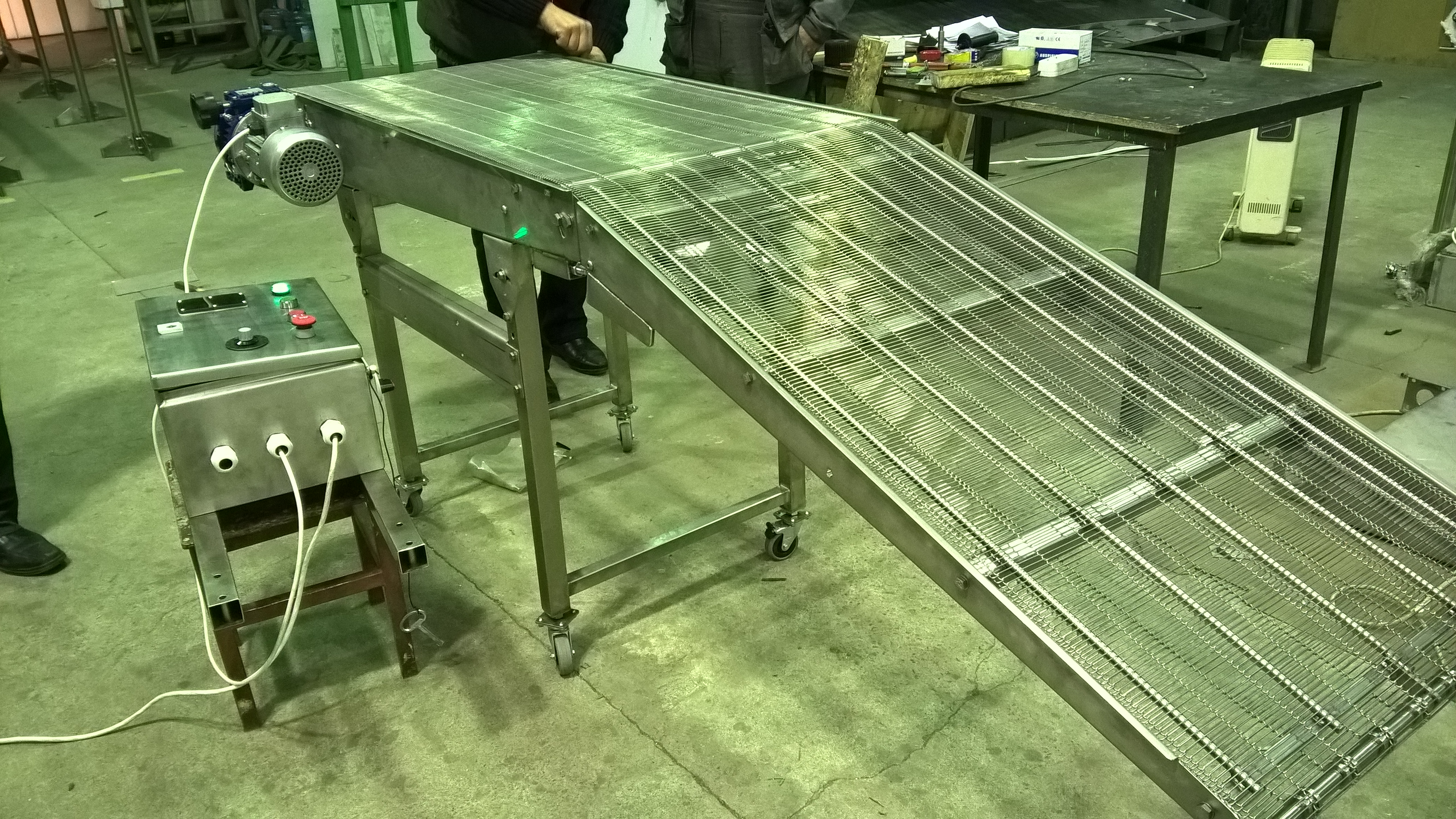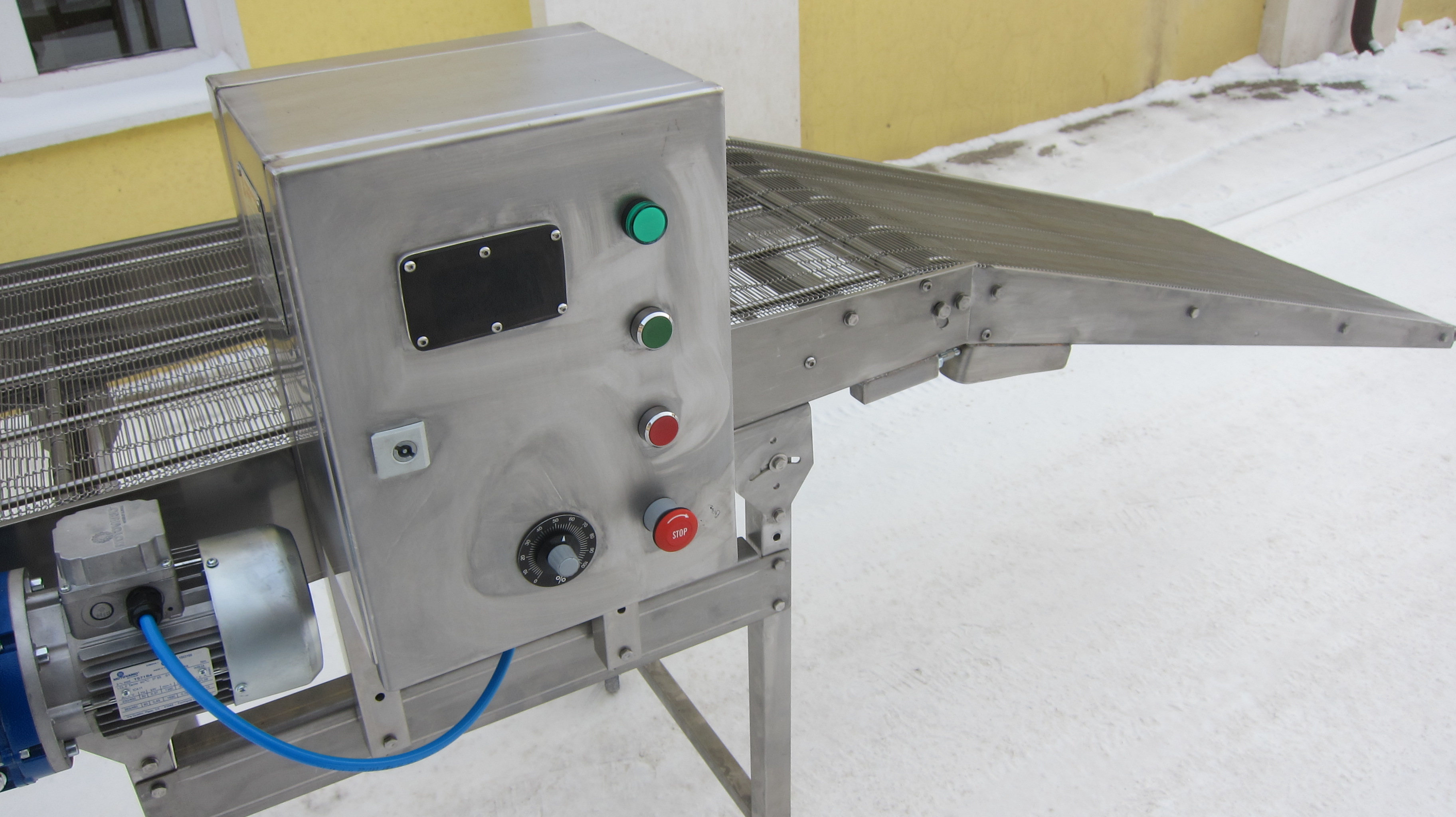 Описание проекта: Изготовлен универсальный мобильный конвейер с глазировочной сеткой и консольной частью с изменяемым углом наклона для пищевых производств. Конвейер полностью изготовлен из пищевой нержавеющей стали, шкаф управления с частотным преобразователем выполнен с защитой от пыли и воды в соответствии со степенью защиты IP 65.Технические характеристики:длина конвейера 2250мм;ширина сетки 610мм;ножевой переход O20мм;высота 960-560мм;скорость движения сетки 2-40м/мин;