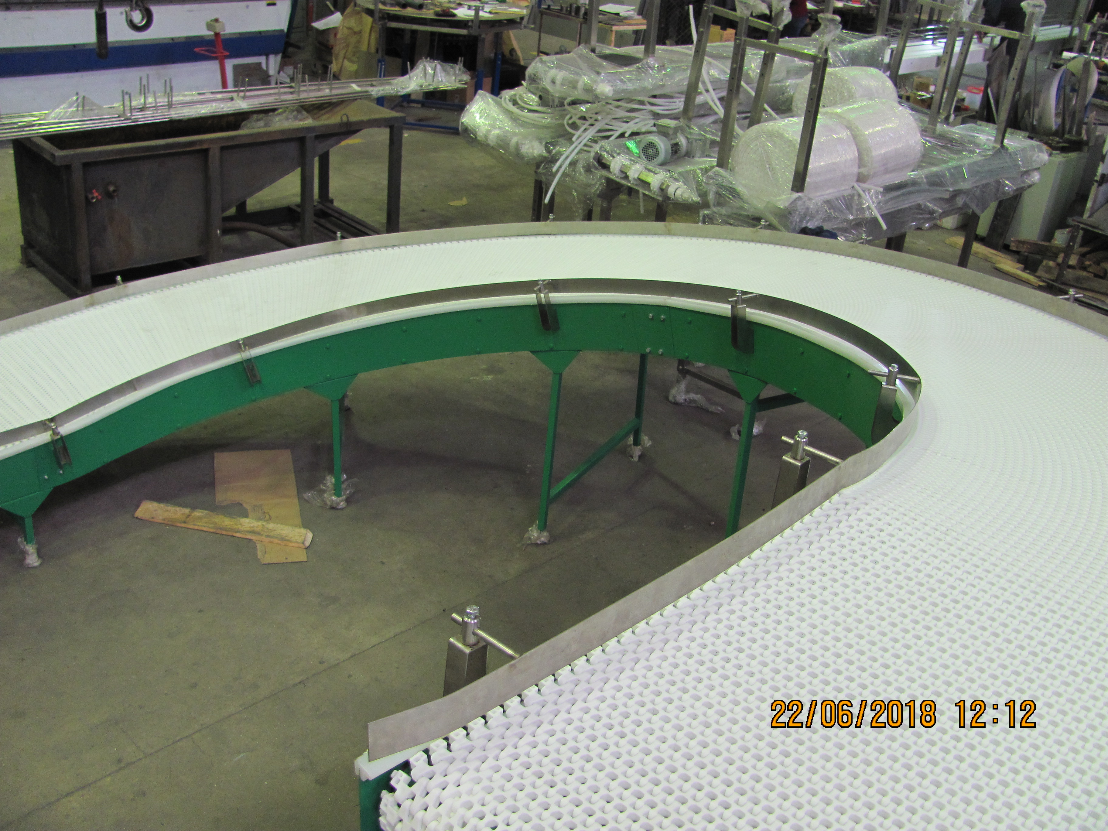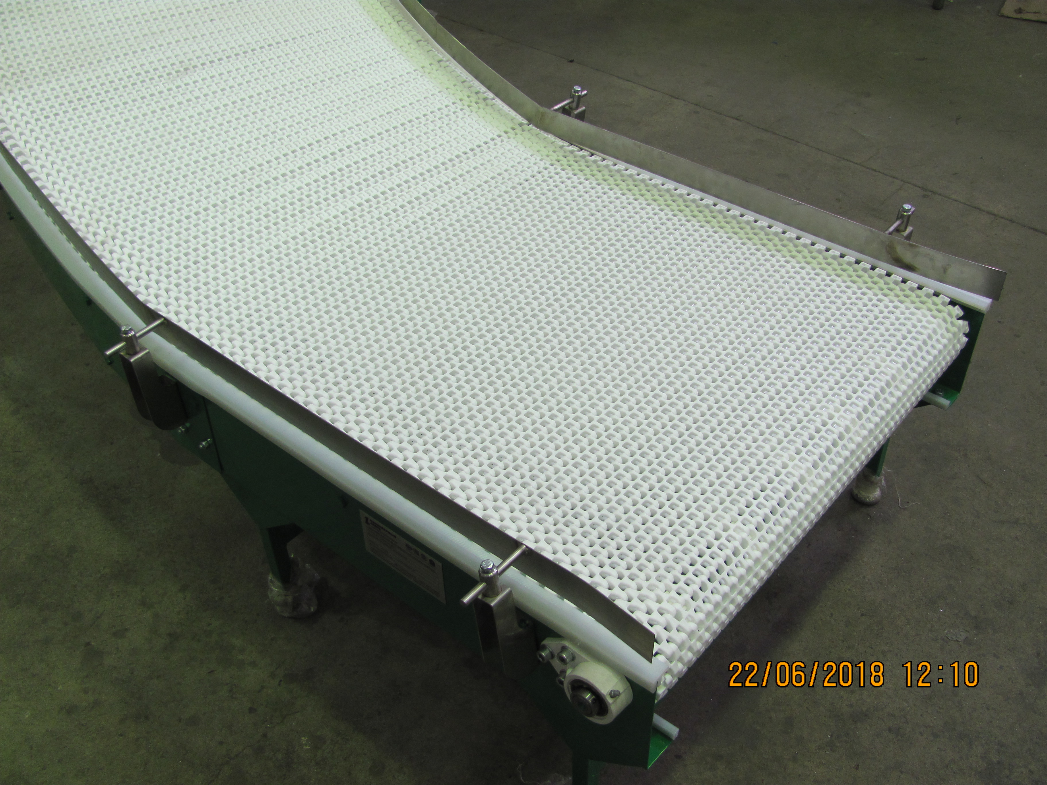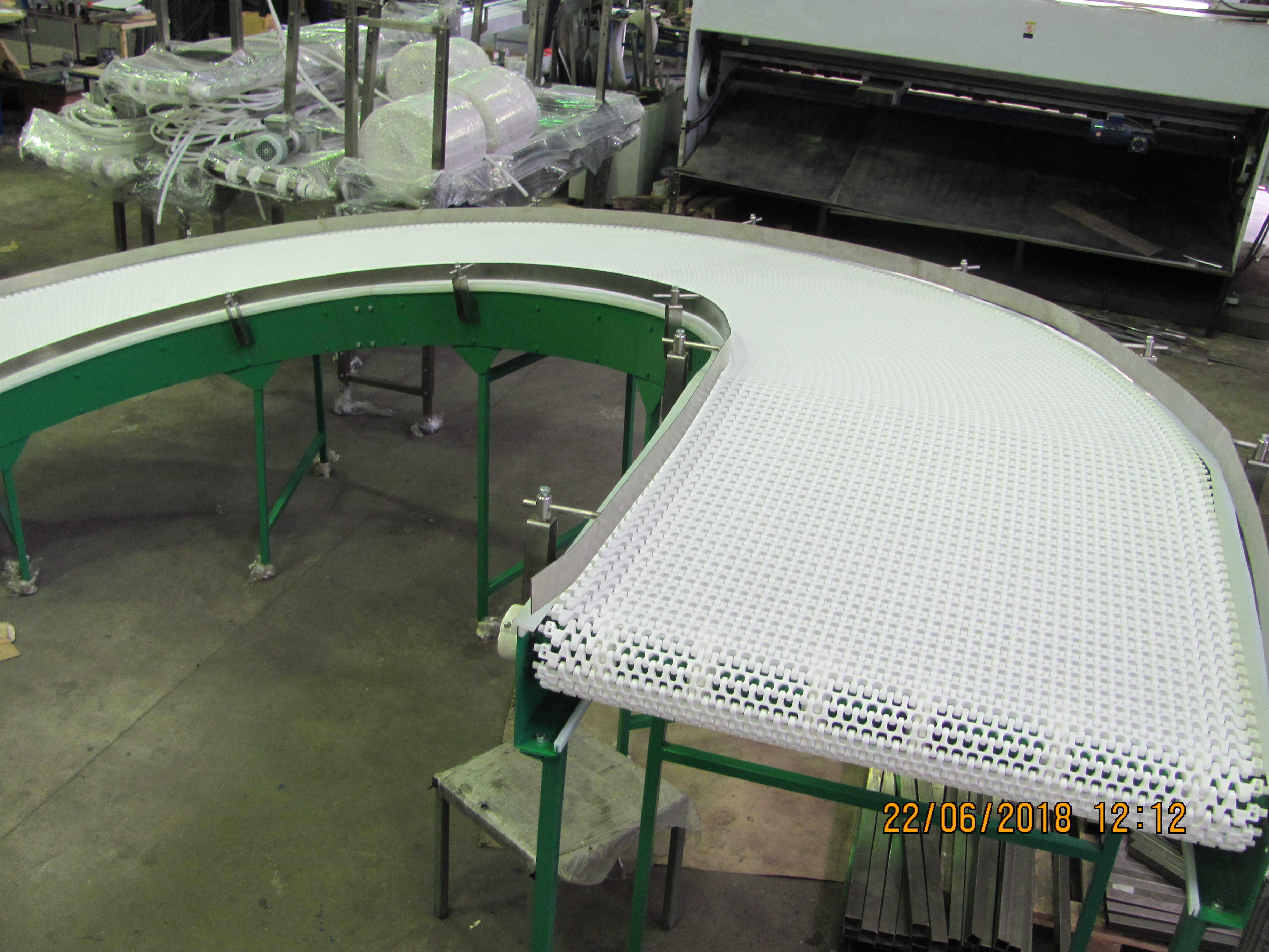 Описание проекта: Для пищевого производства изготовлен подъемный конвейер с поворотом на 180°. Конвейер предназначен для для разворачивания хлебных изделий выходящих из печи в обратную сторону с увеличением высоты с 450 мм до 1600 мм.Ширина пластиковой модульной ленты 800 мм, материал ленты - полипропилен (Швейцария), привод 0,75 кВт (Германия), скорость движения 6 м/мин, ограждения высотой 50 мм из нержавеющей стали.