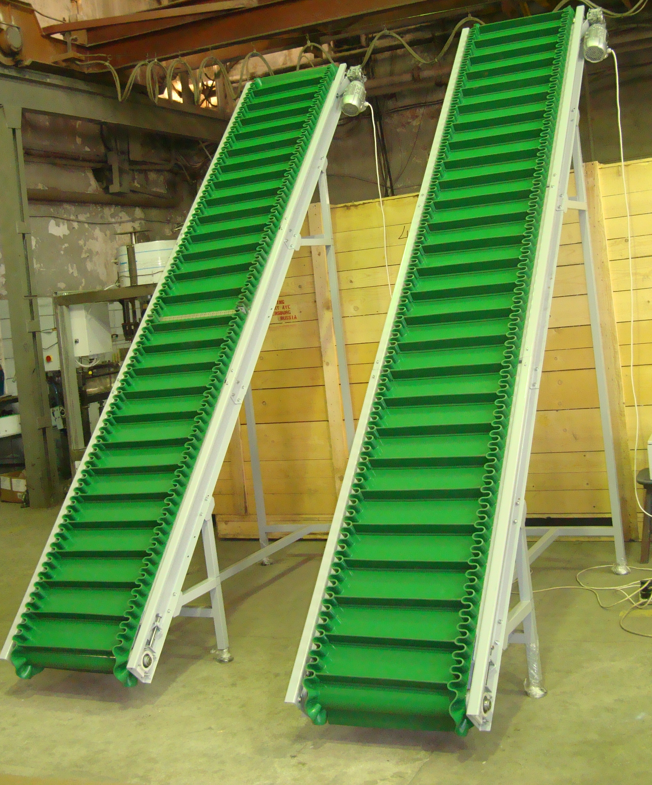 Описание проекта: Изготовлено два ленточных наклонных конвейера с гофробортом и перегородками, для подъема штучных изделий под углом в 45°.Конвейера изготовлены из углеродистой стали с порошковой окраской, ширина ленты 600мм, высота гофроборта и перегородок 60мм (Голландия), привод 0,37кВт (Италия)Скорость движения ленты 0,8 м/сек, регулировка скорости - частотный преобразователь в шкафу управления.