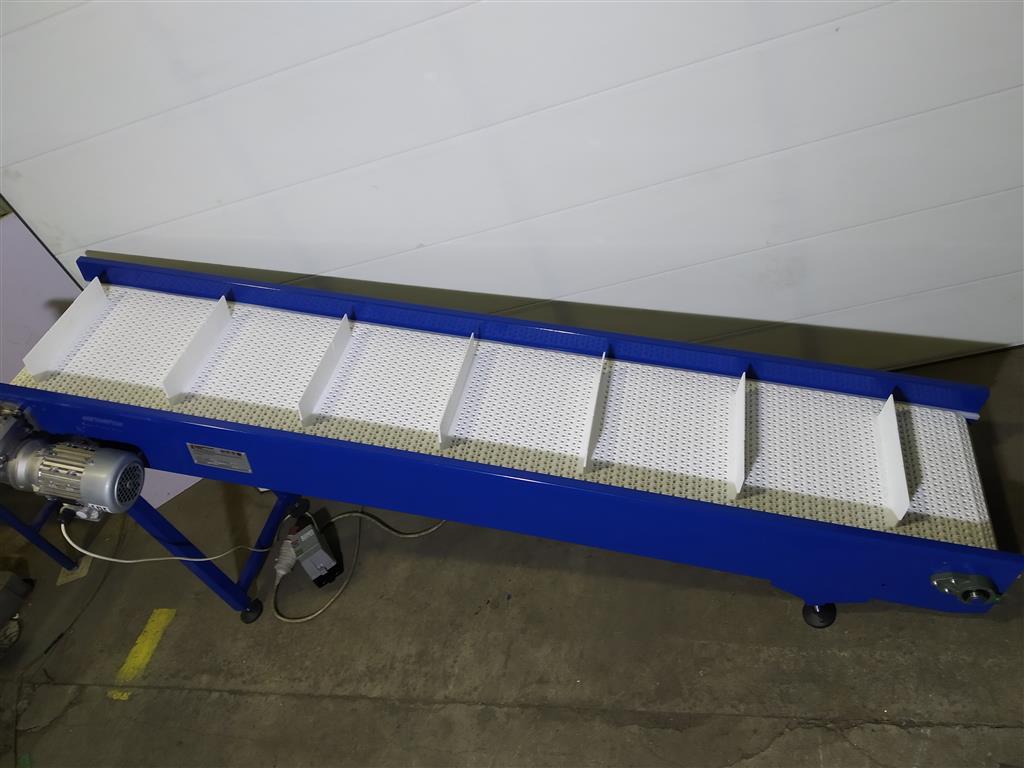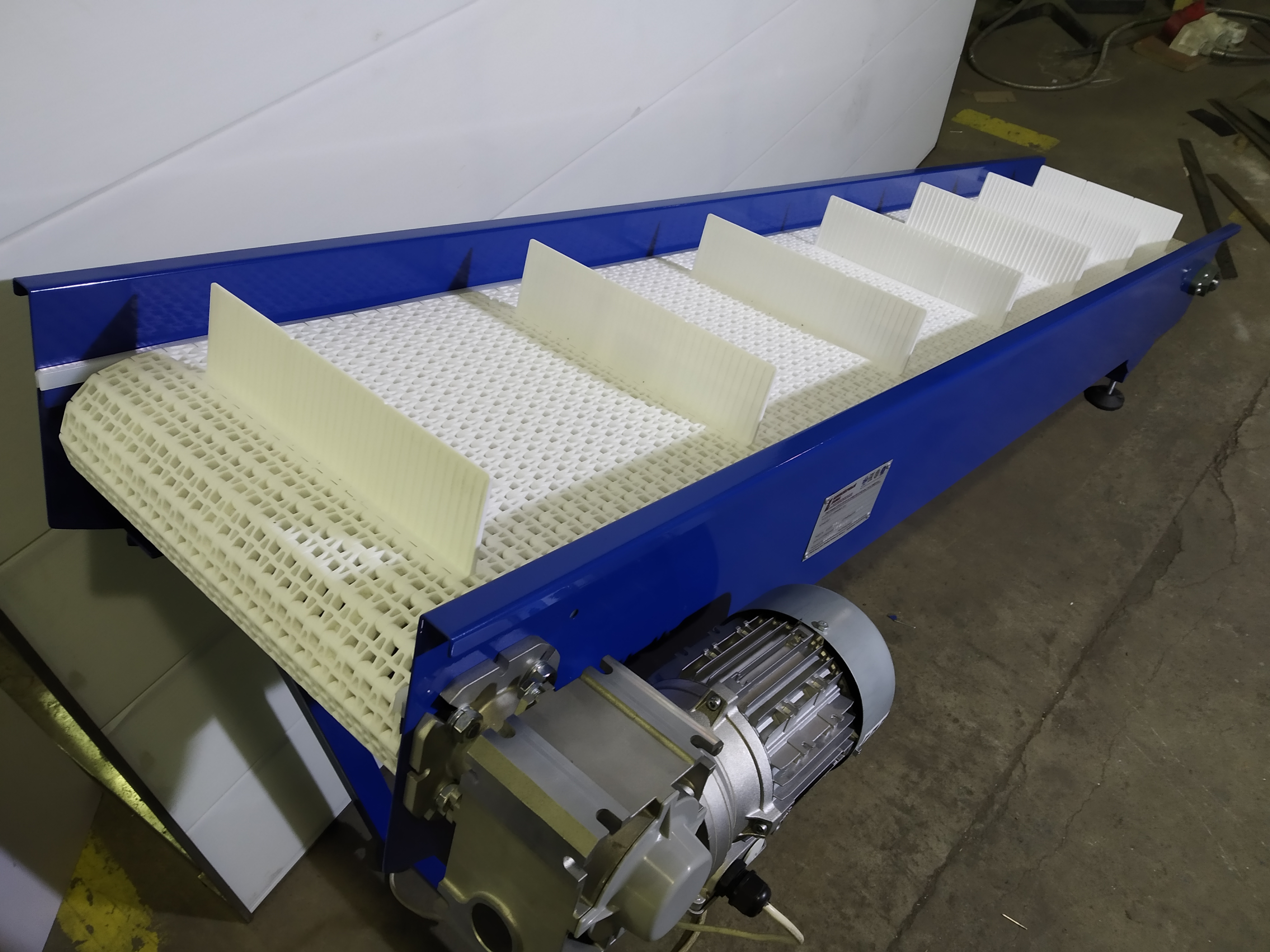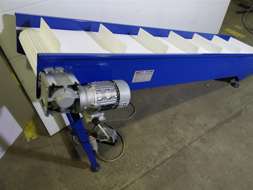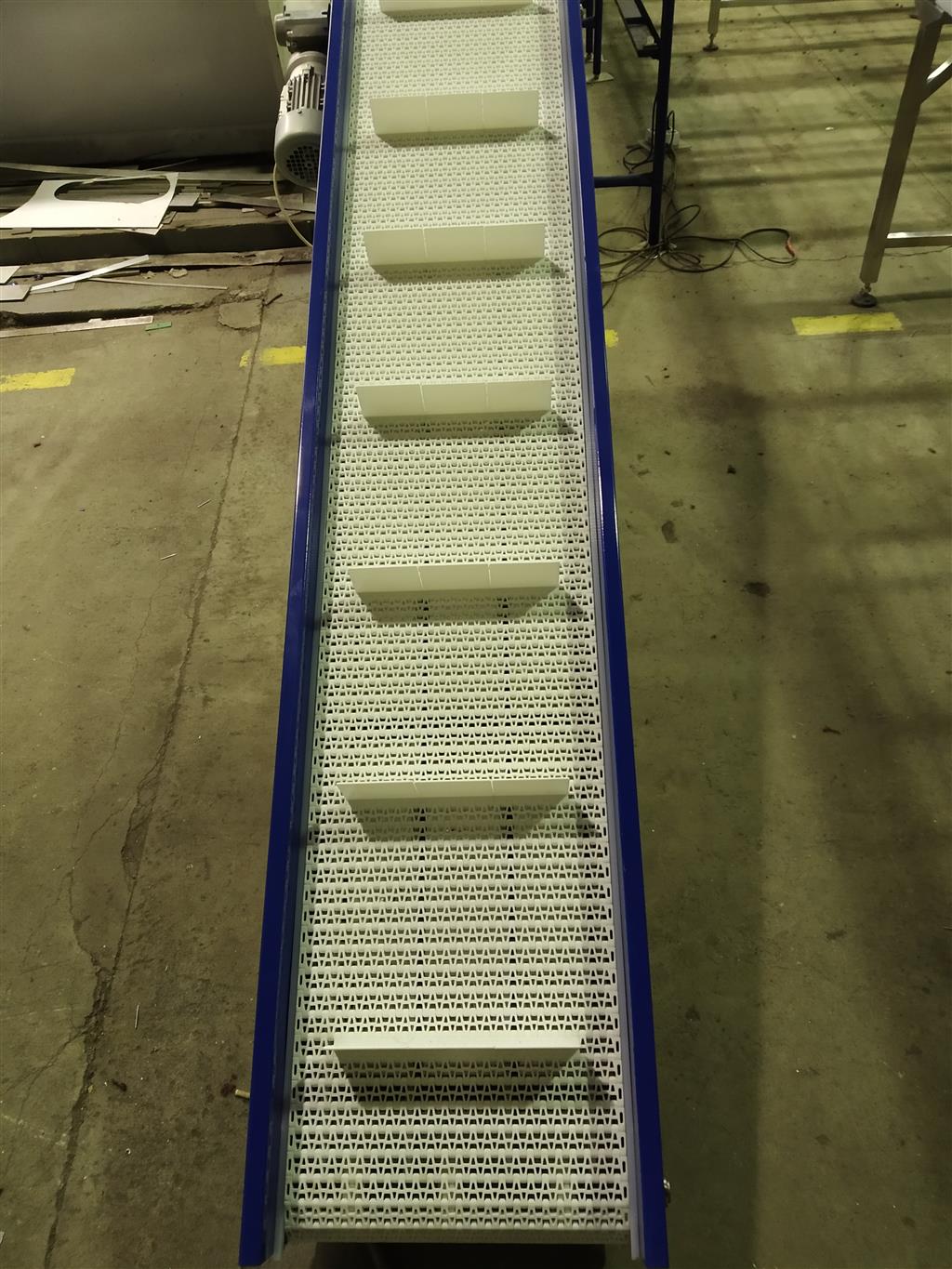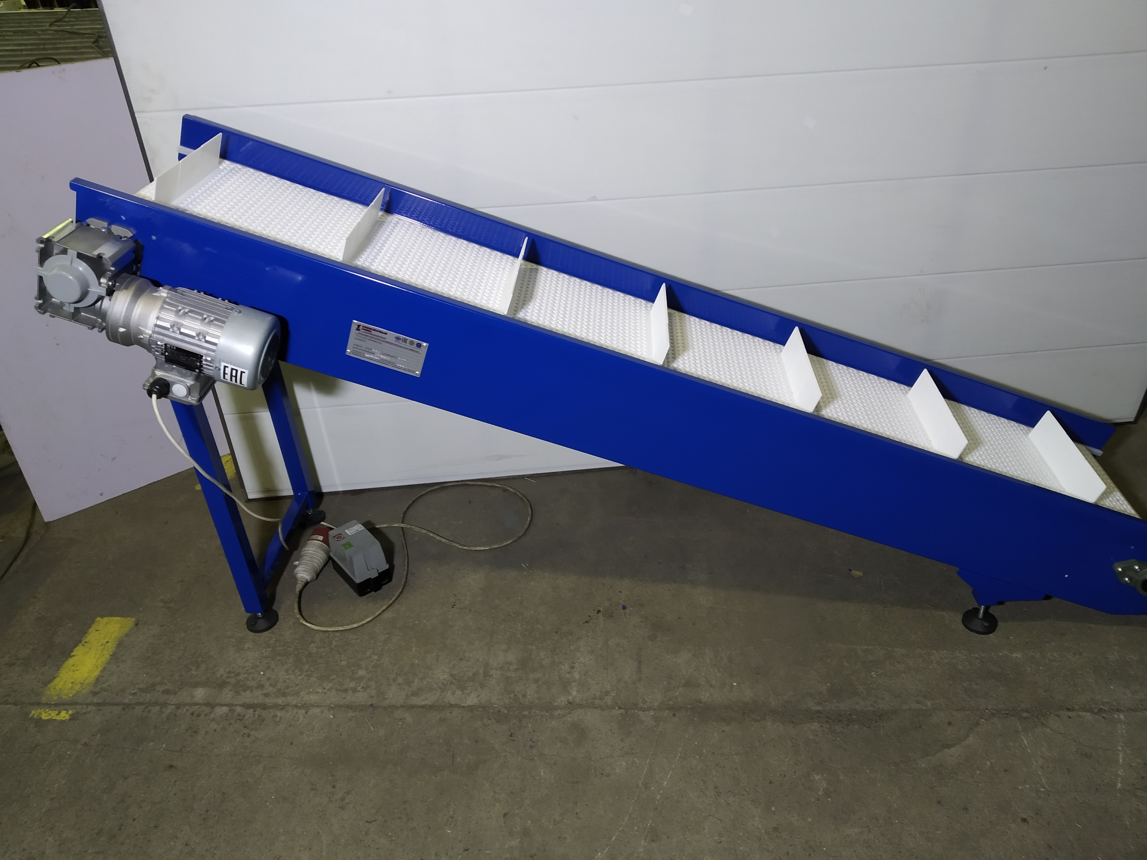 Описание проекта: Изготовлен конвейер с модульной лентой и перегородками, для перемещения кондитерских изделий. Длина конвейера 2200 мм, высота от 200 до 980 мм, ширина пластиковой модульной ленты 400 мм, высота лопаток 50 мм с шагом 300 мм. Материал конвейера углеродистая сталь с порошковой окраской, высота бокового ограждения 50 мм, привод мотор-редуктор (Германия), скорость движения цепи - 10 м/мин.