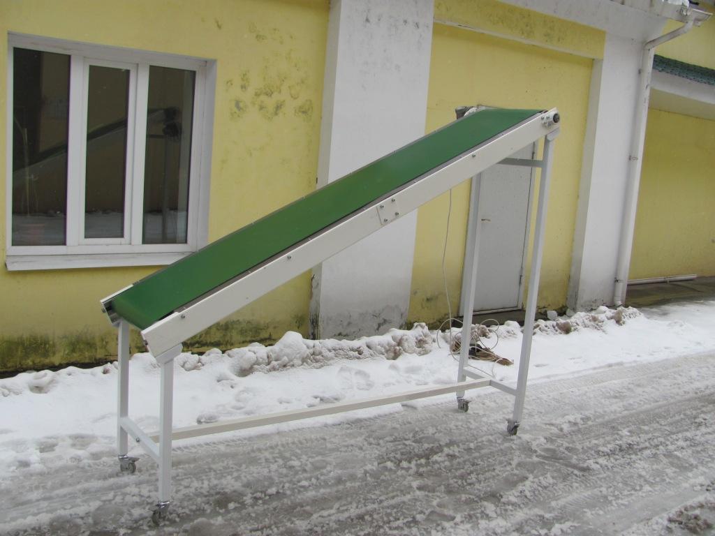 Описание проекта: Изготовлен наклонный ленточный конвейер для транспортировки пластиковых изделий под углом 25°. Длина конвейера 2500мм, высота от 850 до 2000мм, ширина ленты 450мм зеленого цвета из ПВХ (Голландия), привод 0,37 кВт (Италия), каркас конвейера - углеродистая сталь с порошковой окраской белого цвета. Конвейер изготовлен передвижным, на колесиках.