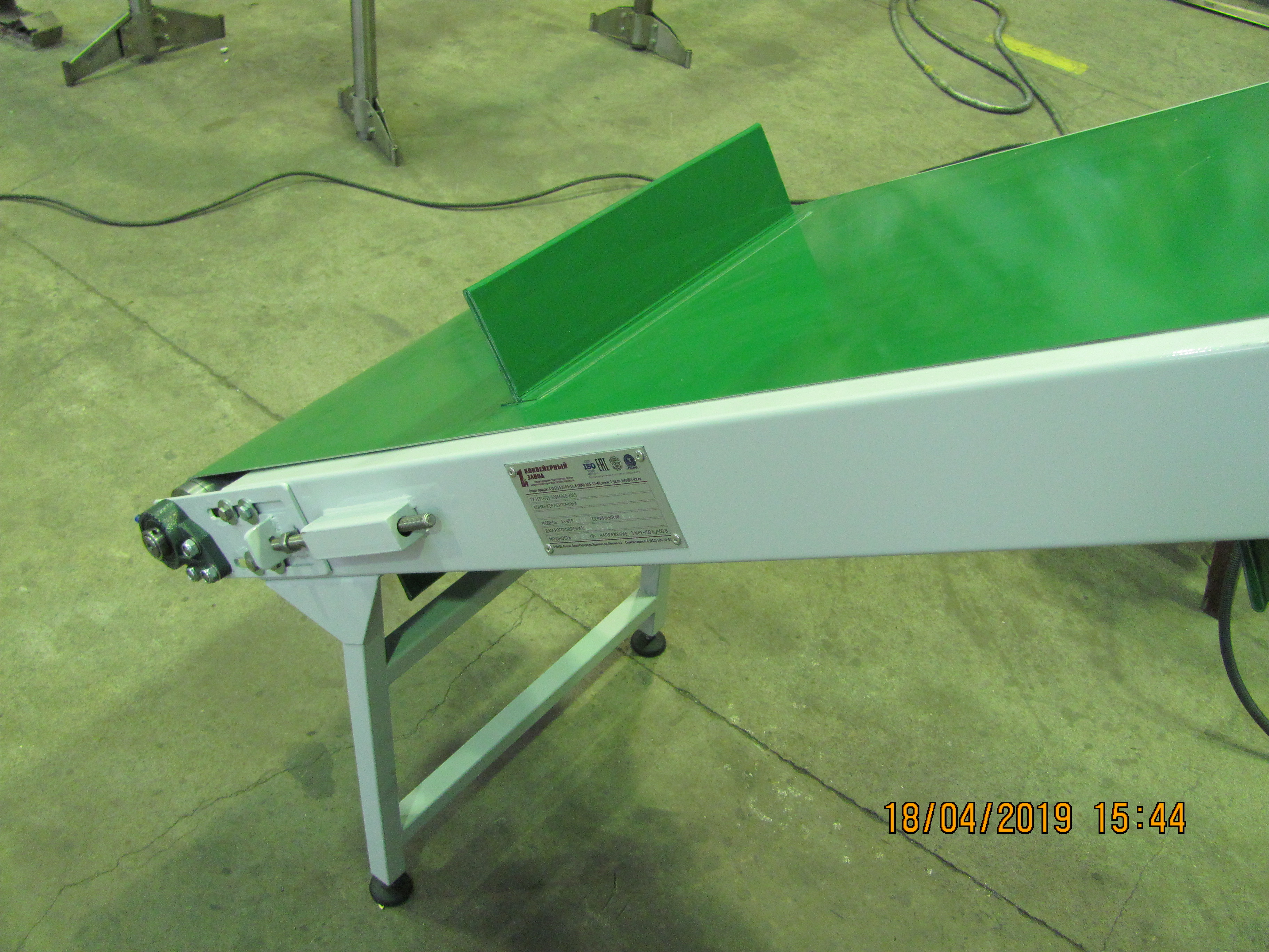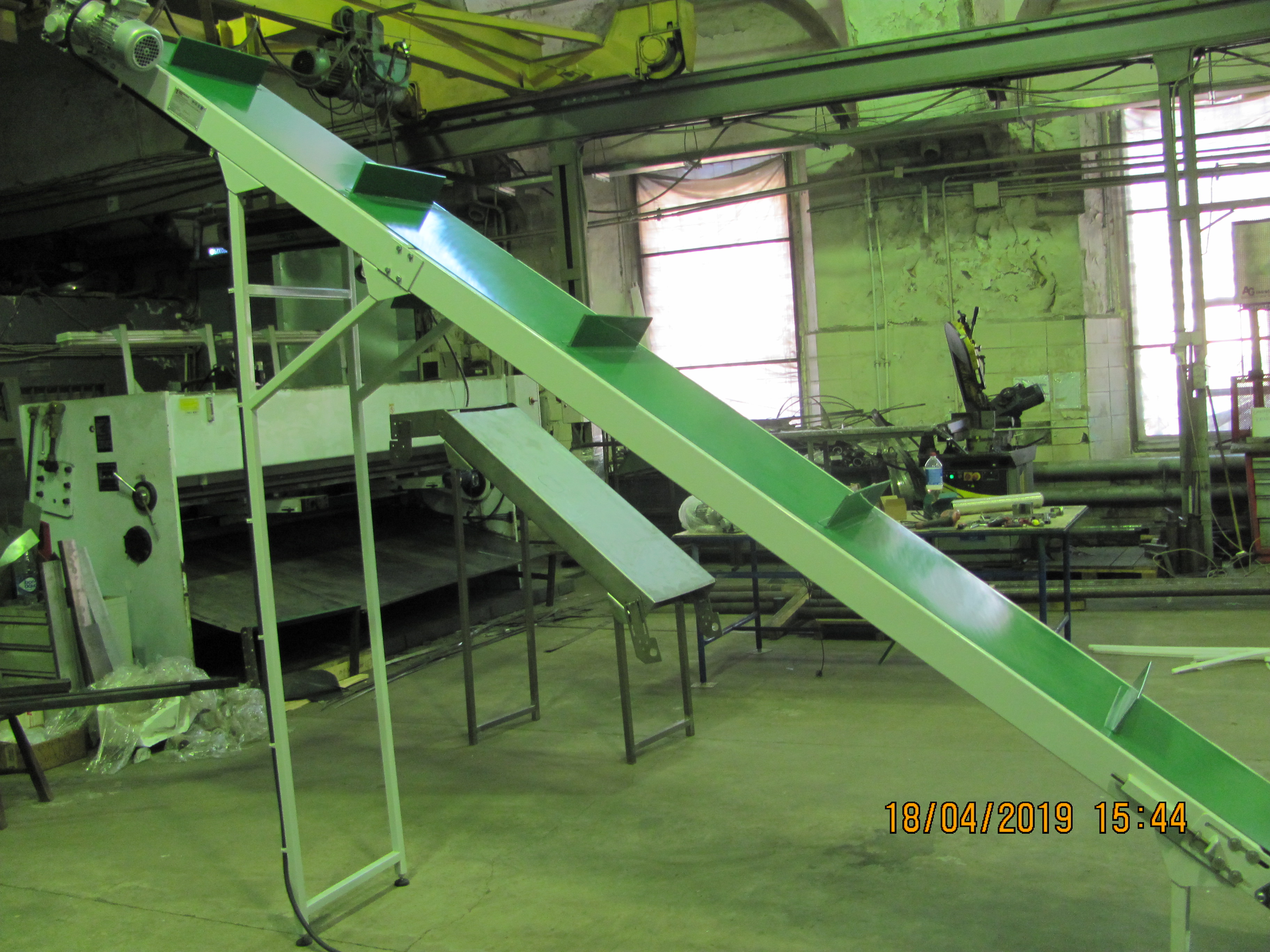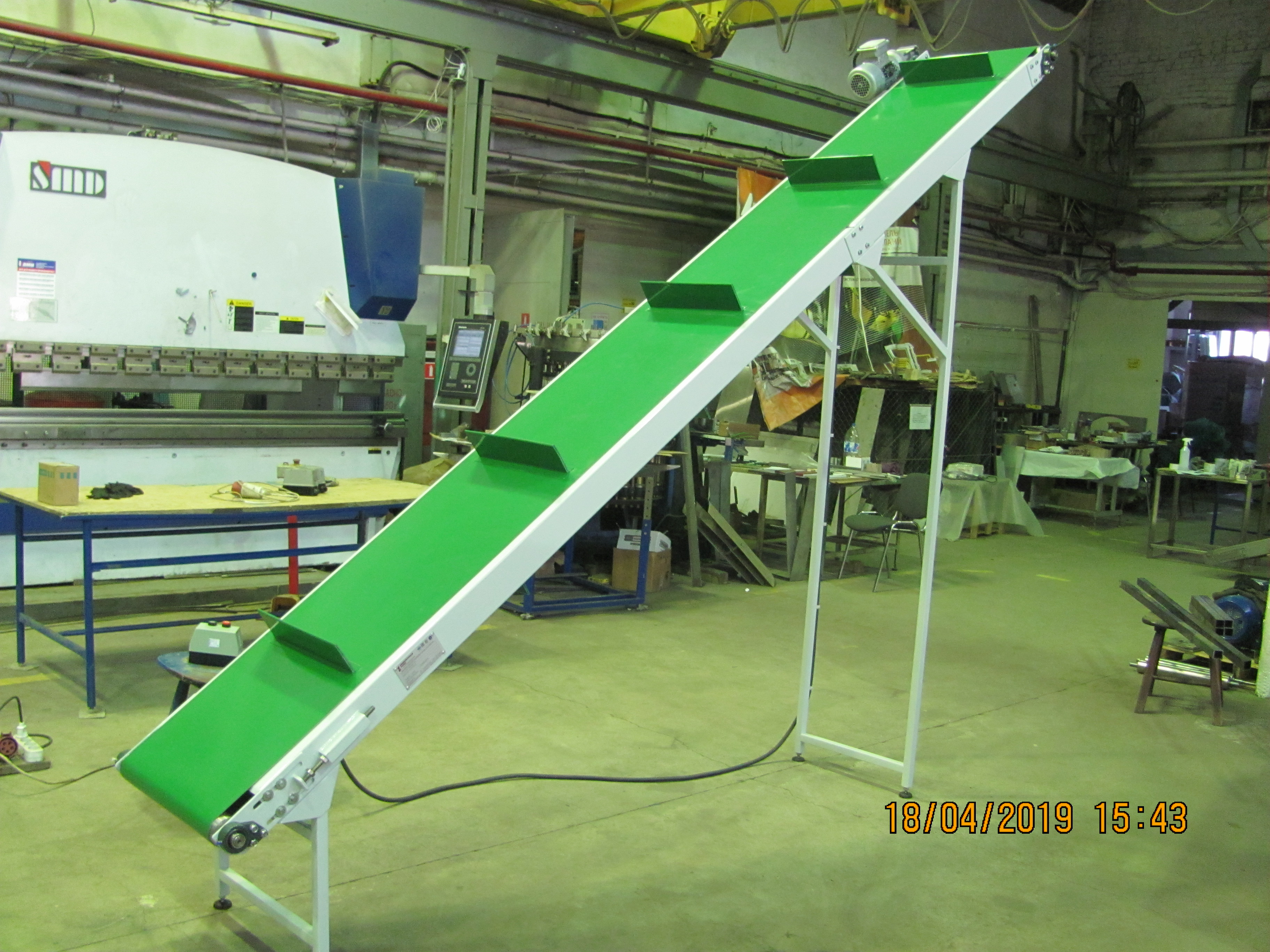 Для перемещения пустых коробок на 2-й этаж изготовлен стационарный ленточный конвейер.Угол наклона 30 градусов.Длина конвейера 4000 мм.Высота конвейера 500-2800 мм.Материал ленты ПВХ (зеленый цвет)Максимальная нагрузка на конвейер 120 кг.Скорость движения ленты 12 м/минМотор-редуктор Германия