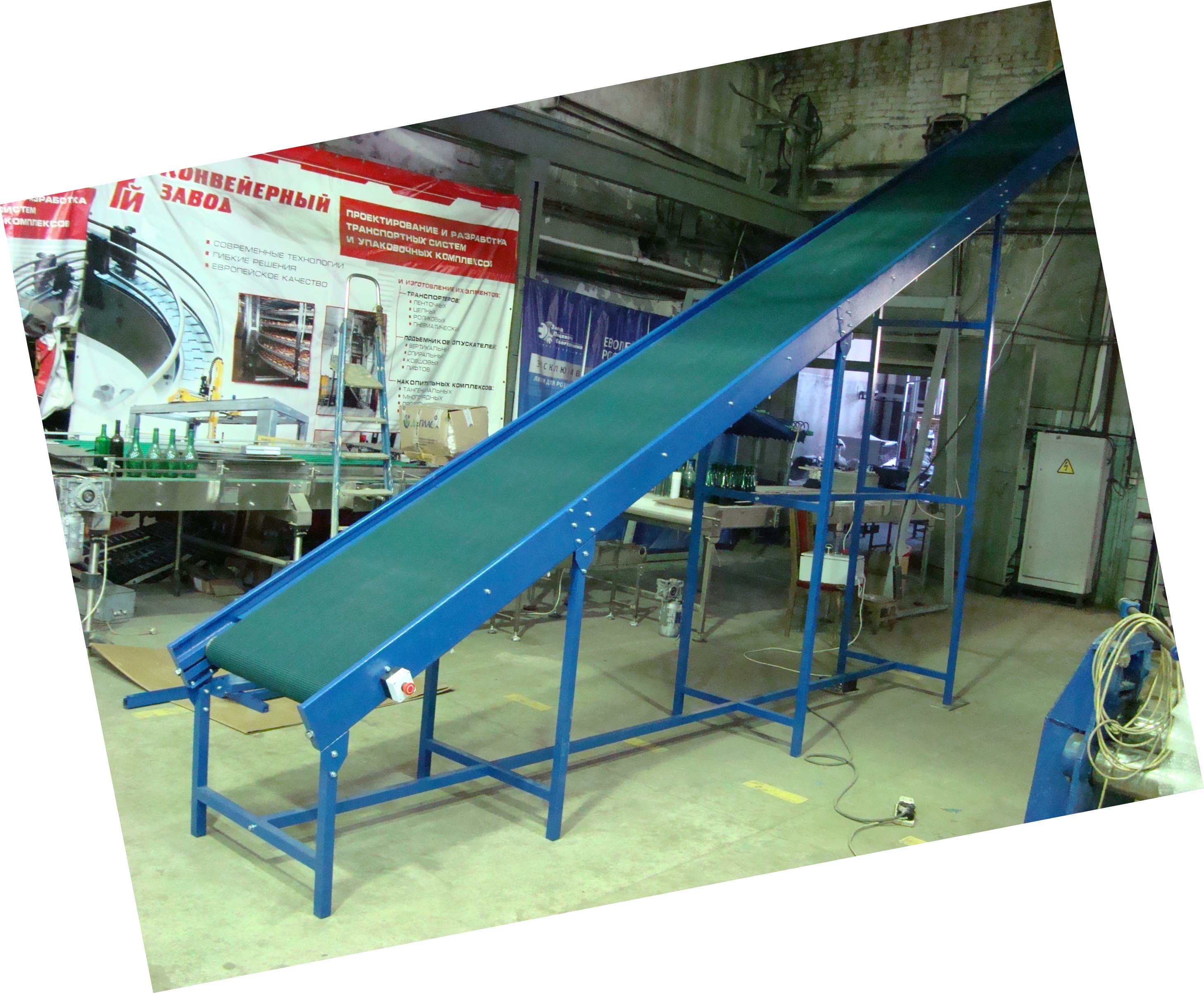 Описание проекта: На нашем производстве изготовлен наклонный(реверсивный) ленточный конвейер для подъема и спуска гофрокоробов на складе. Угол наклона конвейера составляет 30?, что является максимальным для ленточного конвейера. Длина конвейера составляет 9,2 метра, а перепад высот 4,5 метров. Ширина ленты - 800 мм, материал и тип ленты ПВХ с грип структурой. Материал конвейера - углеродистая сталь с порошковой окраской, привод 0,75 кВт (Италия). Расстояние между опорами конвейера спроектировано для безопасного проезда а/погрузчика под конвейером.