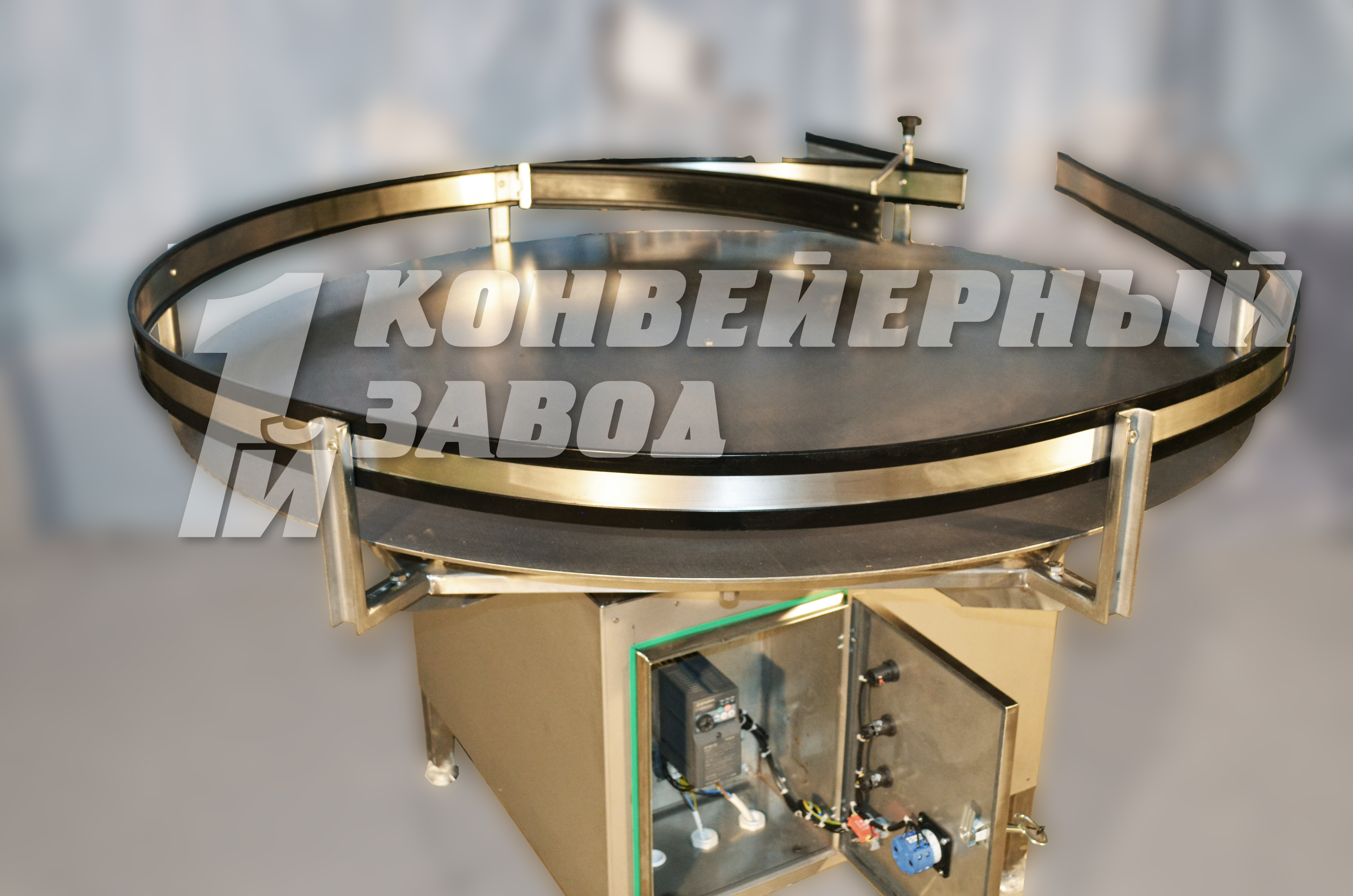 Описание проекта: Изготовлен круглый накопительный стол для сбора полных емкостей с моющими средствами после розлива. Стол изготовлен с учетом большой нагрузки (до 200кг) и со следующими техническими параметрами:диаметр стола, мм – 1500;сплошное ограждение вдоль стола с возможностью регулировки;материал стола – нержавеющая сталь;скорость вращения стола (4-15 об/мин);регулировка скорости – частотный преобразователь в шкафу управления;защита привода от влаги;привод 0,55 кВт (Германия);