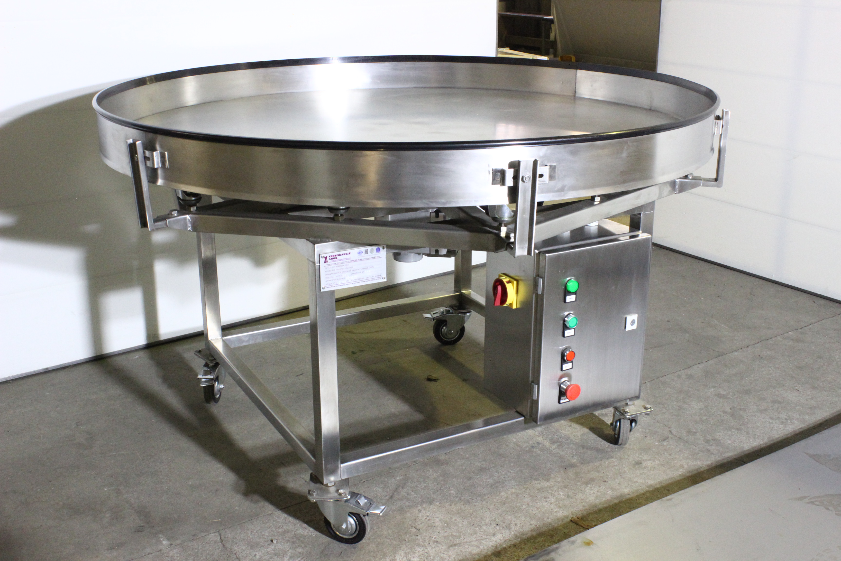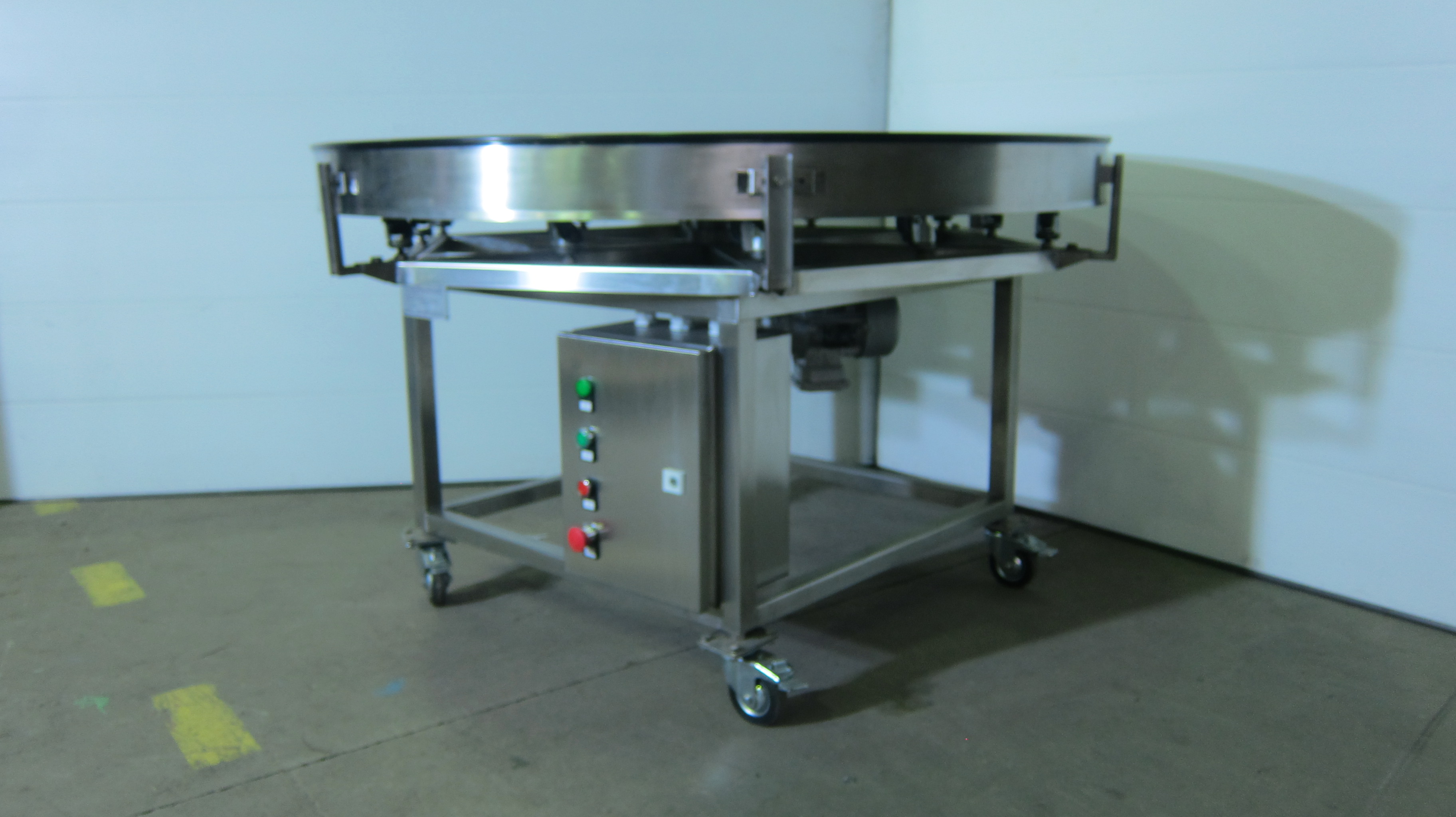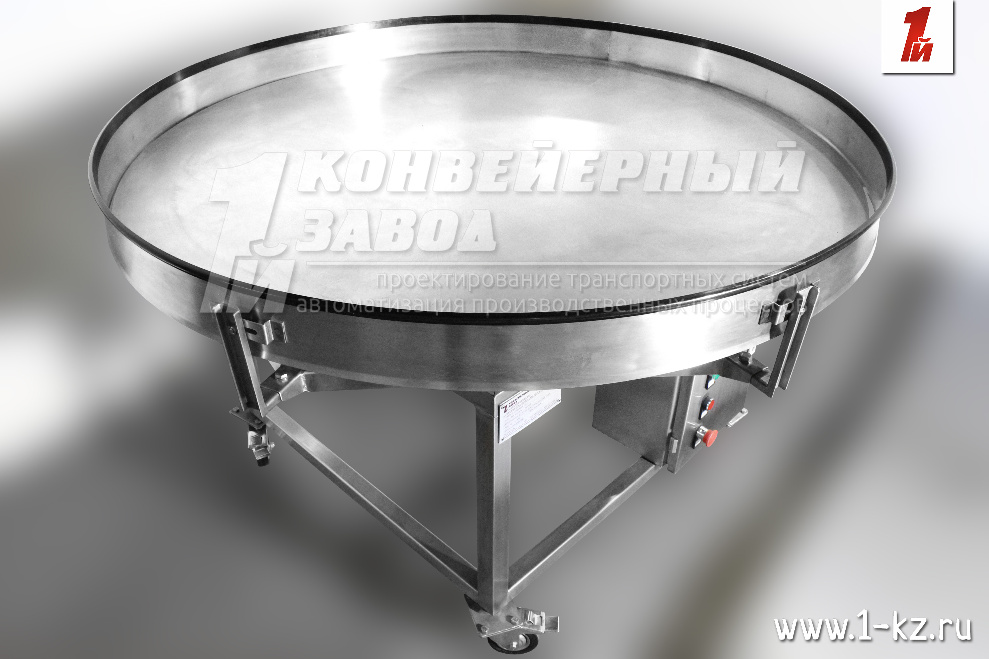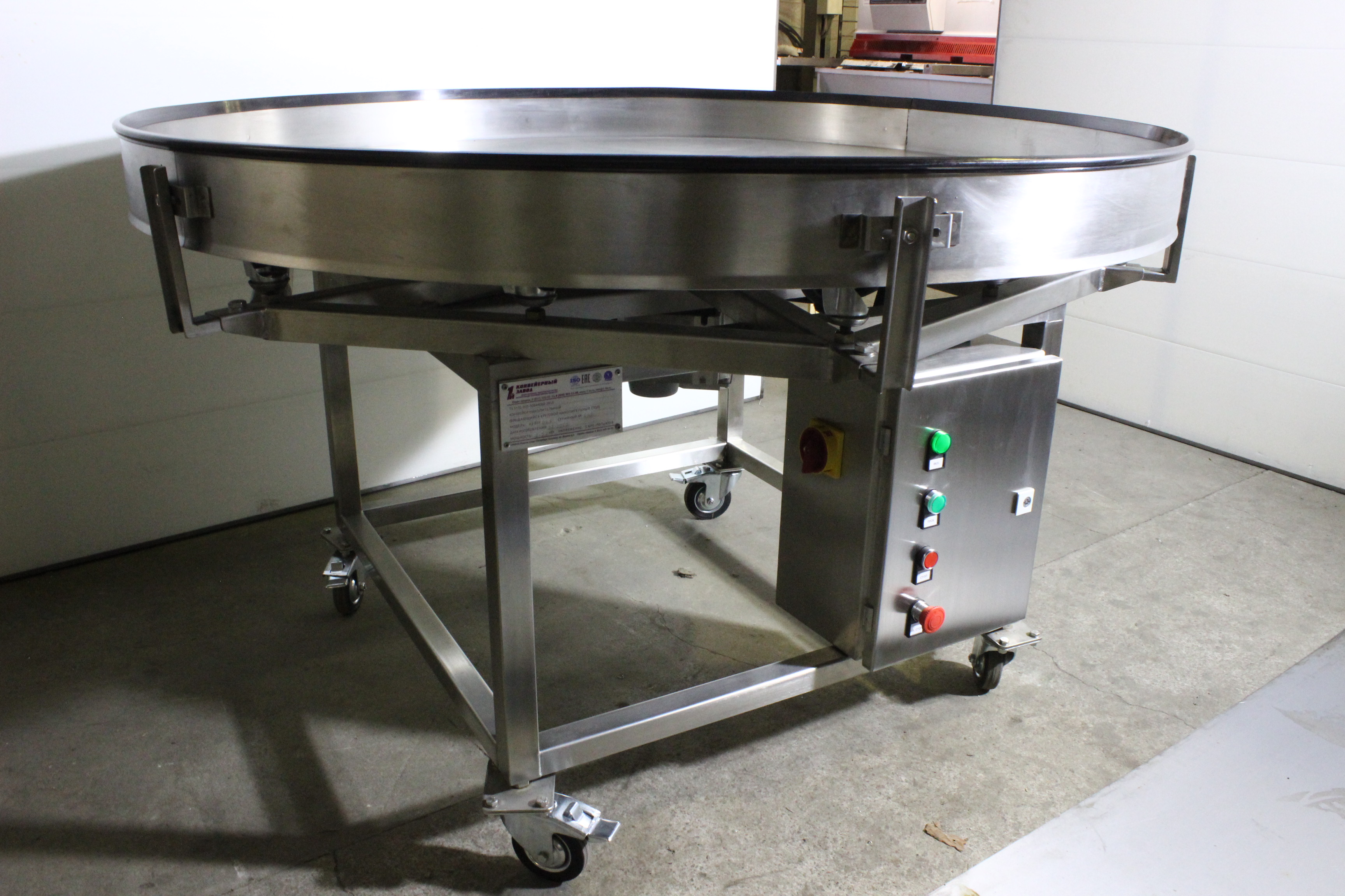 Описание проекта: Постоянному заказчику поставлен очередной накопительный стол. По желанию заказчика на столе установлен не регулируемый сплошной борт. Стол предназначен для накопления упаковок с сыром.диаметр стола - 1400мм;высота стола - 800мм;материал стола - нержавеющая сталь;шкаф управления с частотным преобразователем;высота борта 100мм;