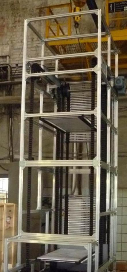 Описание проекта: В начале мая наша компания отправила заказчику непрерывный вертикальный S-лифт для подъема упаковок на верх.Материал изготовления лифта - алюминий, высота подъема 3600мм, производительность 500 упаковок в час,размер упаковок 900*500мм, вес 50 кг.Управление лифтом осуществляется при помощи частотного преобразователя, сенсорных датчиков и контроллера.Привод (Германия), резиновая цепь с завулканезированными тросами, роликовые площадки для упаковок.