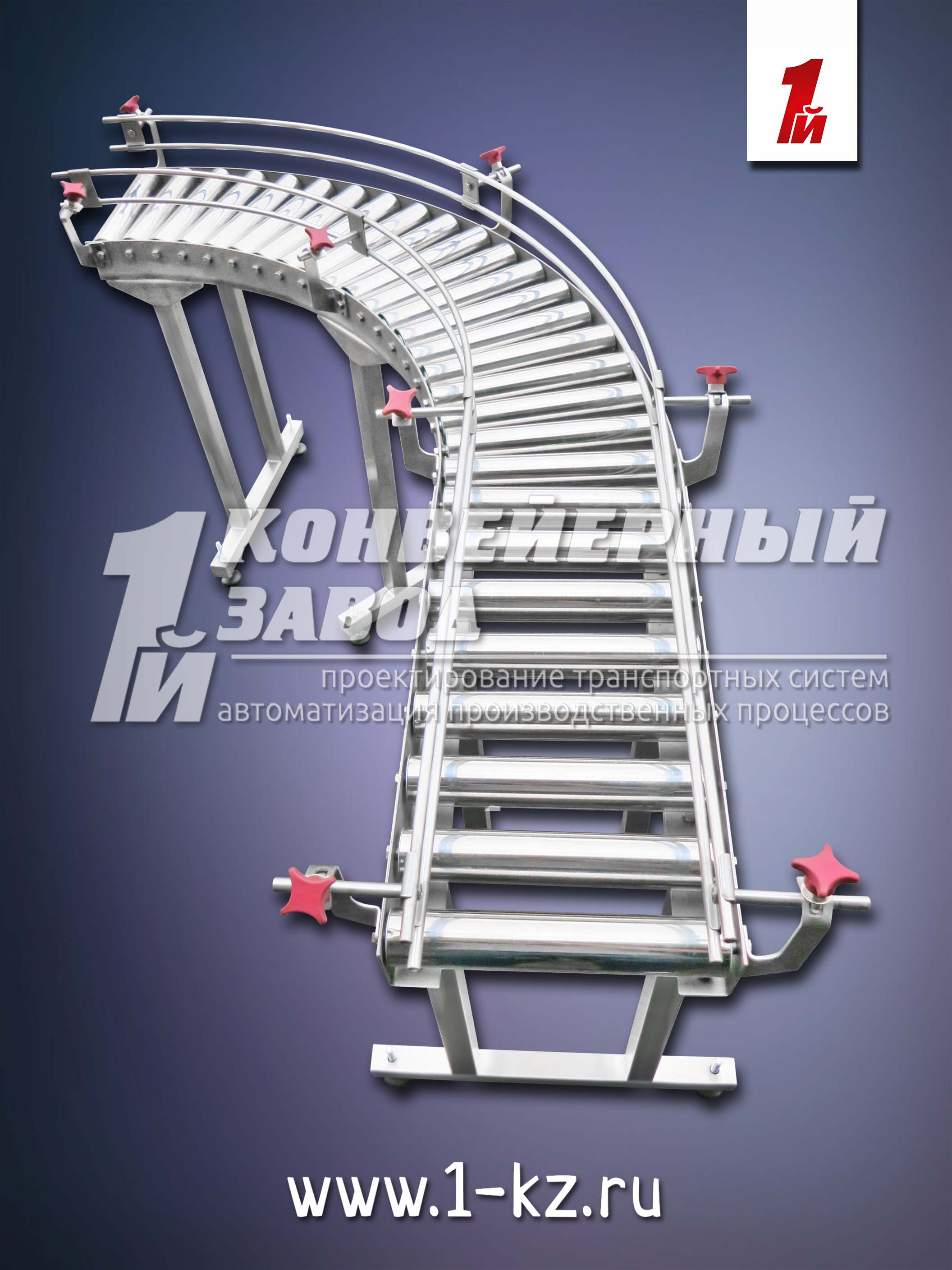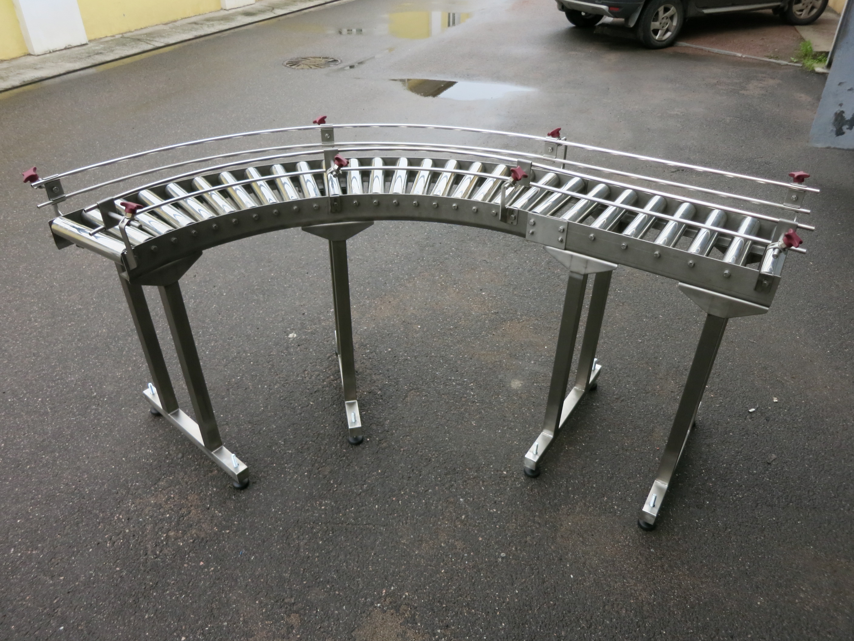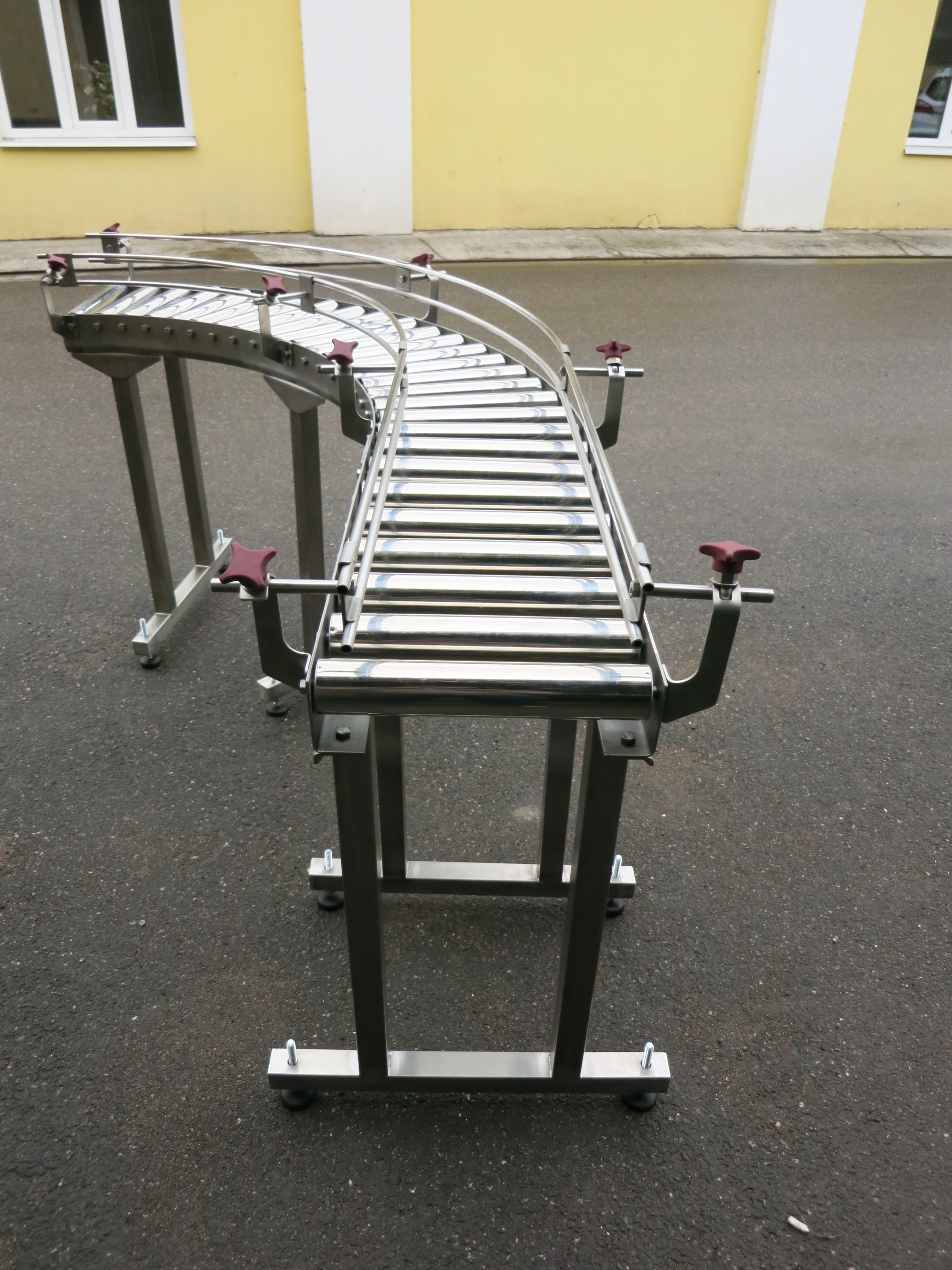 Описание проекта: Для перемещения банок с красками изготовлен неприводной поворотный рольганг. Конфигурация рольганга состоит из прямого и поворотного участка, но ролики применены цилиндрические. Для предотвращения падения банок, применены кронштейны ограждения собственного производства. Все части рольганга (ролики, кронштейны, опоры, и т.д.) изготовлены из нержавеющей стали.