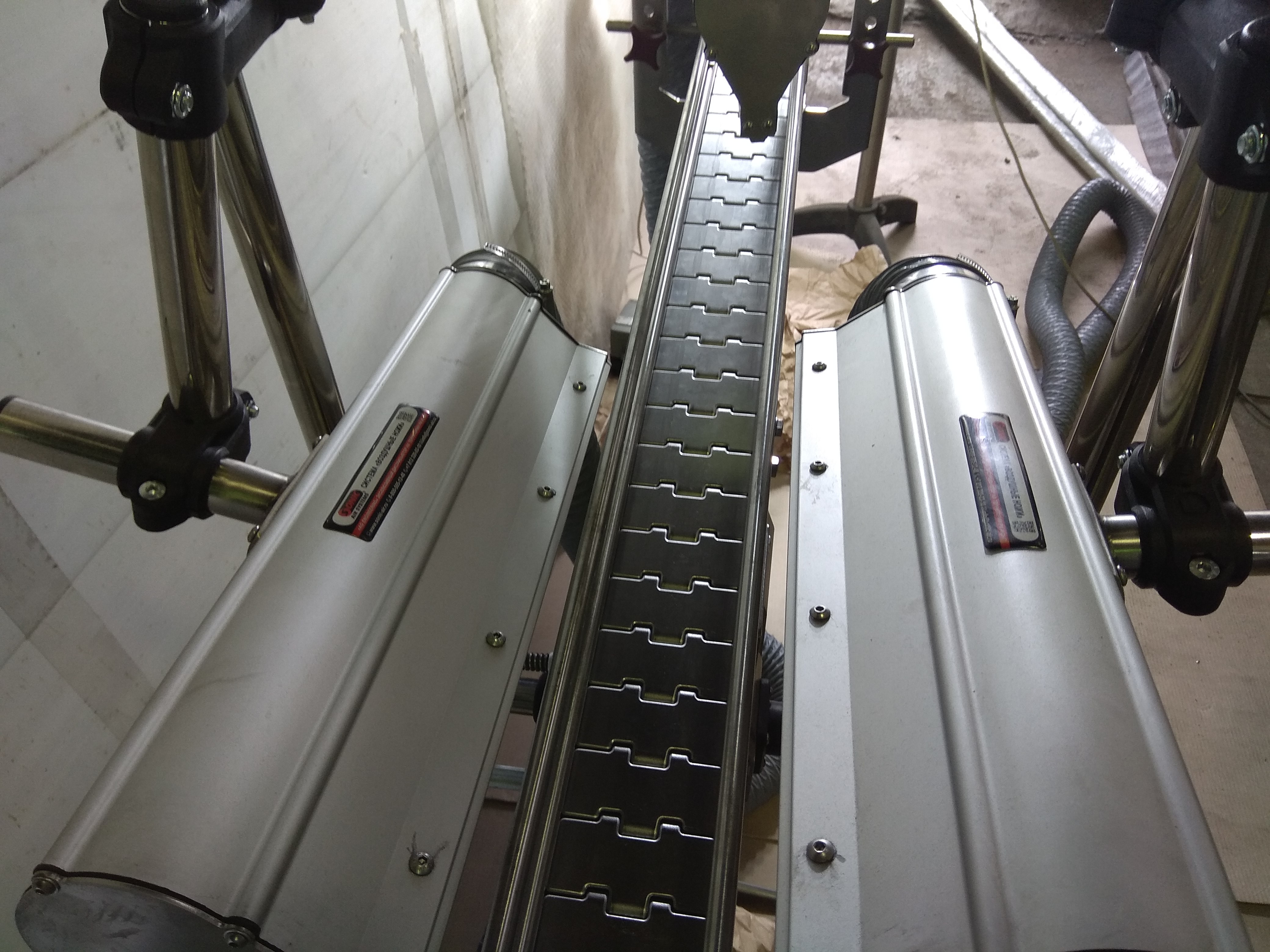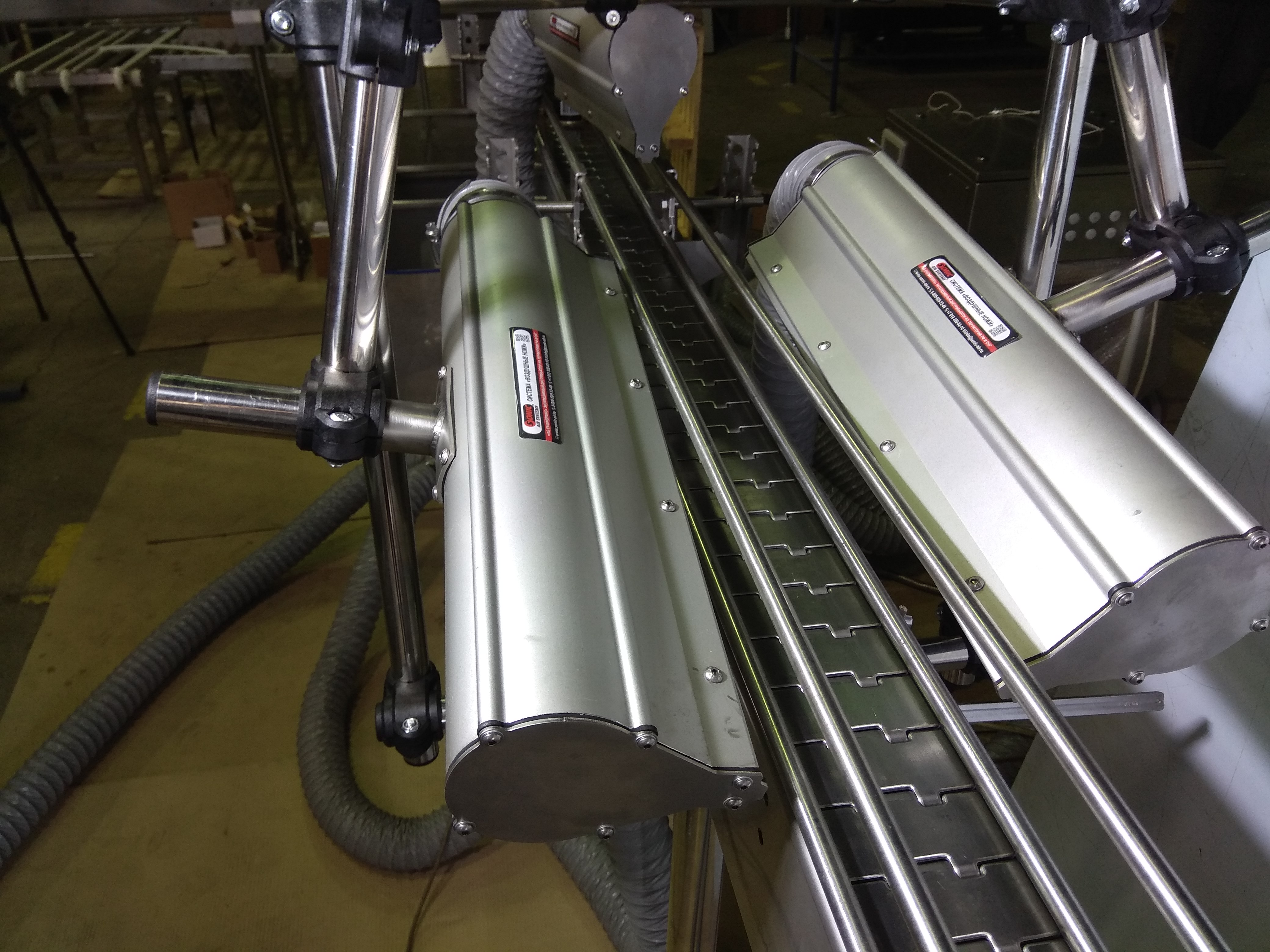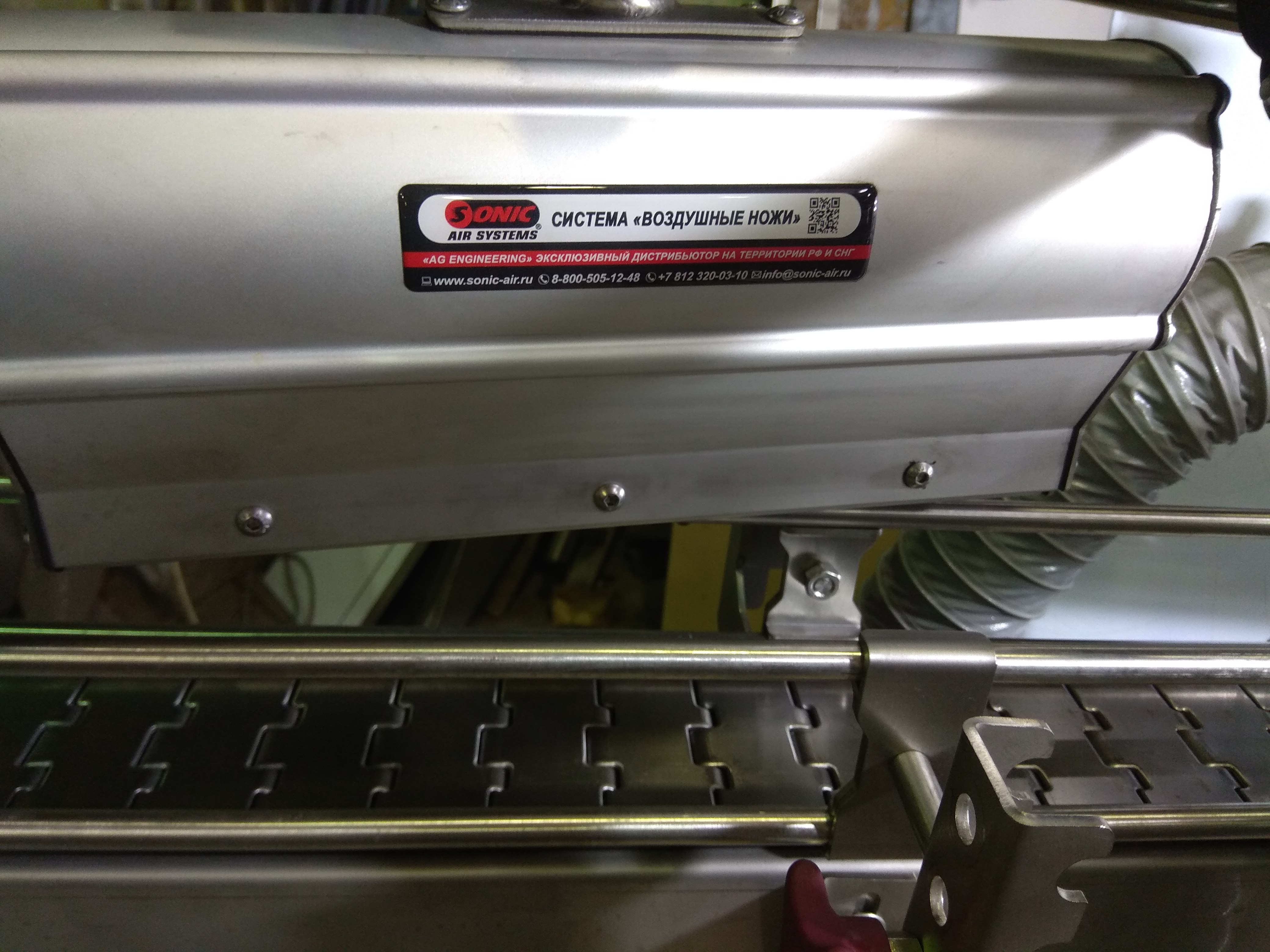 Описание проекта: Для крупного консервного завода изготовлен и отгружен Осушитель Поверхности Sonic Air Systems 100, с двигателем 11 кВт.Оборудование предназначено для удаления влаги с жестяных банок на 3-х линиях розлива (производительностью 8000 б/ч), при этом на 2-х линиях одновременно. Для этого на каждом пластинчатом конвейере установлены 3 воздушных ножа длиной 460 мм и 300 мм, которые удаляют влагу с боковой и верхней части банок. В комплект также входит: акустическая изоляция, шкаф управления с частотным преобразователем, набор монтажных креплений, гибкие шланги.