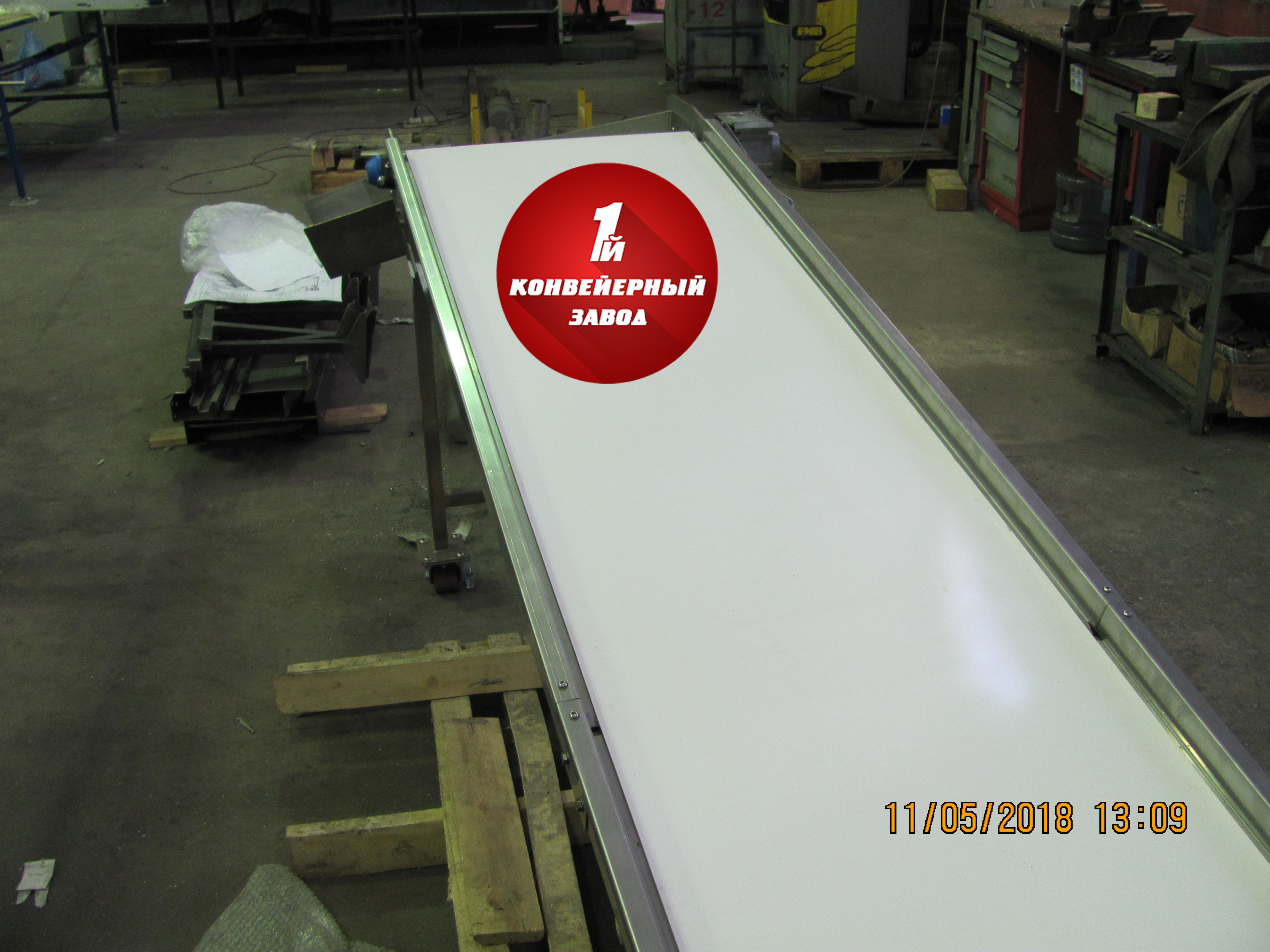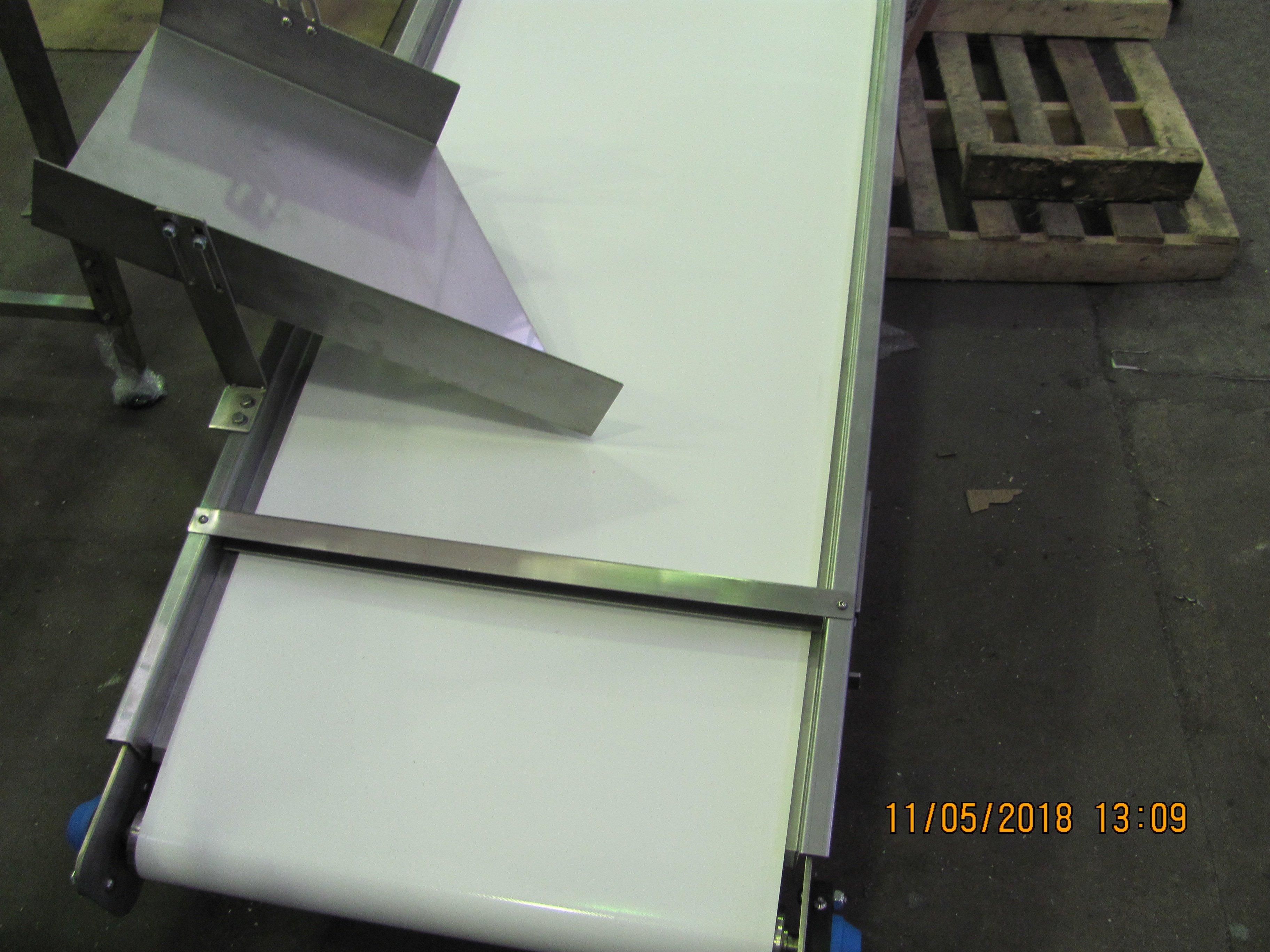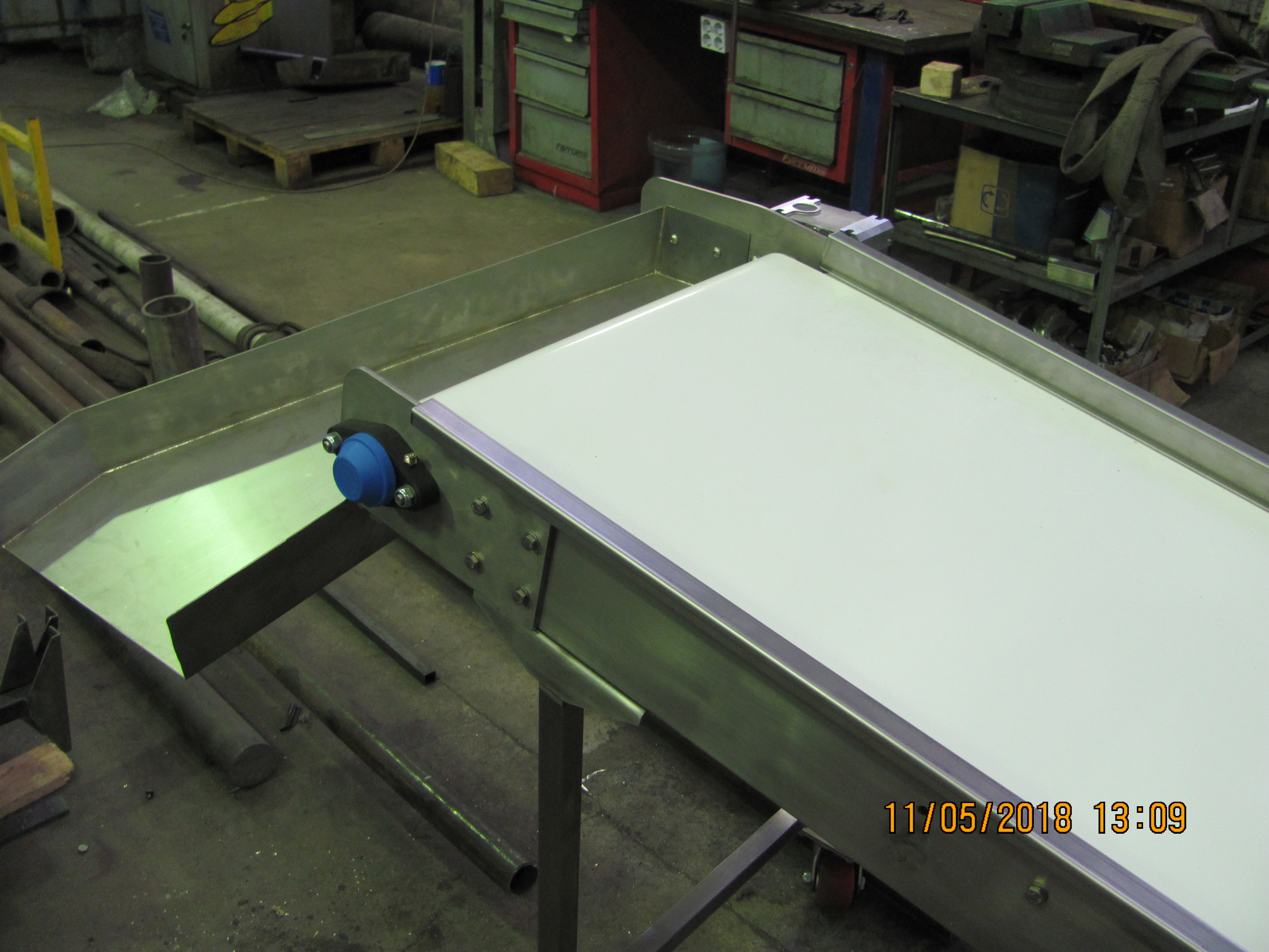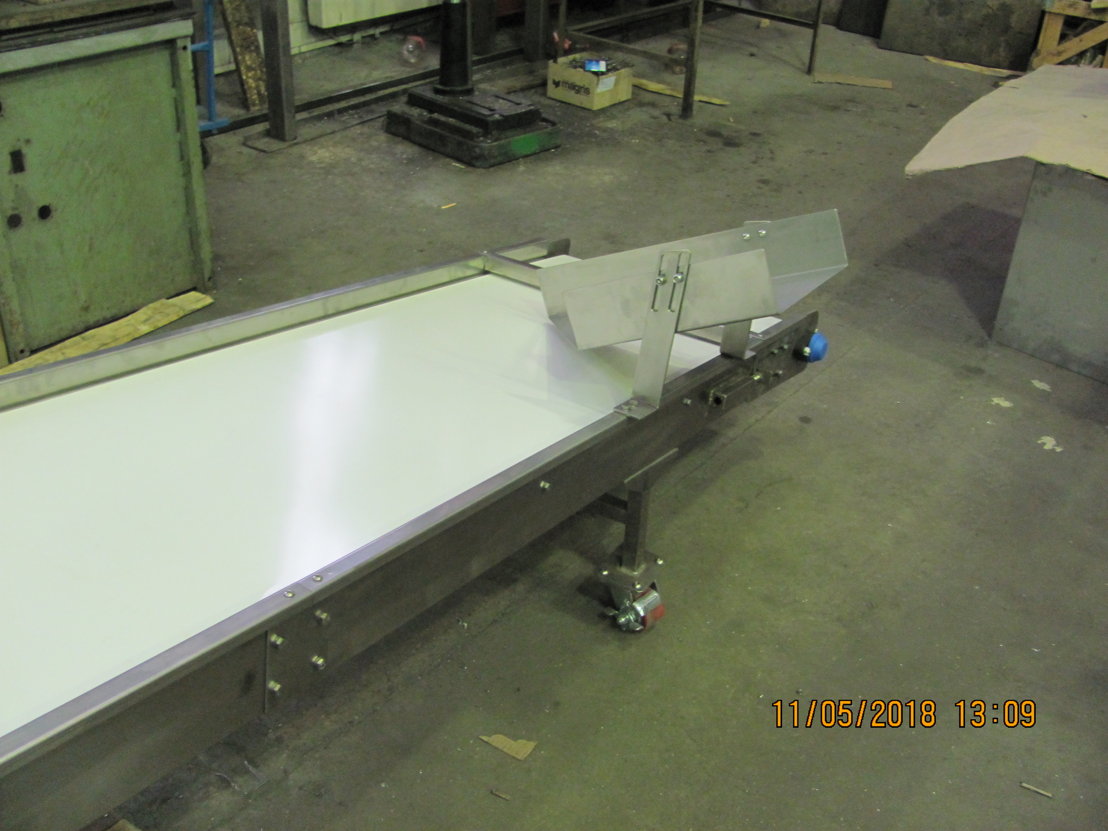 Описание проекта: Для кондитерской фабрики изготовлен и отгружен передвижной ленточный конвейер для перемещения конфет.Габариты: длина 4200 мм, ширина ленты ПВХ - 600 мм, высота - от 500 до 800 мм. Опоры конвейера - колесики со стопором. Материал конвейера - нерж. сталь. Скорость транспортера - 15м/мин. Привод - 0,37 кВт. Кнопочный пульт управления - старт, стоп, аварийная остановка.