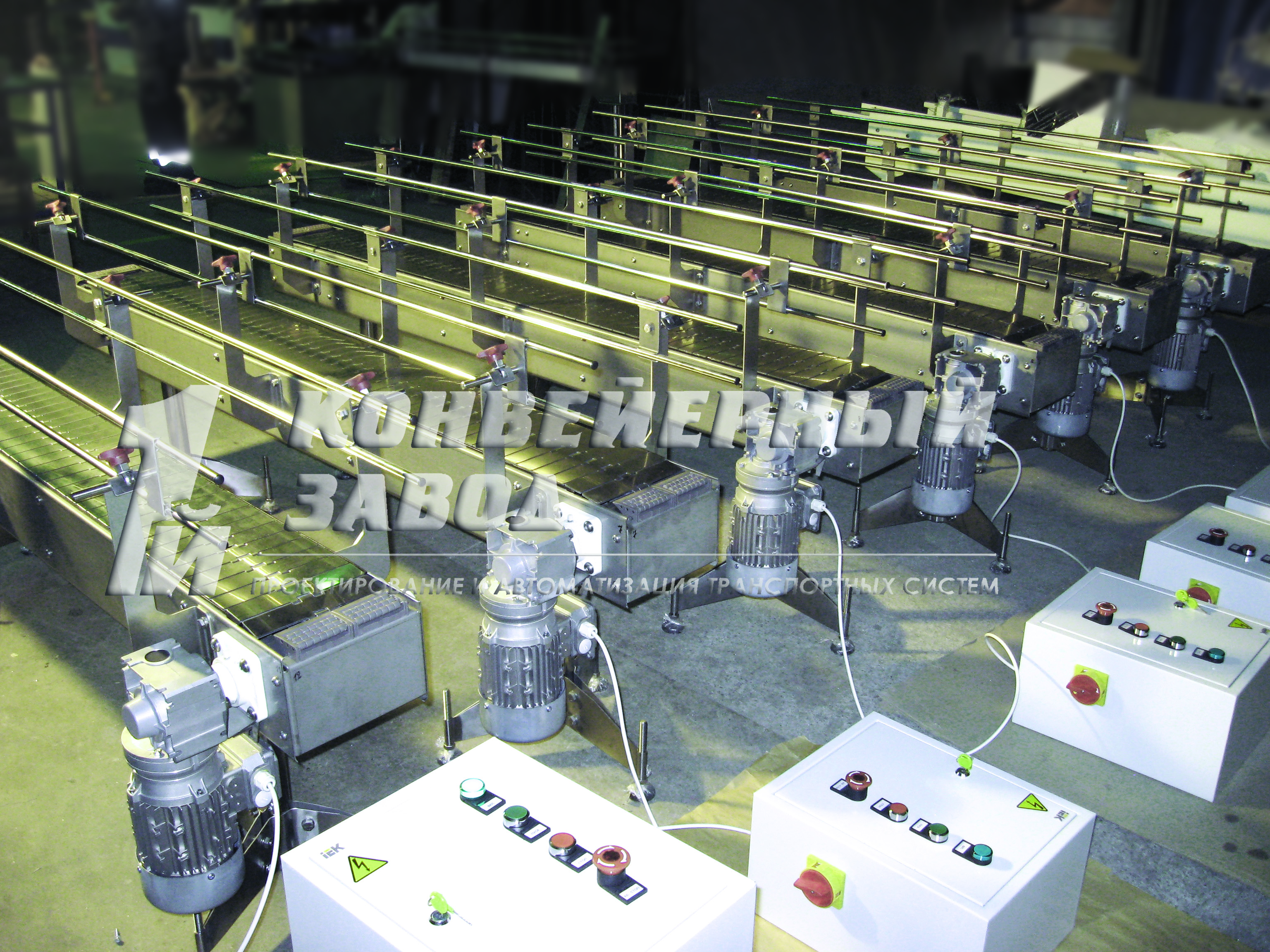 Описание проекта: Для производственной компании изготовлены и отгружены 6 пластинчатых конвейеров. Конвейеры предназначены для перемещения 19 литровых бутылок с водой. Конвейеры комплектуются нержавеющей цепью шириной 190,5 мм; фирменными высокими кронштейнами с трубками из нержавеющей стали; шкафом управления с частотным преобразователем; приводом 0,37 кВт; переходными роликовыми площадками с двух сторон.