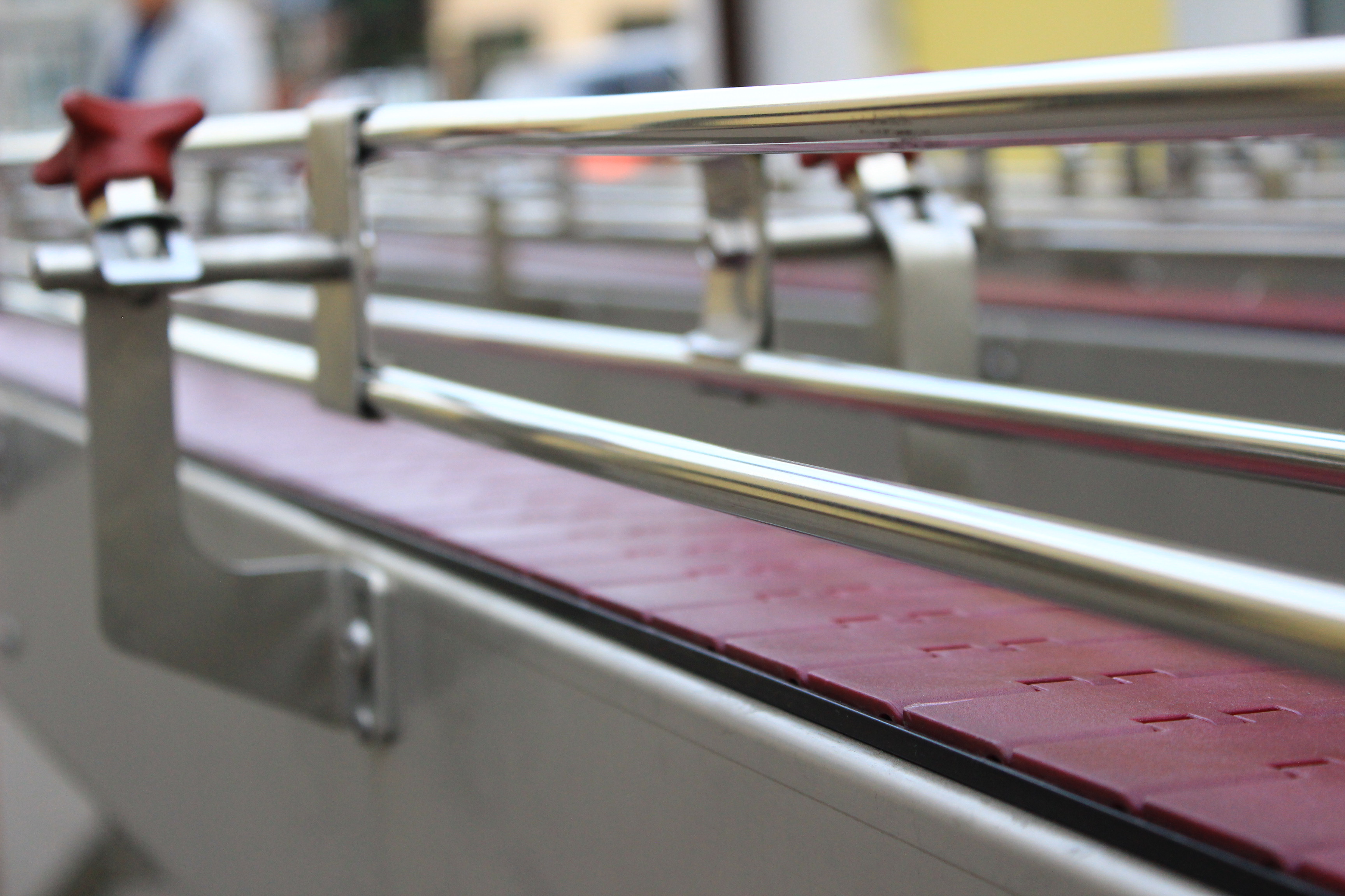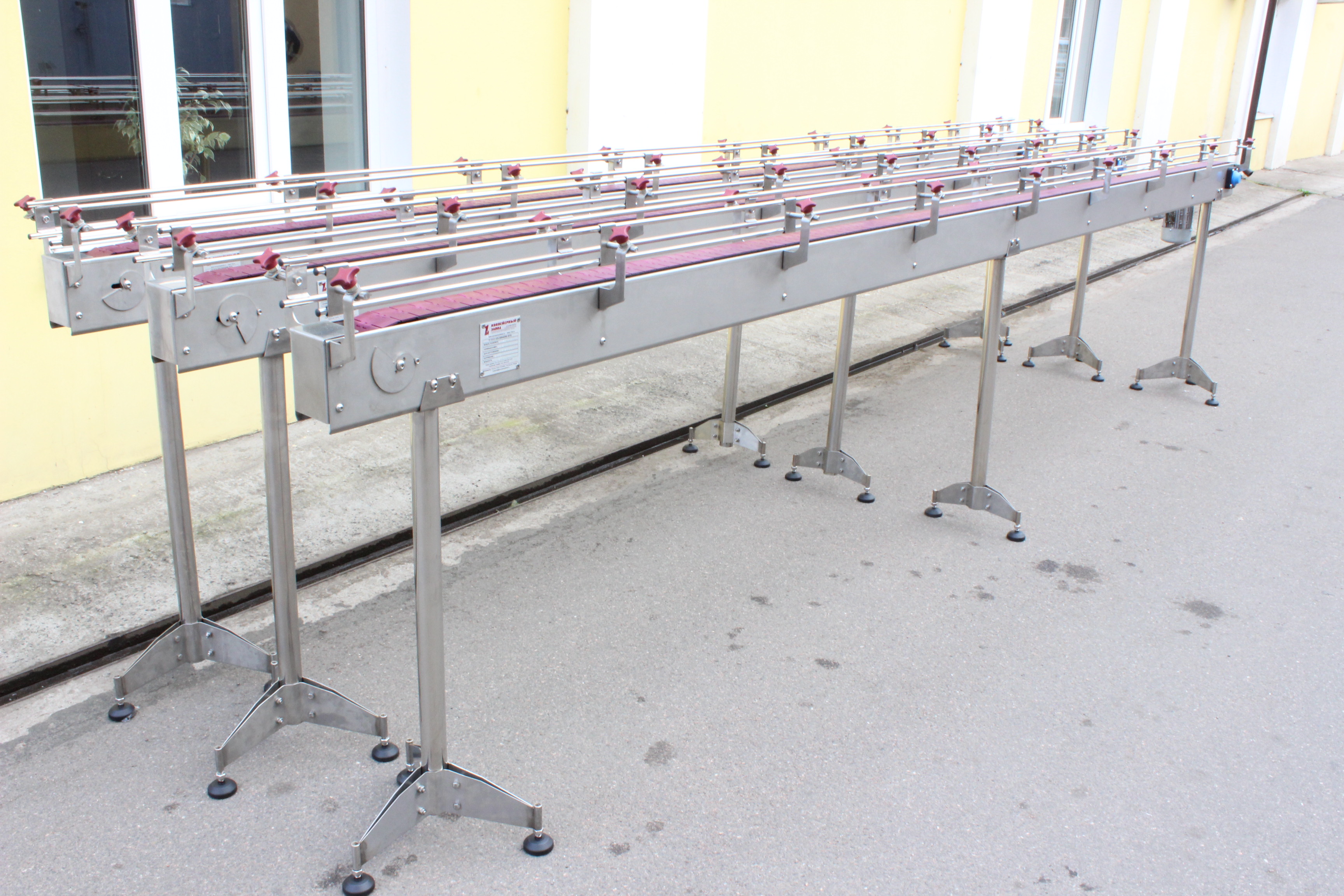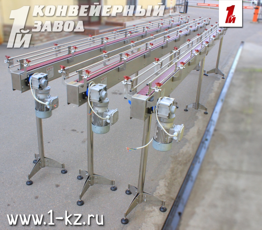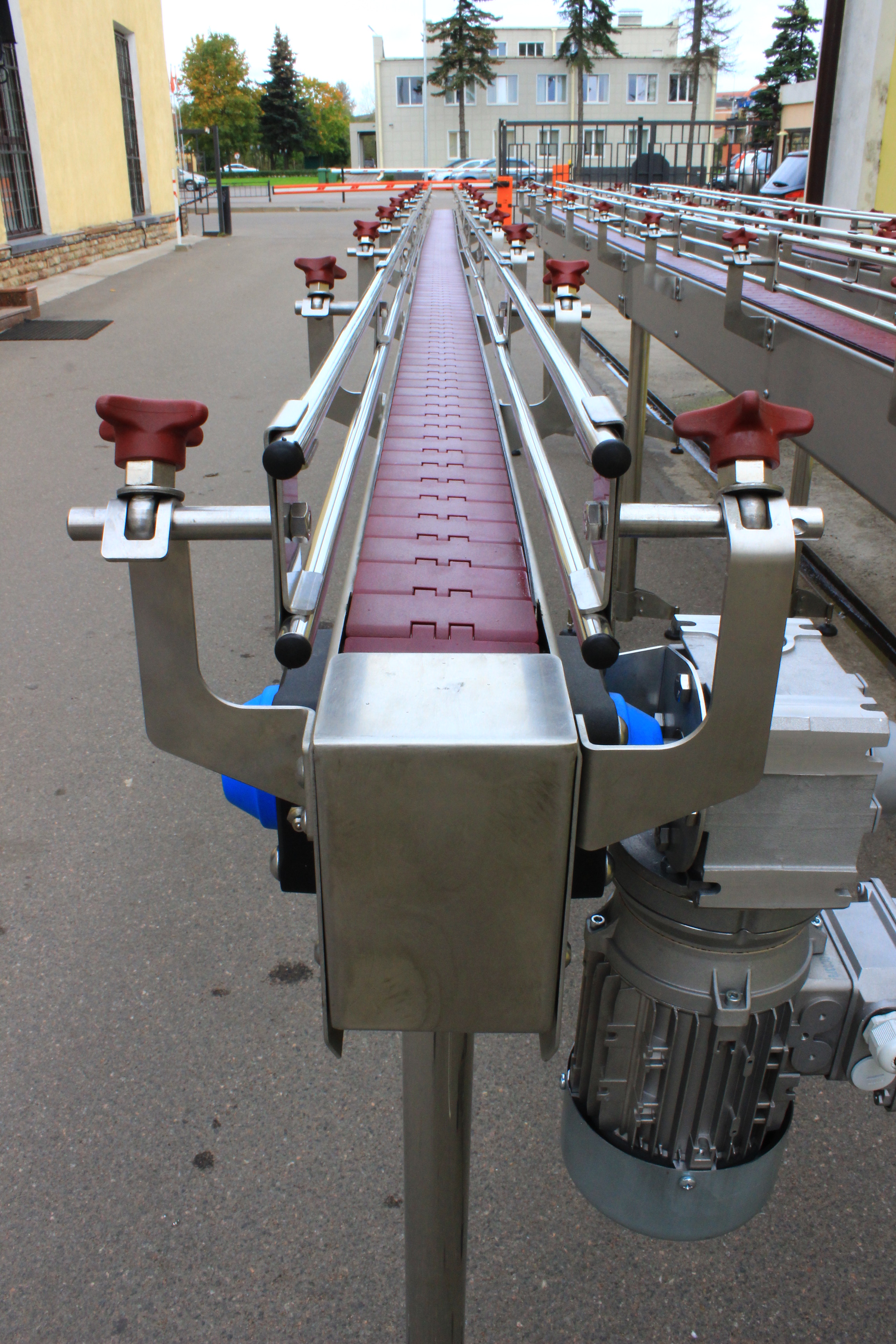 Отгружены 3 пластинчатых конвейера для перемещения стеклянной банки на консервном заводе.Технические данные:длина конвейеров 5000 мм;высота конвейеров 800-1000 мм;ширина цепи 82,5 мм;материал цепи ацетал (фирменный цвет "бордо");кронштейны ограждения, опоры, щеки конвейера - нержавеющая сталь;привод 0,37 кВт (Европа);шкаф управления с частотным преобразователем;
