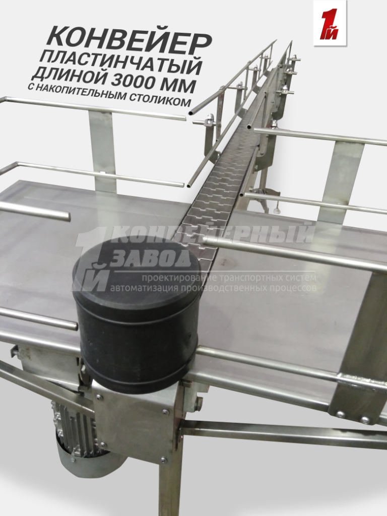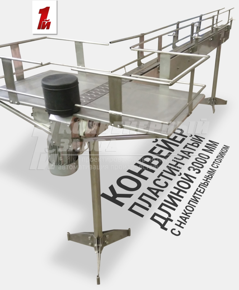 Описание проекта: Изготовлен пластинчатый конвейер с накопительным столом, для перемещения пластиковых емкостей с моющим средством. на конвейер в дальнейшем будет установлен этикетировочный автомат.Длина конвейера - 3000 мм, ширина цепи 82,5 мм (Италия), материал цепи - нержавеющая сталь, высокие кронштейны ограждения из нержавеющей стали, размер стола 800*400 мм, привод 0,37 кВт (Германия), скорость движения цепи - 10 м/мин.