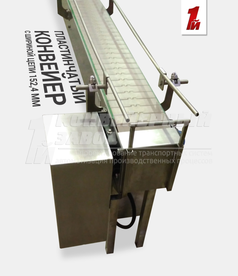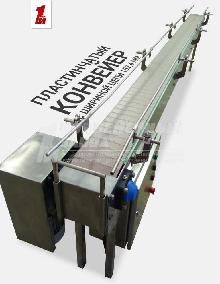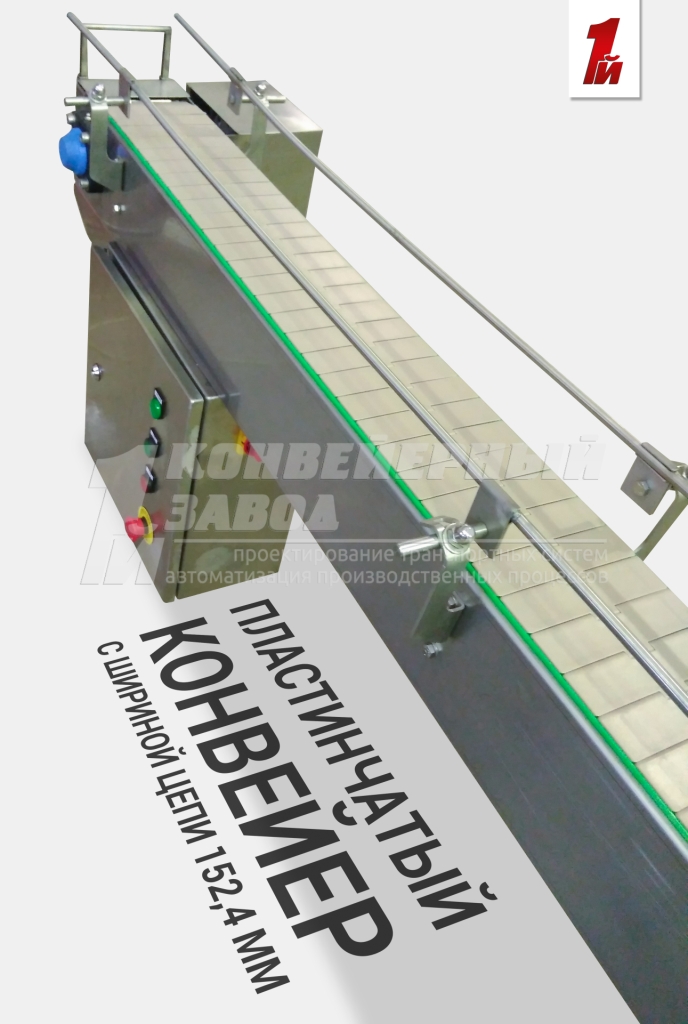 Описание проекта: Изготовлен пластинчатый конвейер с шириной цепи 152,4 мм. Длина конвейера 3000 мм, регулируемые кронштейны ограждения с одинарной трубкой, быстросъемный ограничитель в конце конвейера, шкаф управления из нержавеющей стали во влагозащитном исполнении, привод 0,37 кВт(Европа), скорость движения цепи 24 м/мин.