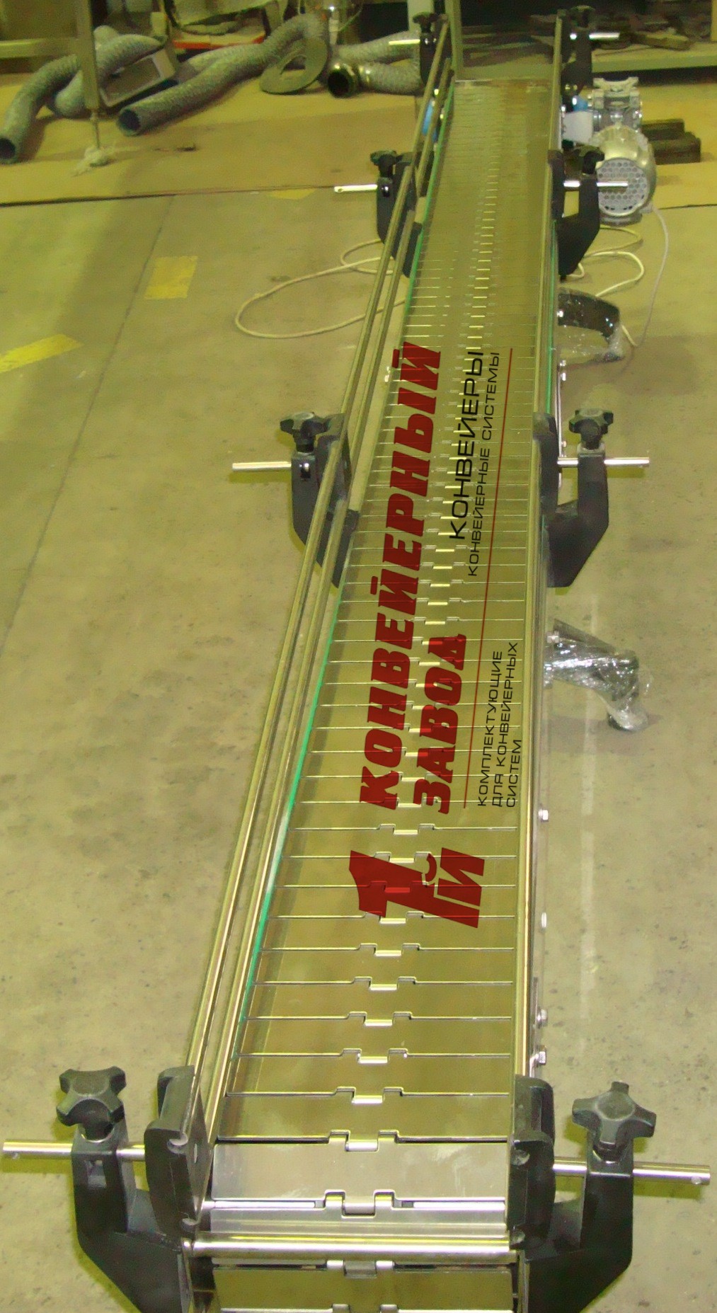 Описание проекта: Изготовлен и готовиться к отгрузке пластинчатый конвейер для перемещения пакета с кормом. Длина конвейера 3000мм, ширина нержавеющей цепи 190,5мм, регулируемые ограждения вдоль конвейера, конвейер изготовлен из пищевой нержавеющей стали.
