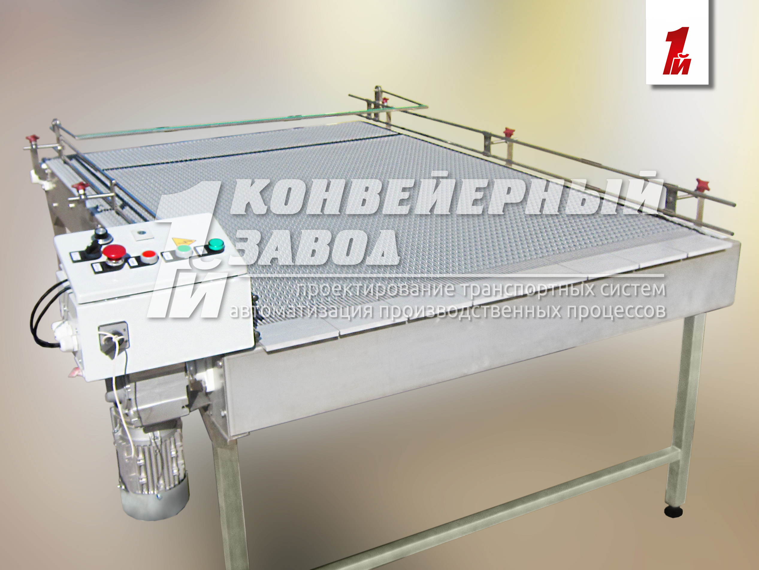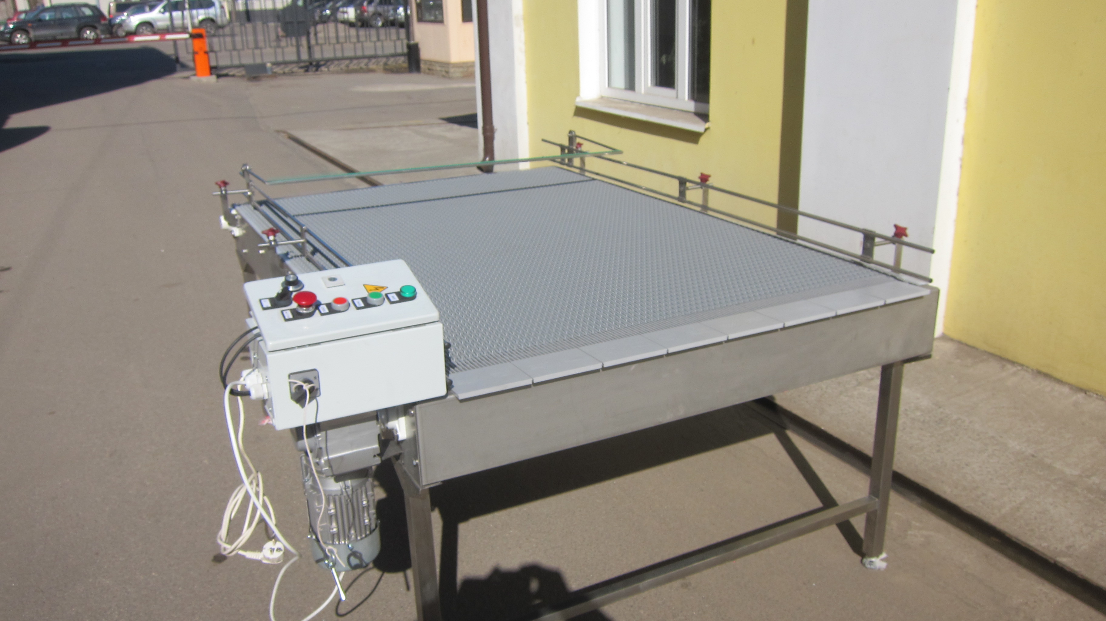Описание проекта: Для крупной европейской компании производящей средства гигиены изготовлен подающий прямоугольный стол с модульной лентой. Стол предназначен для подачи ПЭТ бутылок разного формата и объема на конвейер линии розлива. Движение работы конвейера и перемещения тары контролируется несколькими датчиками, управление и регулировка скорости осуществляется частотным преобразователем в шкафу управления, для плавного перехода тары использована специальная модульная лента с переходными направляющими, длина стола 2000мм, ширина ленты 1300мм. Материал стола - нержавеющая сталь