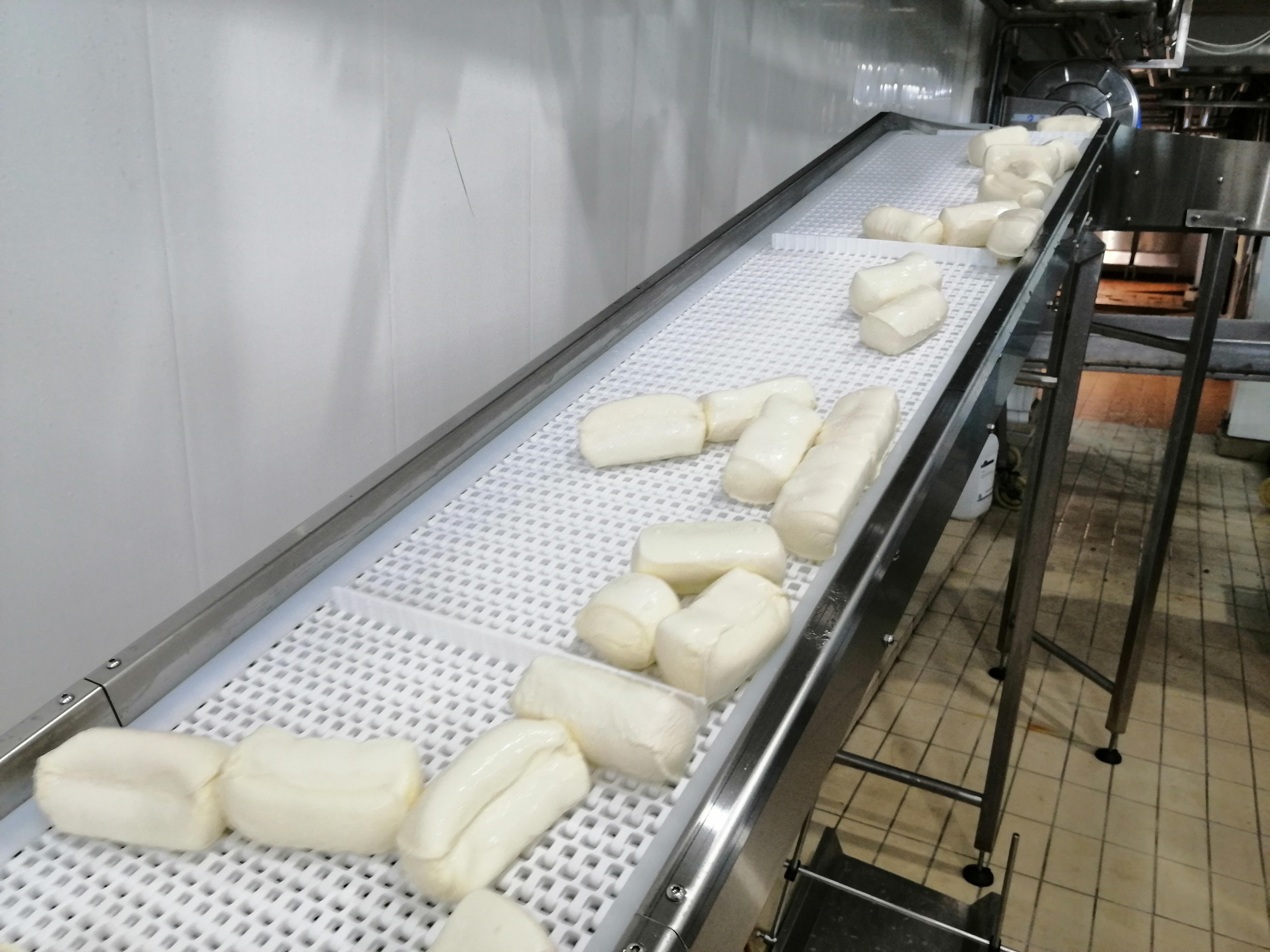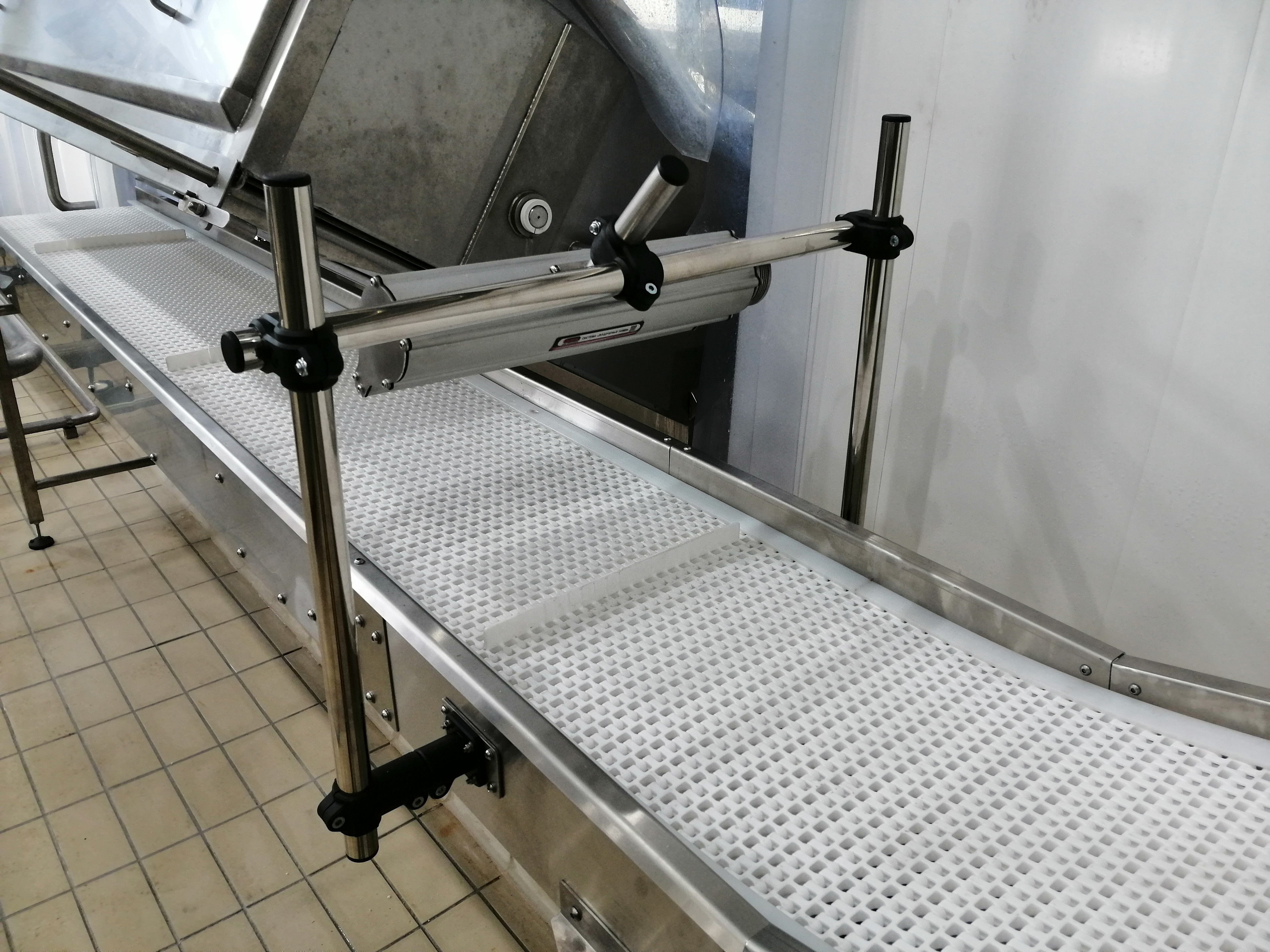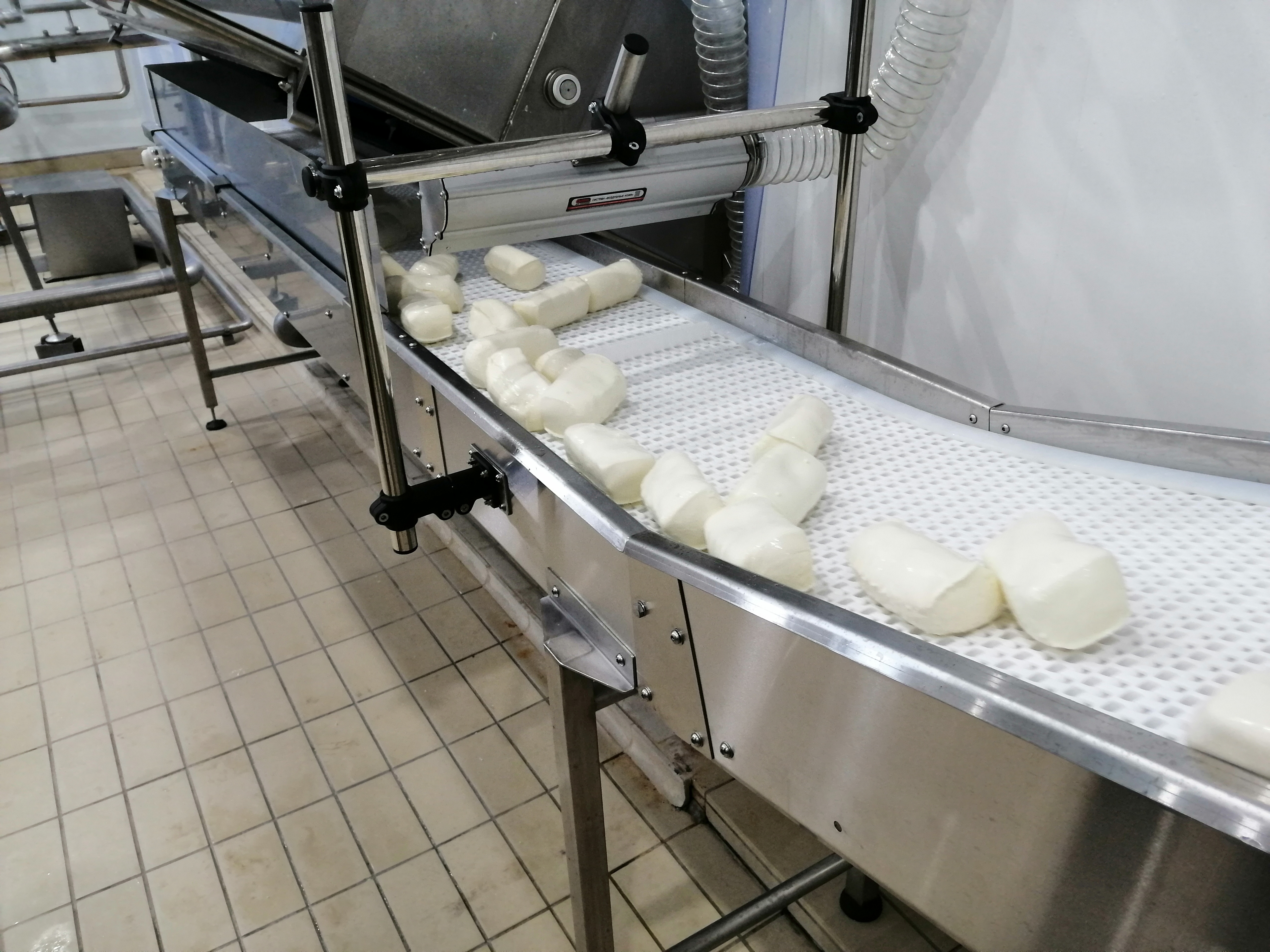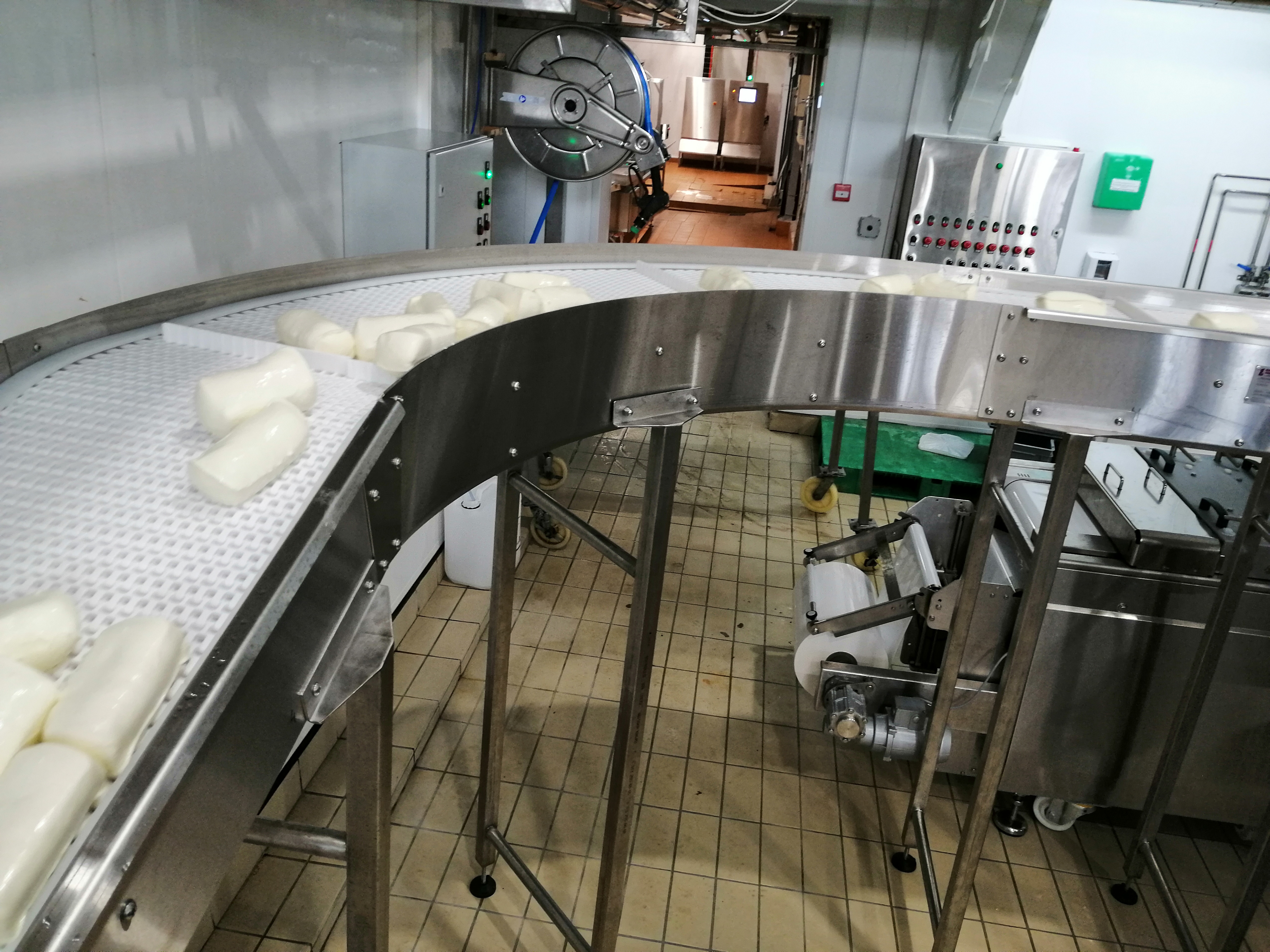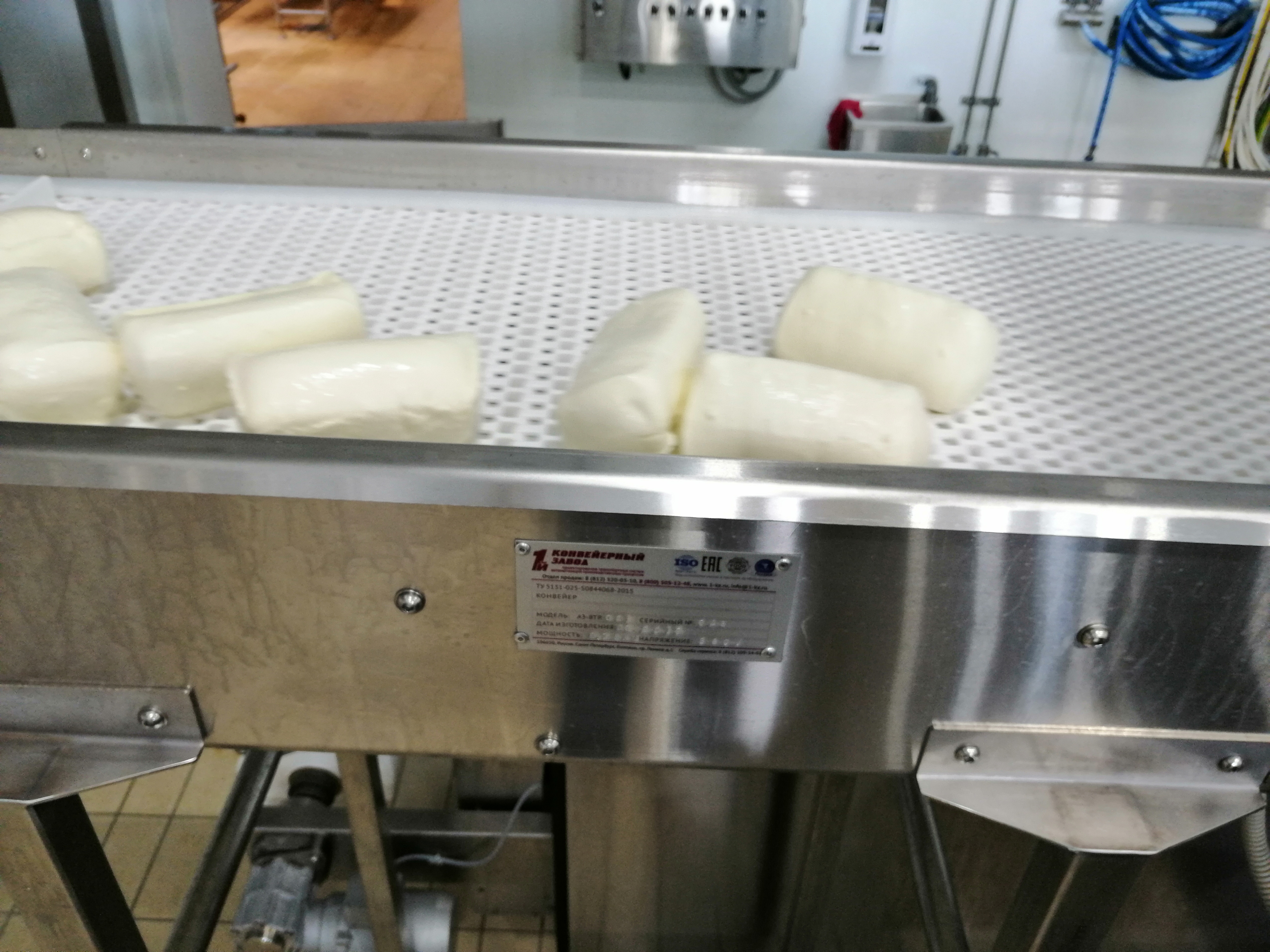 Описание проекта: Для одного из лидеров России по производству сыра, изготовлен подъемный, поворотный конвейер с модульной лентой и лопатками. Сыры разных видов и размеров попадают на конвейер и с помощью Системы Осушения Поверхности Sonic Air Systems (2 воздушных ножа) с их поверхности удаляется влага, после чего сыр поднимается и по склизу перемещается на участок упаковки. Угол подъема составляет 15 градусов, поэтому в модульной ленте предусмотрены лопатки высотой 25 мм по всей ширине ленты. Для регулировки скорости движения ленты и скорости обдува - предусмотрен общий шкаф управления с 2-мя частотными преобразователями. Также автоматика отключает Осушение Поверхности, если на конвейере отсутствует осушаемый продукт (сыр).Общая длина конвейера - около 9 метров, ширина модульной ленты 400 мм, конвейер изготовлен из нержавеющей стали AISI 304.