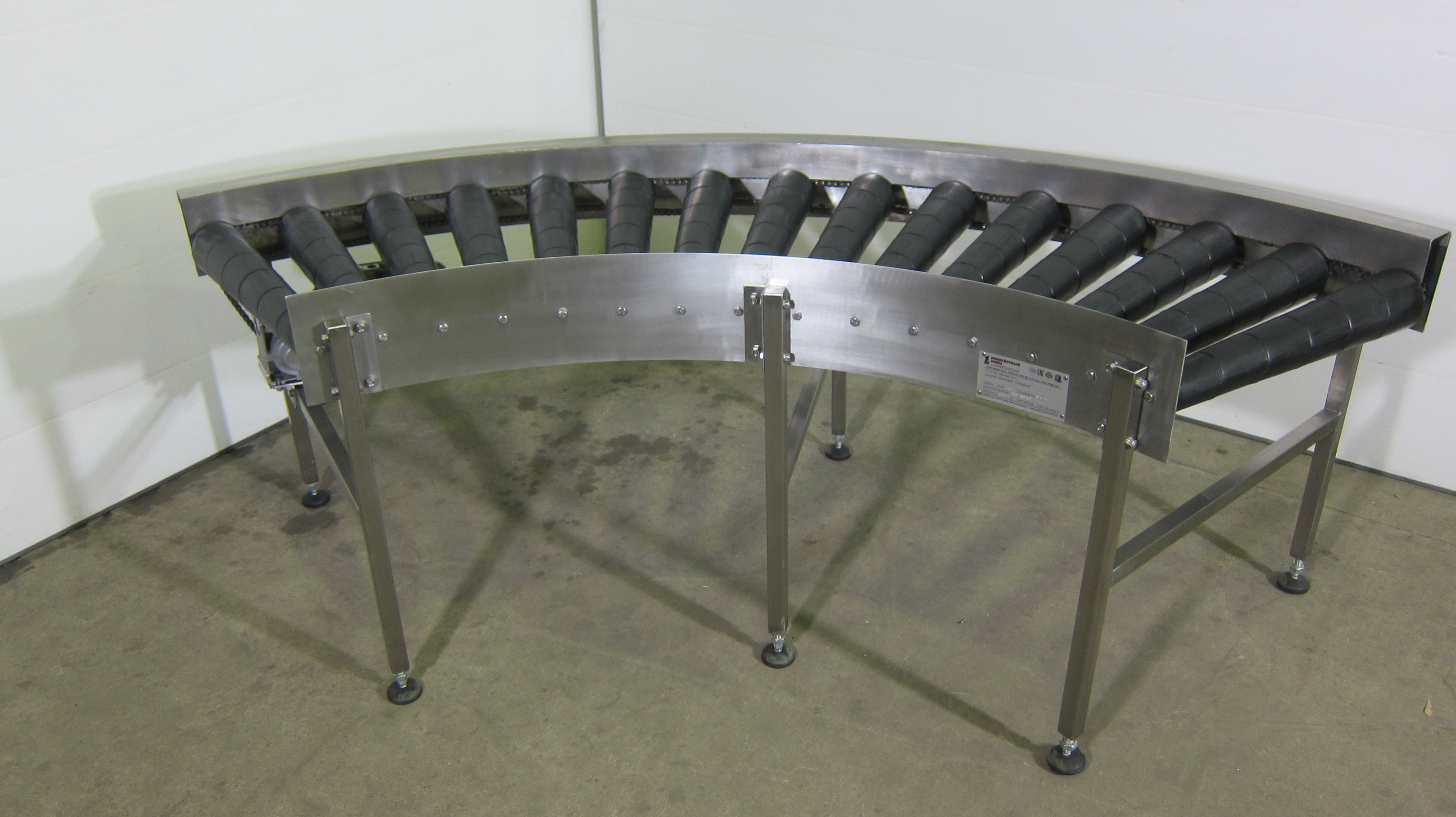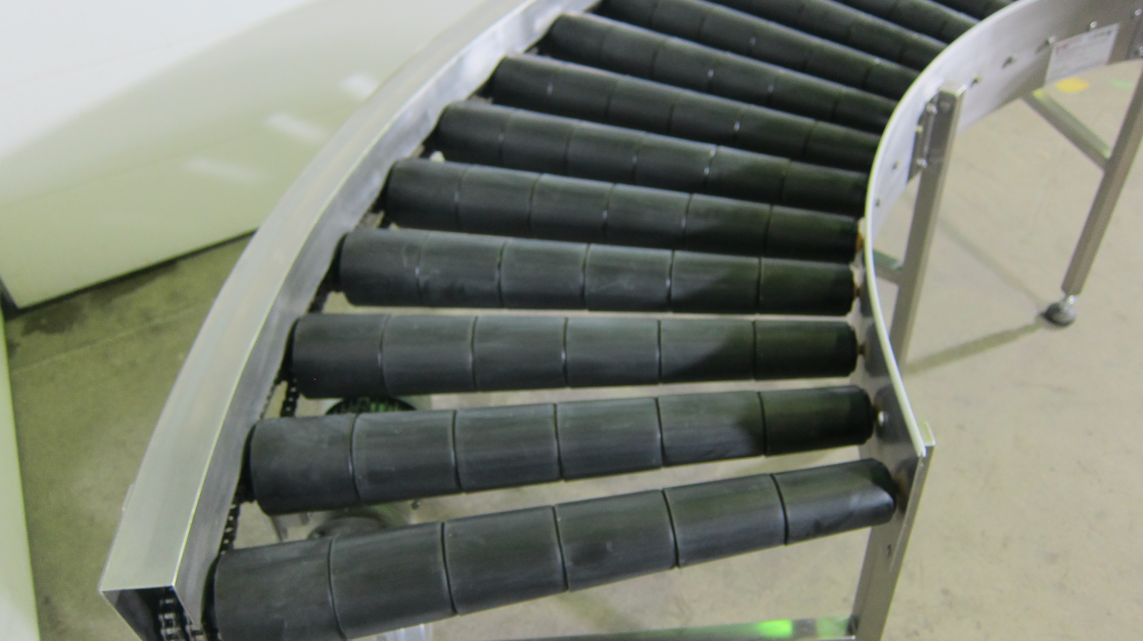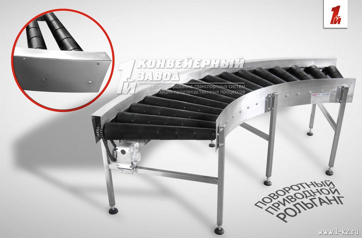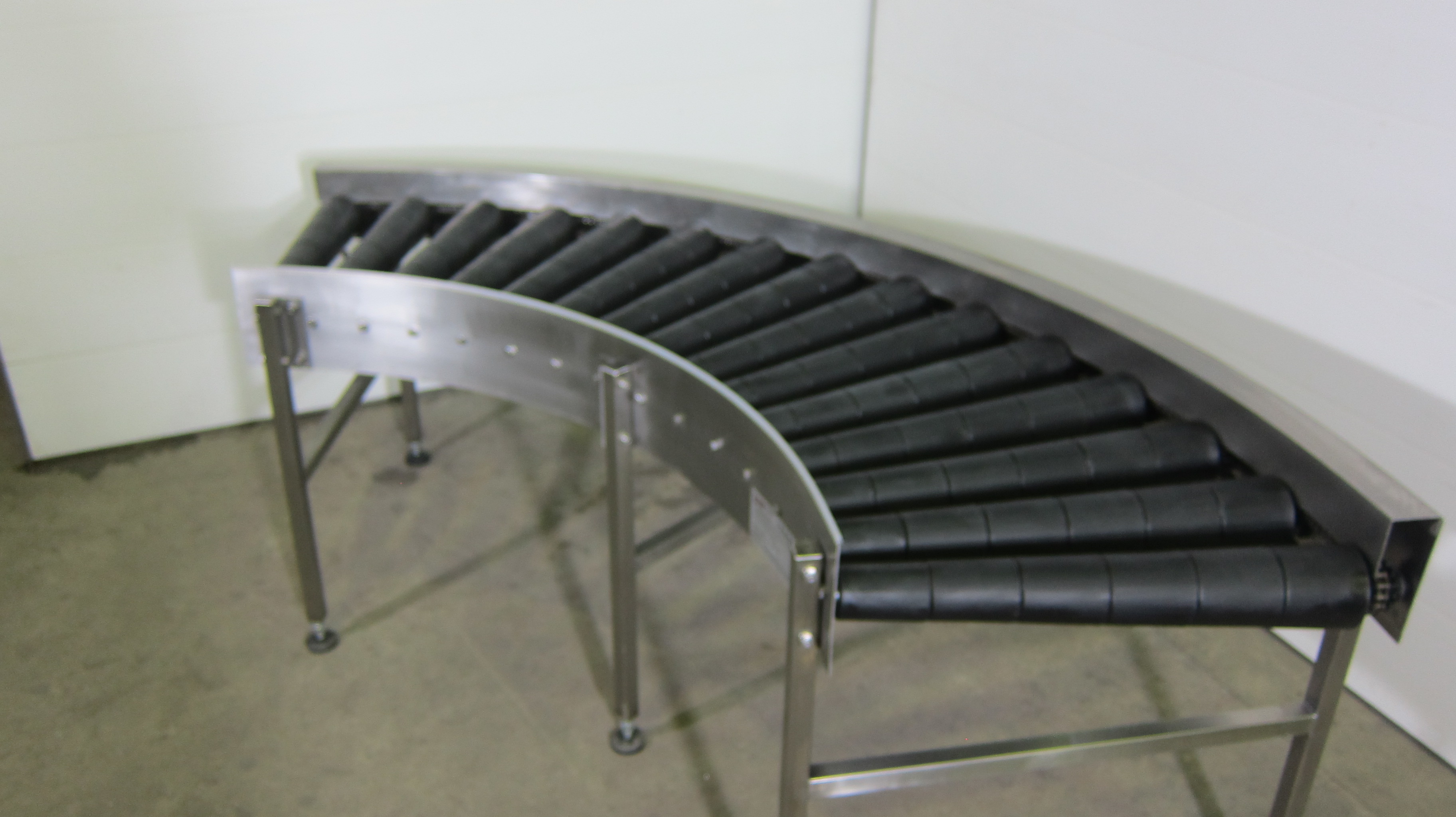 Описание проекта: Для перемещения коробок с продукцией, изготовлен приводной поворотный рольганг на 90°. Материал конструкции рольганга - нержавеющая сталь, материал роликов наборные пластиковые сегменты на металлической основе, ролик - конический с двумя звездочками, длина ролика 590мм, высота рольганга - 700мм, привод мотор-редуктор (Германия), под рольгангом, скорость вращения роликов 18 м/мин.Это уже второй рольганг, изготовленный для этого заказчика.