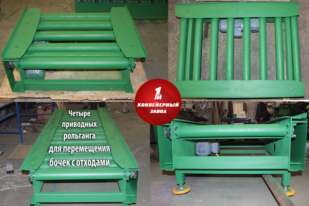 Описание проекта: Изготовлены 4 приводных рольганга для перемещения бочек с отходами производства. Длина рольгангов от 740мм до 2750мм, длина роликов 580мм, диаметр роликов 76мм, перемещаемый груз бочки - 400кг, материал рольганга - углеродистая сталь с порошковой окраской по RAL 6005, приводы SeW Eurodrive с тормозом, реверсивное движени