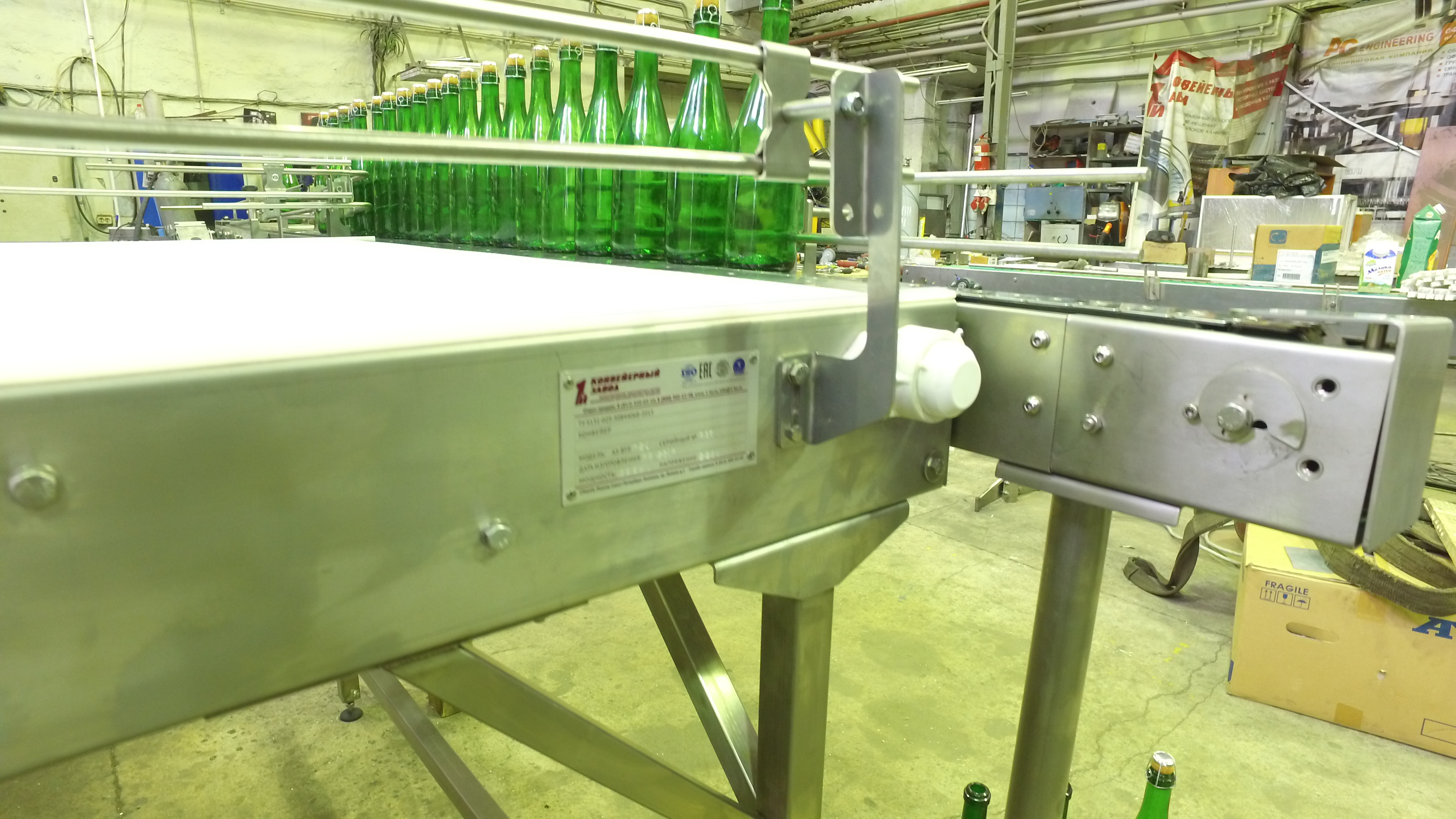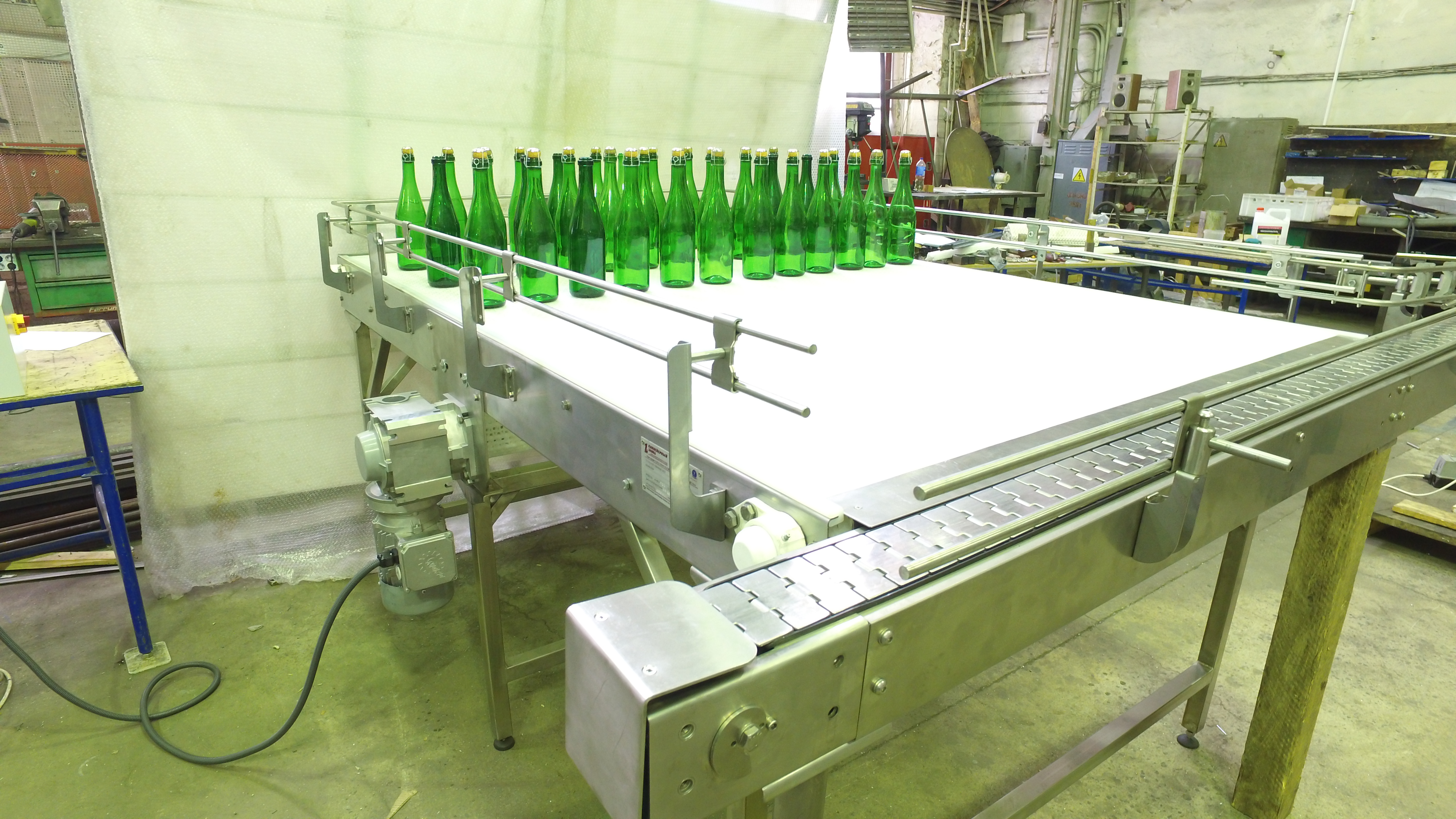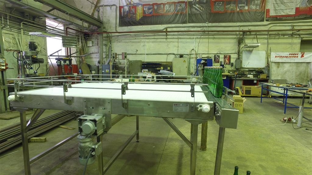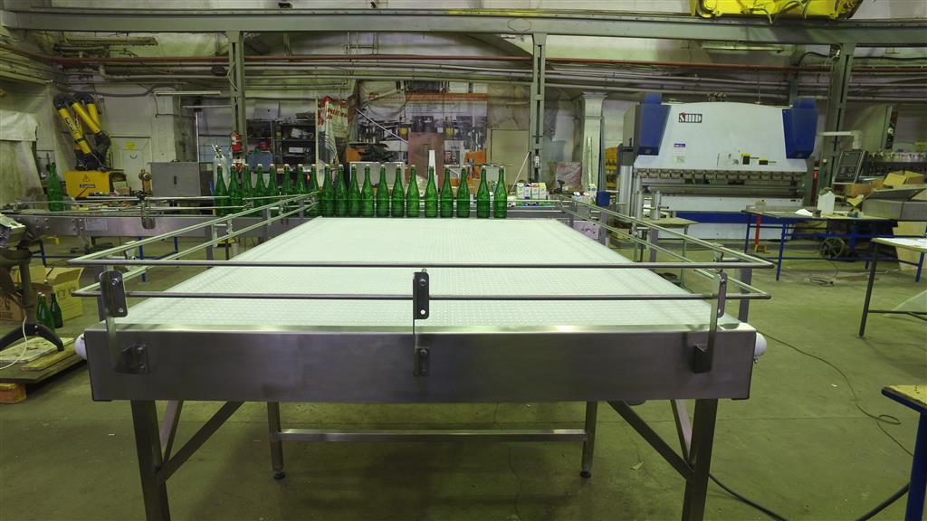 Описание проекта: Изготовлен стол подачи пустых бутылок на конвейерную линию. Автоматический деппалетайзер выставляет несколько рядов стеклянных бутылок на стол подачи, а стол в автоматическом режиме медленно выдает бутылки на конвейер. Материал стола - нержавеющая сталь, Длина стола - 2200 мм, ширина - 1400 мм, материал тягового элемента - пластиковая модульная лента, привод: мотор-редуктор (Германия), скорость движения 1-3 м/мин, шкаф управления с частотным преобразователем, боковые ограждения стола высотой 150 мм.