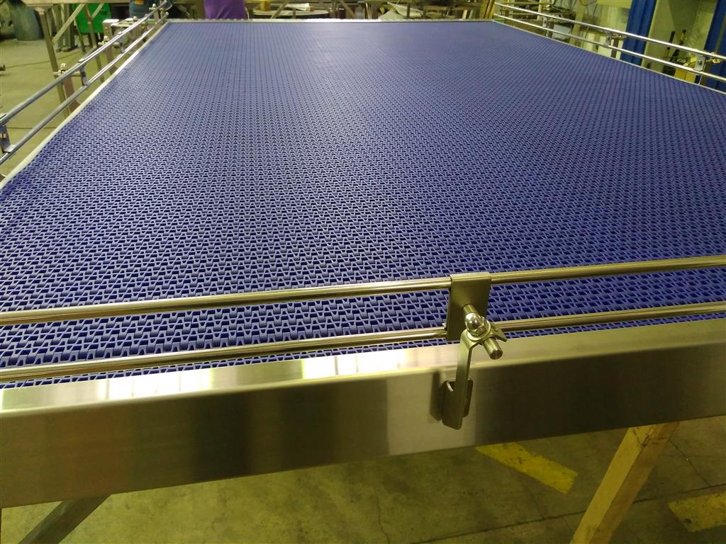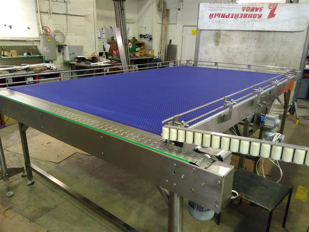 Описание проекта: Для производителя ЛВИ, изготовлен разгрузочный/накопительный стол для бутылок с шампанским. Стол встраивается в линию розлива и служит для отведения и накопления бутылок до 5 минут.основные данные стола:* Длина стола 3000мм* Ширина стола 1800мм* Высота стола 1050мм* Материал стола - нержавеющая сталь* Материал ленты - пластик, модульная, полипропилен (Швейцария)* Емкость бутылок - 500-600* Пластинчатый конвейер (разгонный) длиной 2500мм* Роликовая направляющая* Реверсивное движение* Автоматика и шкаф управления (датчики, алгоритм работы, инвертер)* мотор-редуктор (Германия)