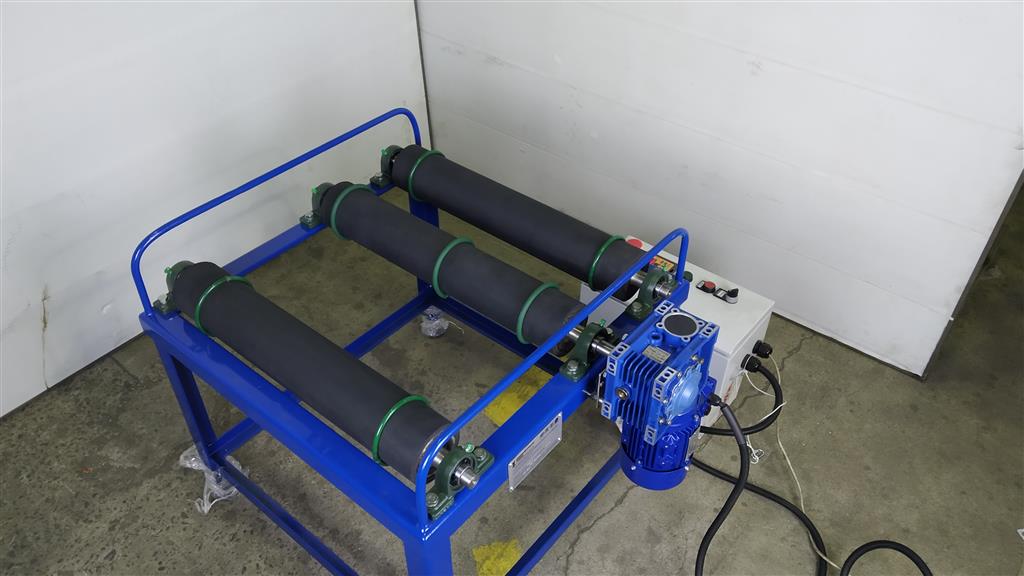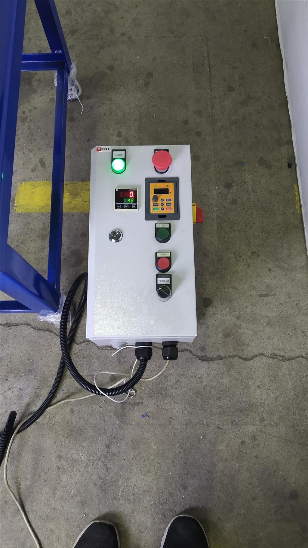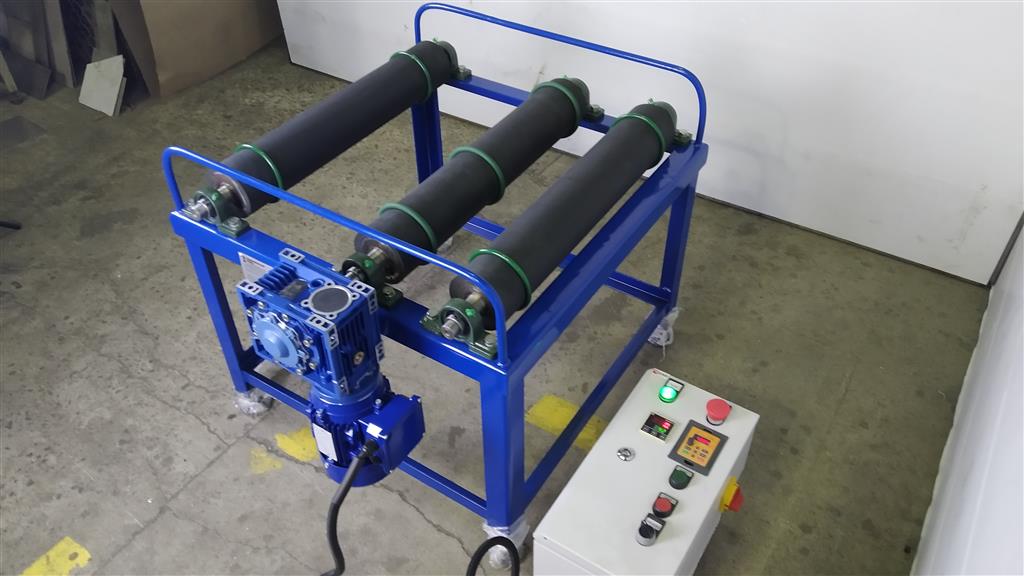 Описание проекта: Роликовая мельница (рольганг) предназначена для измельчения минерального и нерудного сырья путем вращения попеременно двух барабанов, установленных на роликах.Роликовая мельница работает с барабанами разных размеров. Диаметр от 409 до 180 мм, вес от 12 до 40 кг.Рама роликовой мельницы сделана из углеродистой стали Ст3 с толщиной 2 мм с порошковой окраской.Роликовая мельница имеет следующие параметры:рабочую длину ролика, мм: 600 ± 0,5 %;две П-образные стальные ручки для переноса закрепленные на раме по бокам, окрашенные порошковой окраской;диаметр роликов, мм: 108± 0,5 %;материал ролика - углеродистая сталь, прорезиненный резиной;привод на центральный ролик через мотор-редуктор;частотный преобразователь в шкафу управления;таймер для контроля времени измельчения.скорость вращения приводного ролика - 53 об/мин;Шкаф управления роликовой мельницей:сделан из углеродистой стали, с порошковой окраской.возможность крепится к стене;закрывается ключом;отображает на лицевой панели частоту вращения ролика в об/мин на цифровом дисплее;отображает на лицевой панели общее время измельчения с возможностью программировать время измельчения на дисплее;имеет кнопку аварийной остановки мельницы;имеет кнопку включения работы мельницы;