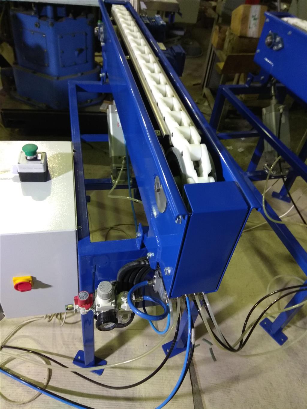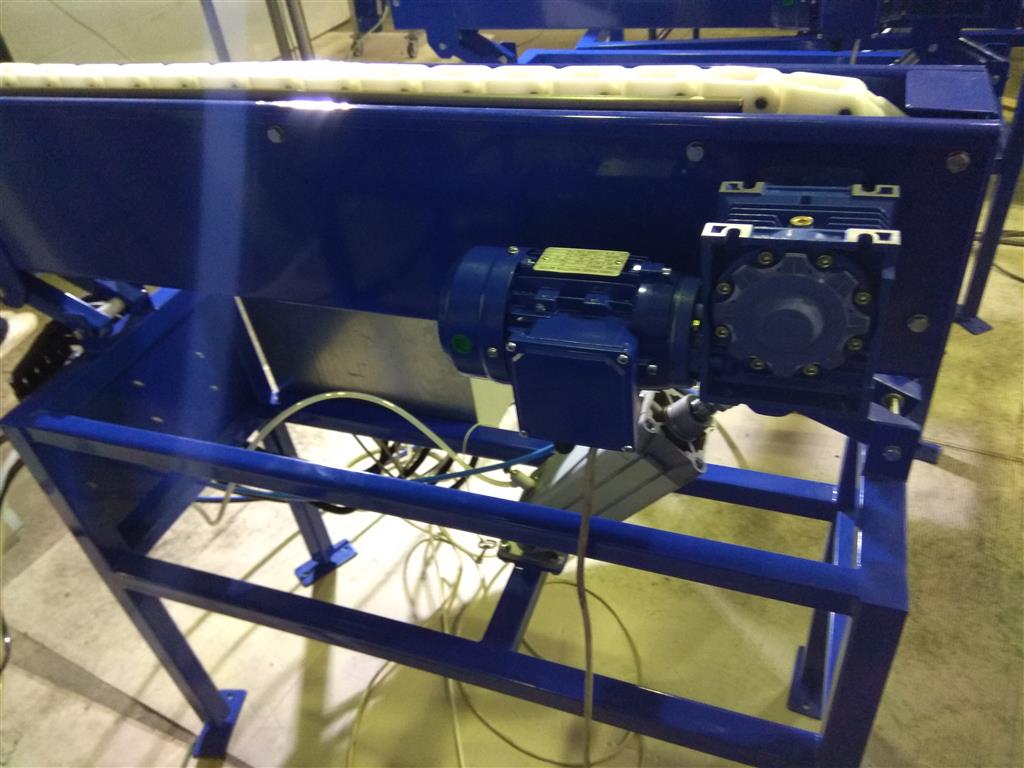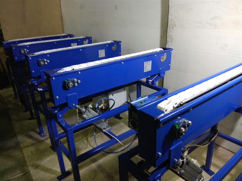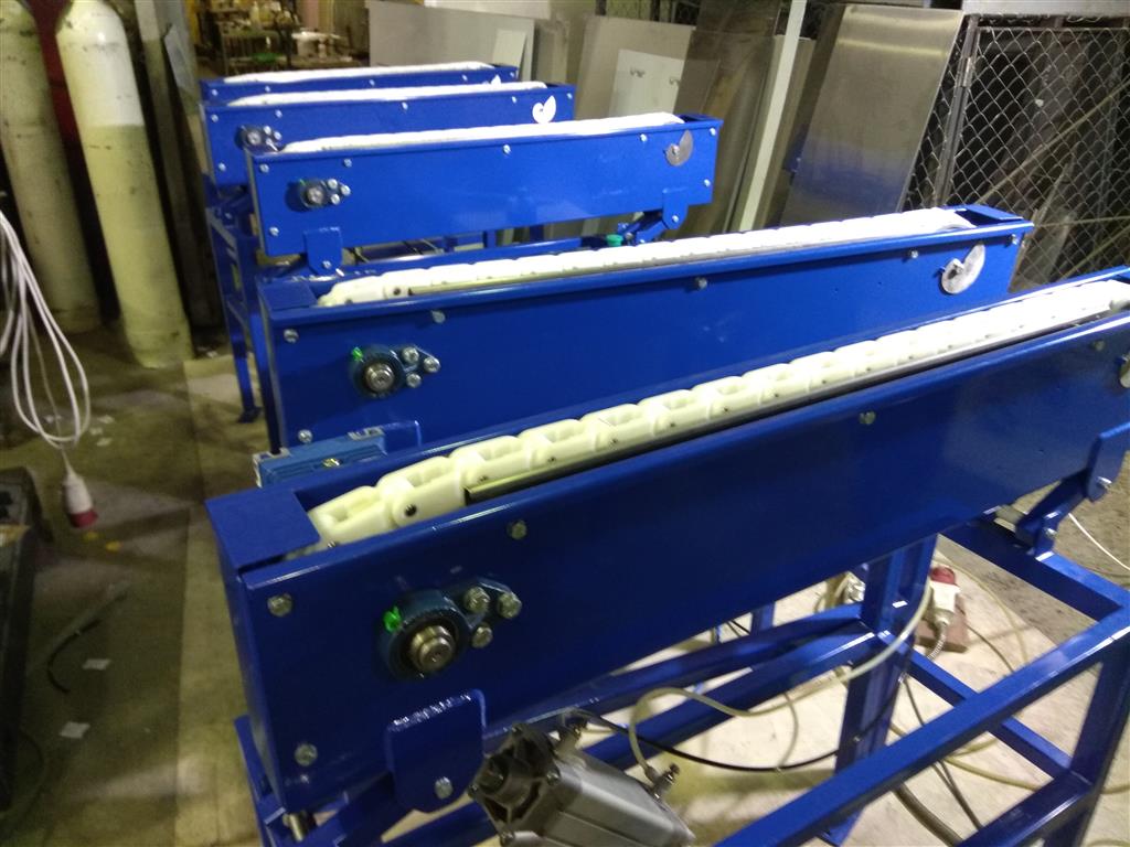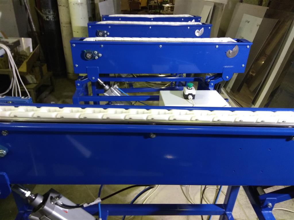 Описание проекта: Изготовлена и отгружена система конвейеров для отбраковки панелей. Данное оборудование будет смонтировано на существующем рольганге Покупателя и предназначено для автоматического или ручной отбраковки панелий, которые перемещаются по нему путем подъема и направления панели в сторону.В состав системы входят:5 конвейеров с ящичной цепью и пневмоцилиндрами, длиной 1 метр;основание конвейеров - рамная конструкция;воздухоподготовка (шланги, фиттинги, распределители и т.д.);Шкаф управления с контроллером;Материал изготовления - углеродистая сталь с порошковой окраской (синий цвет)