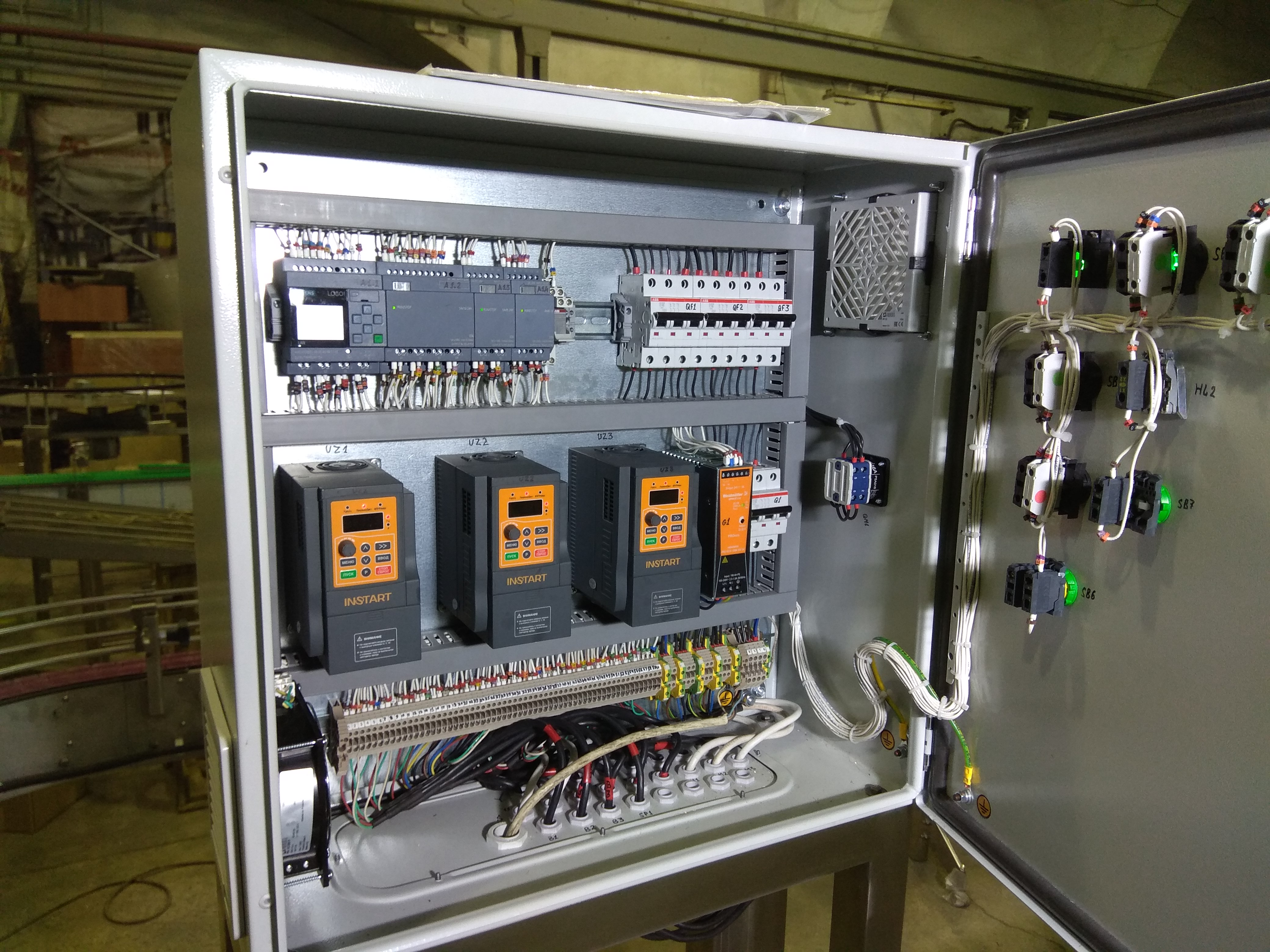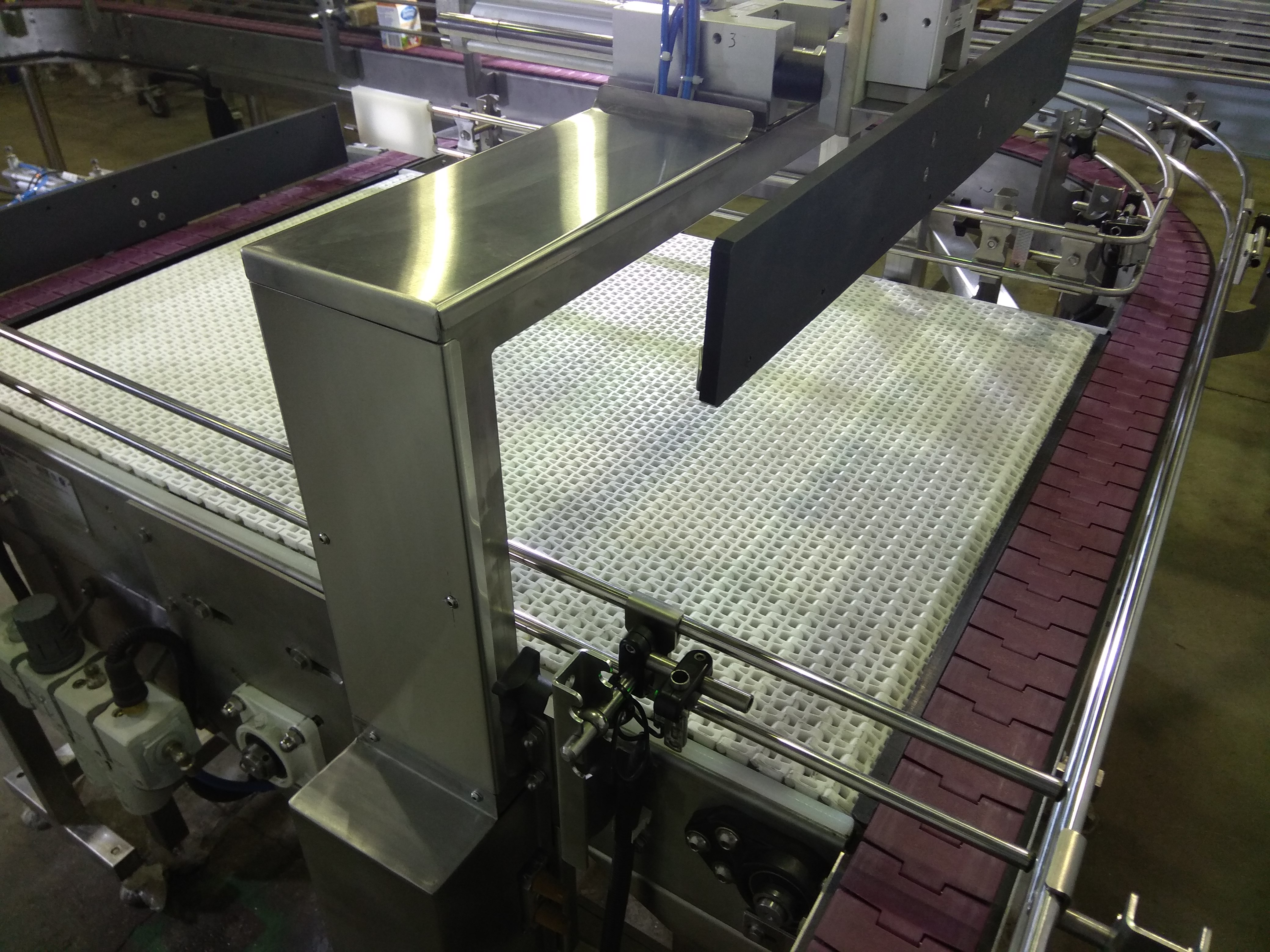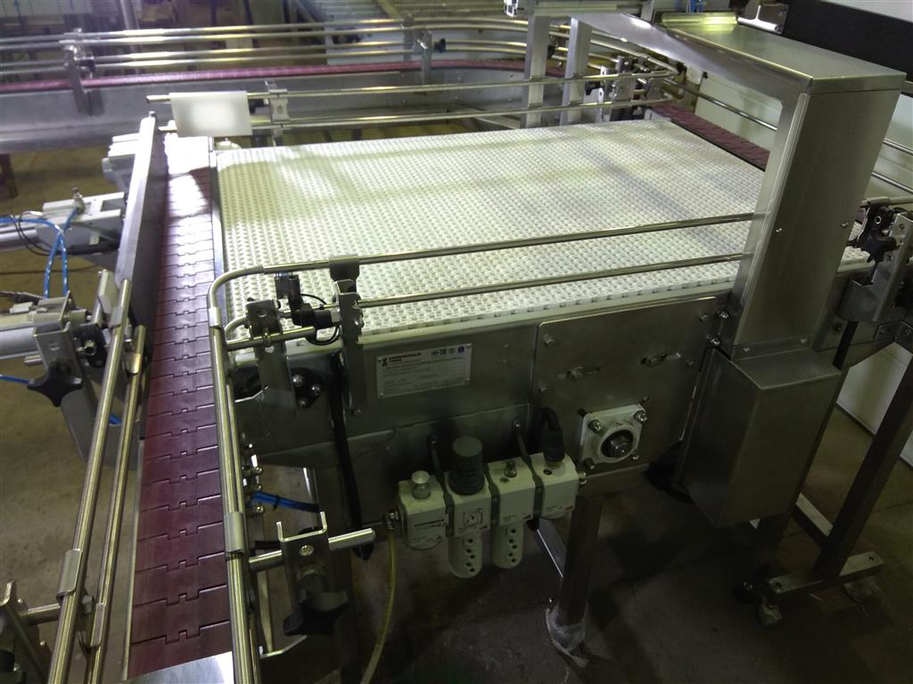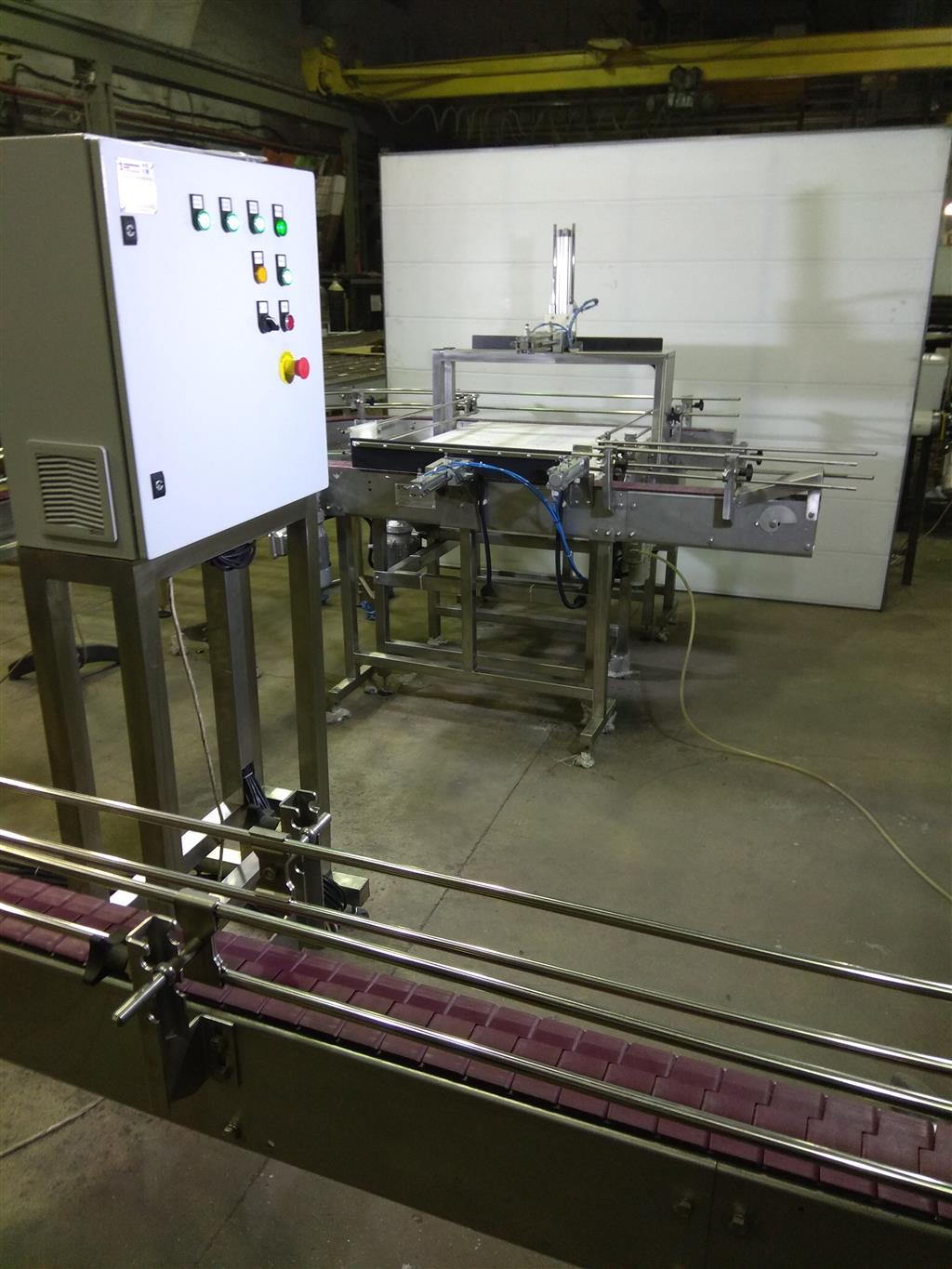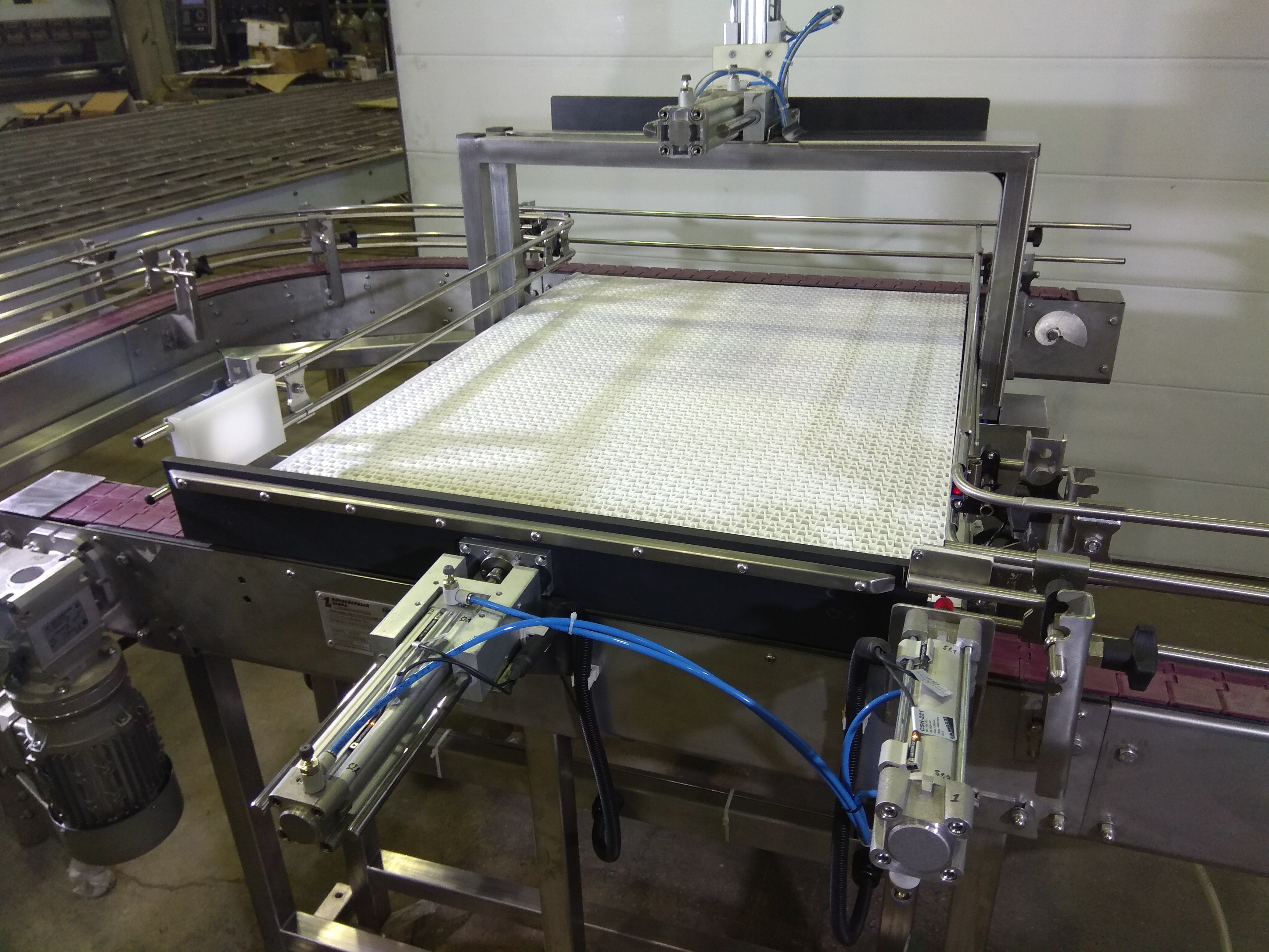 Описание проекта: Для производителя молочной продукции в Ленинградской области, спроектирована, изготовлена и отгружена система конвейеров с автоматикой.Состав оборудования:1. Прямой пластинчатый конвейер длиной 1400 мм, ширина цепи 82,5 мм (пластик)2. Конвейер с модульной лентой длиной 1200 мм, шириной 800 мм (пластик)3. Поворотный пластинчатый конвейер длиной 6700 мм, ширина цепи 82,5 мм (пластик)4. Автоматика, которая включает в себя: 3 пневмоцилиндра, 4 датчика с отражателями, шкаф управления с 3-ми инверторами и программой работы.Данное оборудование предназначено для перемещения пакетов с молоком от розлива к упаковочному автомату в 2-х режимах работы.В нормальном режиме, пакеты с молоком выстраиваются в ряд по 9 шт. на пластинчатом конвейере и по команде от датчиков, пневмоцилинд сдвигает ряд на конвейер с модульной лентой, откуда этот ряд перемещается с помощью другого пневмоцилиндра на поворотный пластинчатый конвейер.В режиме накопления (в случае остановки упаковочного автомата на непродолжительное время), пакеты с молоком попадающие на конвейер с модульной лентой, накапливаются на нем рядами через 100-150 мм.Все конвейеры изготовлены из нержавеющей стали, мотор-редукторы (Германия), пластинчатые цепи (Италия), модульная лента (Швейцария)